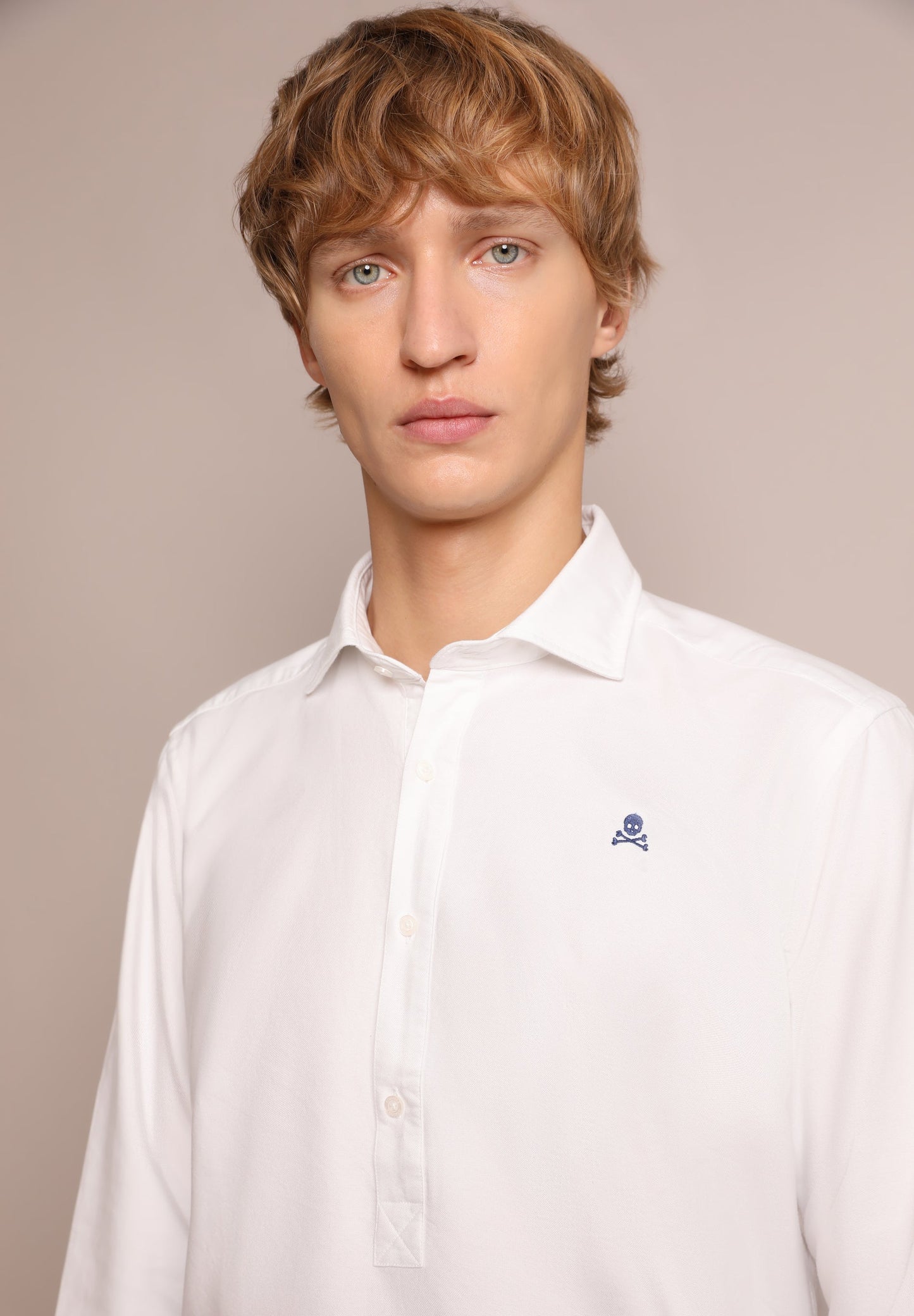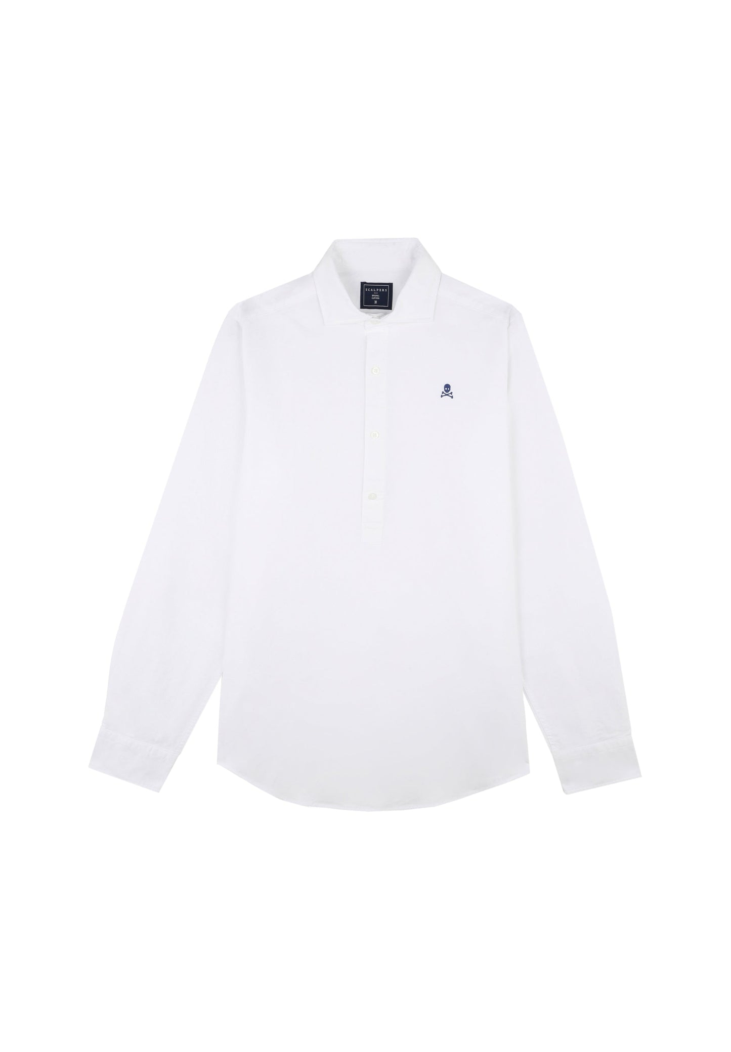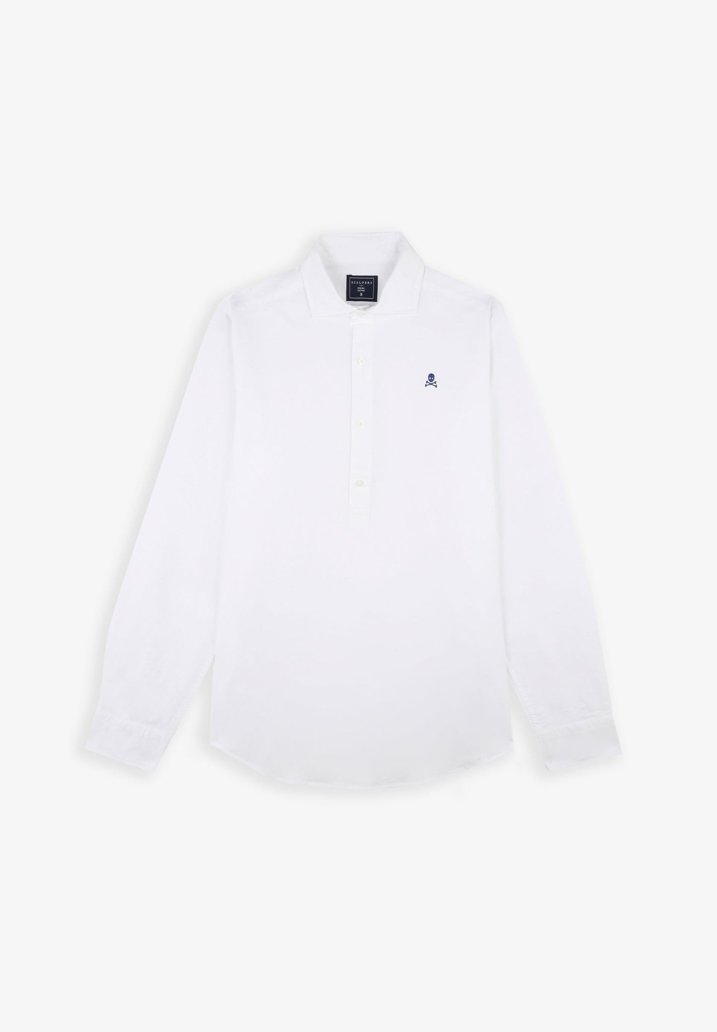 Camisa estilo polera confeccionada en tejido 100% Algodón. Corte Regular Fit, cuello siena y cierre con botones. Manga larga terminada en puño simple. Presenta como detalle la calavera a contraste.