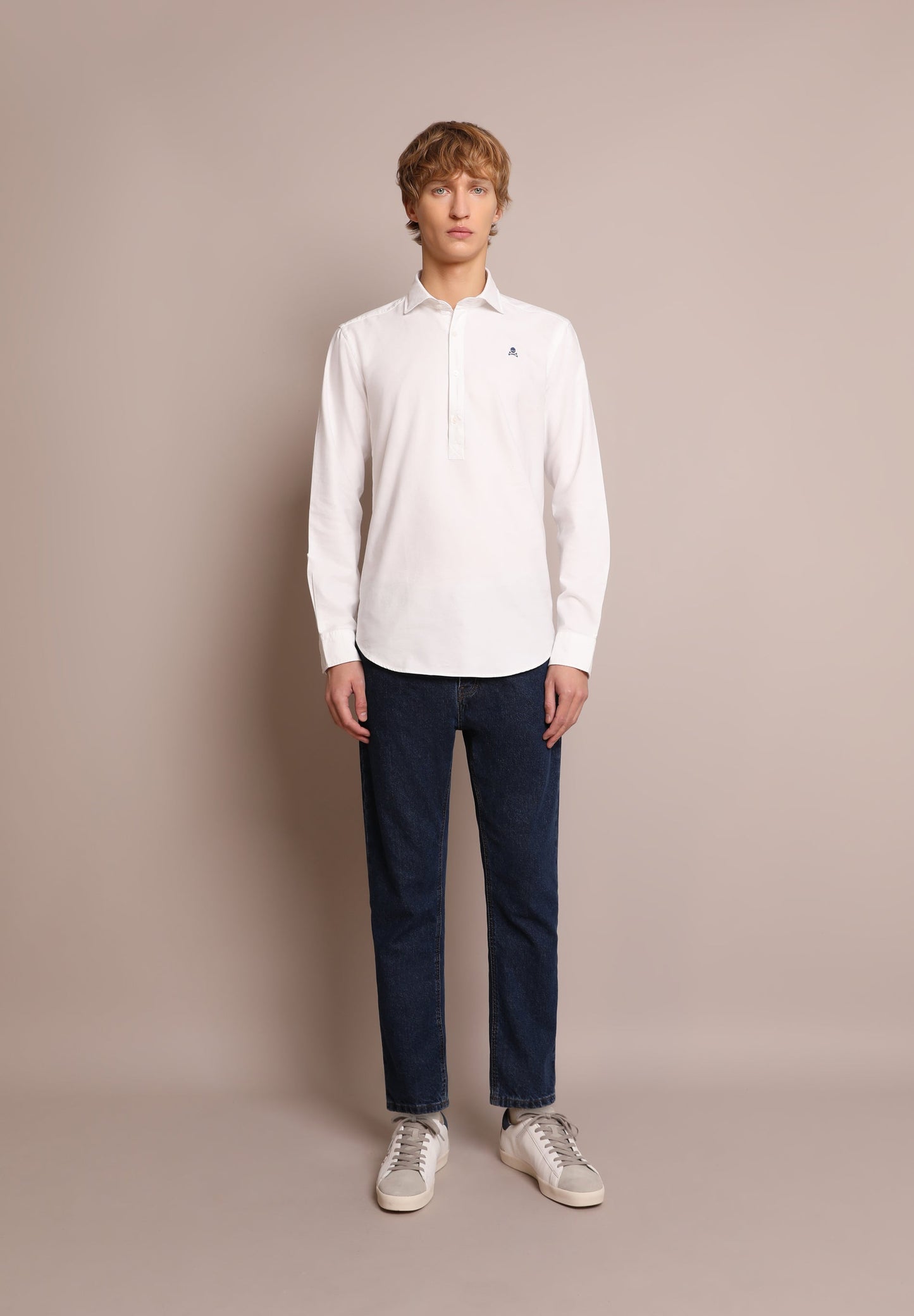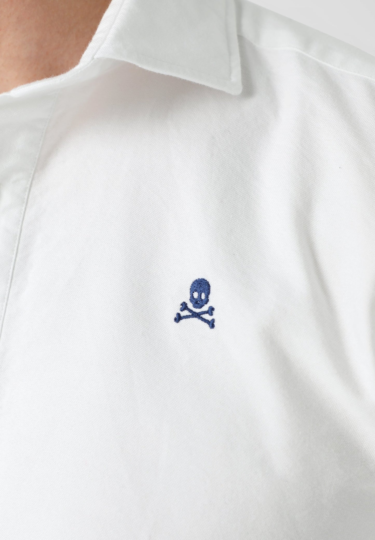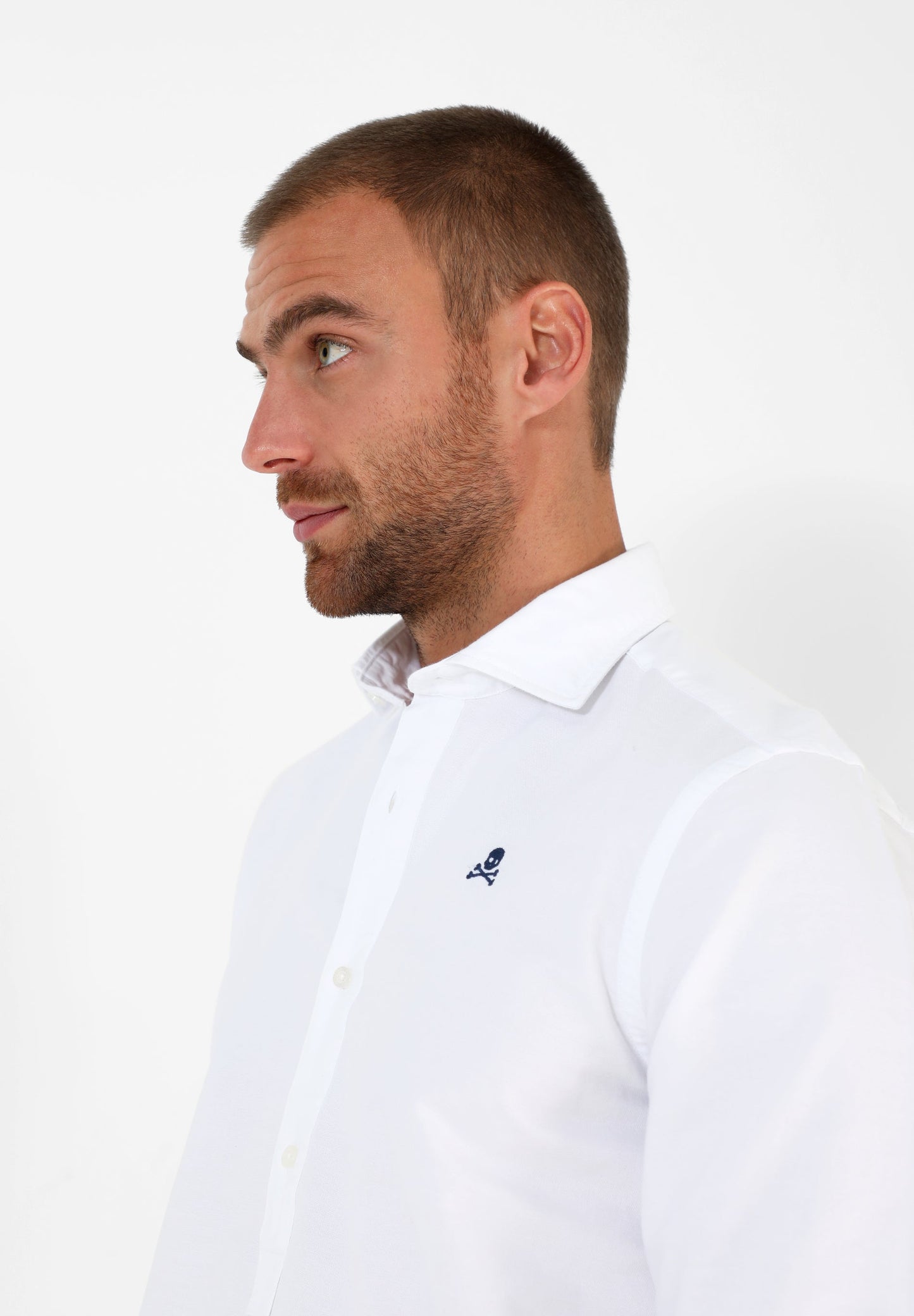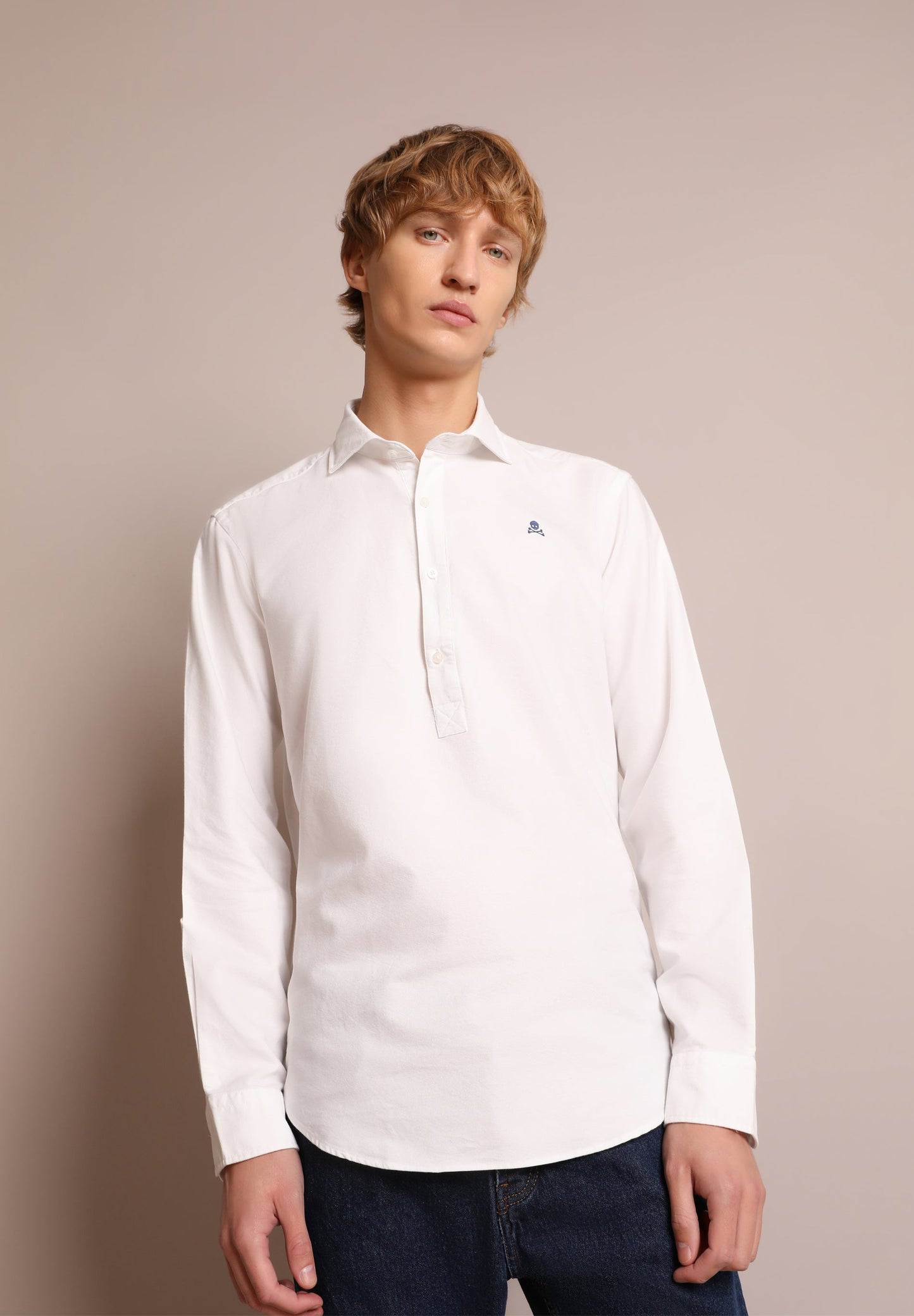 Camisa estilo polera confeccionada en tejido 100% Algodón. Corte Regular Fit, cuello siena y cierre con botones. Manga larga terminada en puño simple. Presenta como detalle la calavera a contraste.