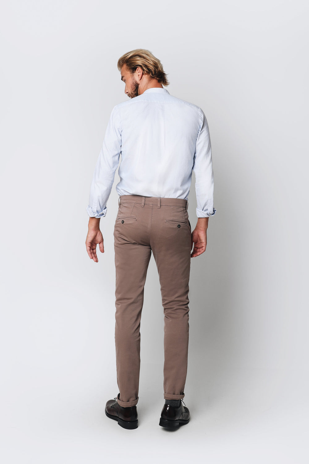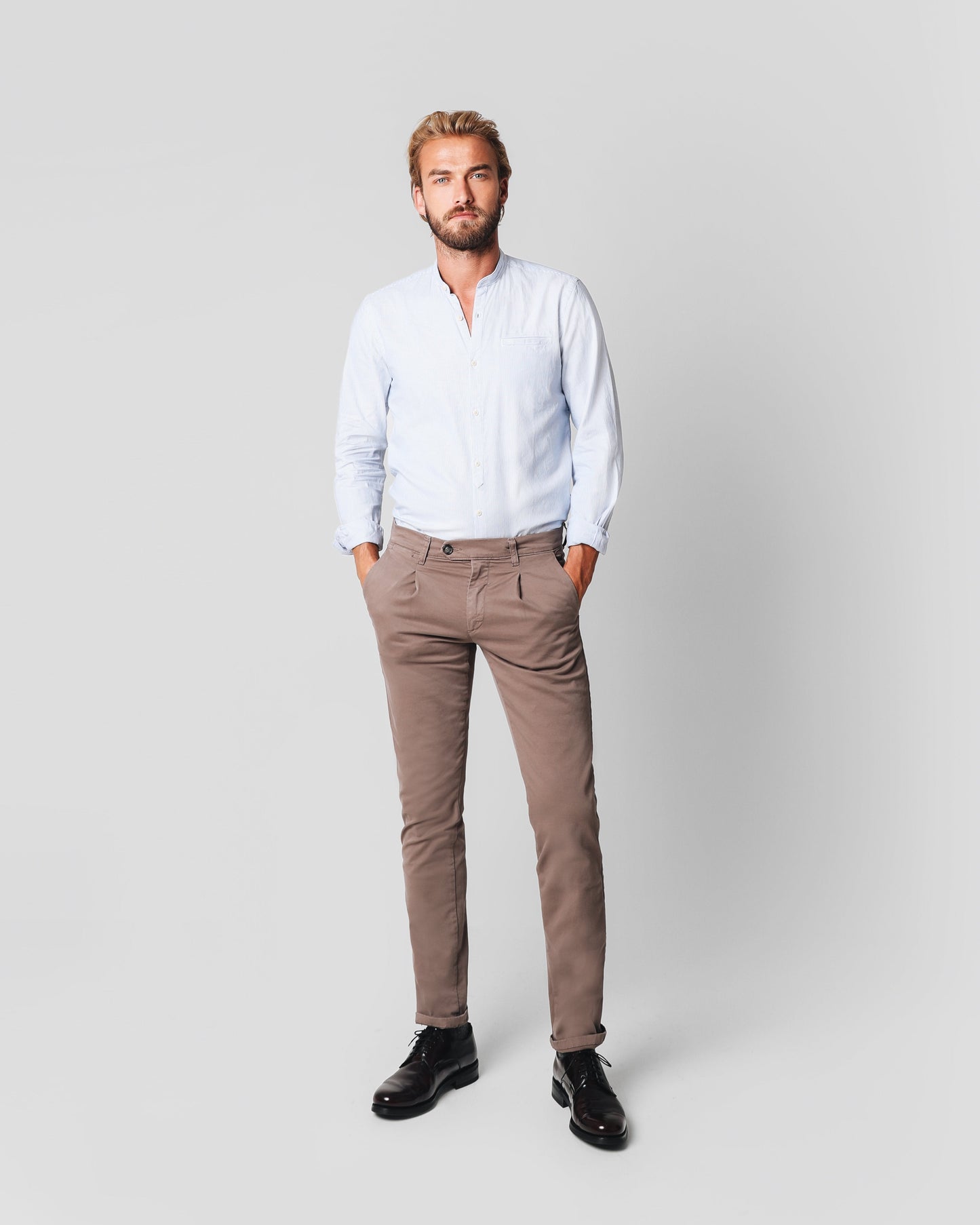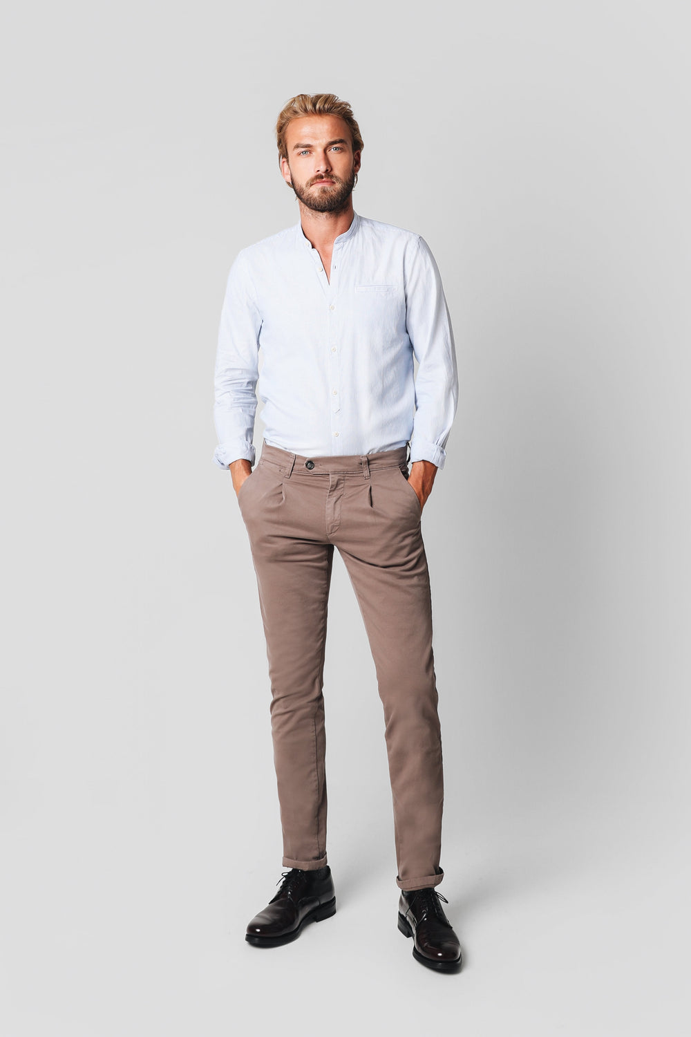 Pantalón de pinzas de corte slim fit. Cierre con botón y cremallera, trabillas y bolsillos.
