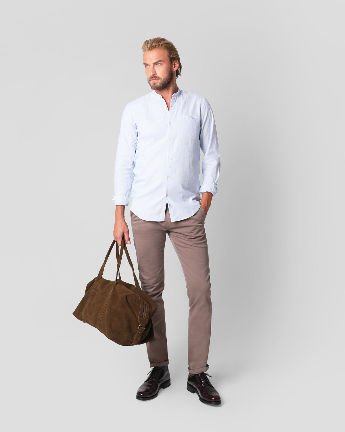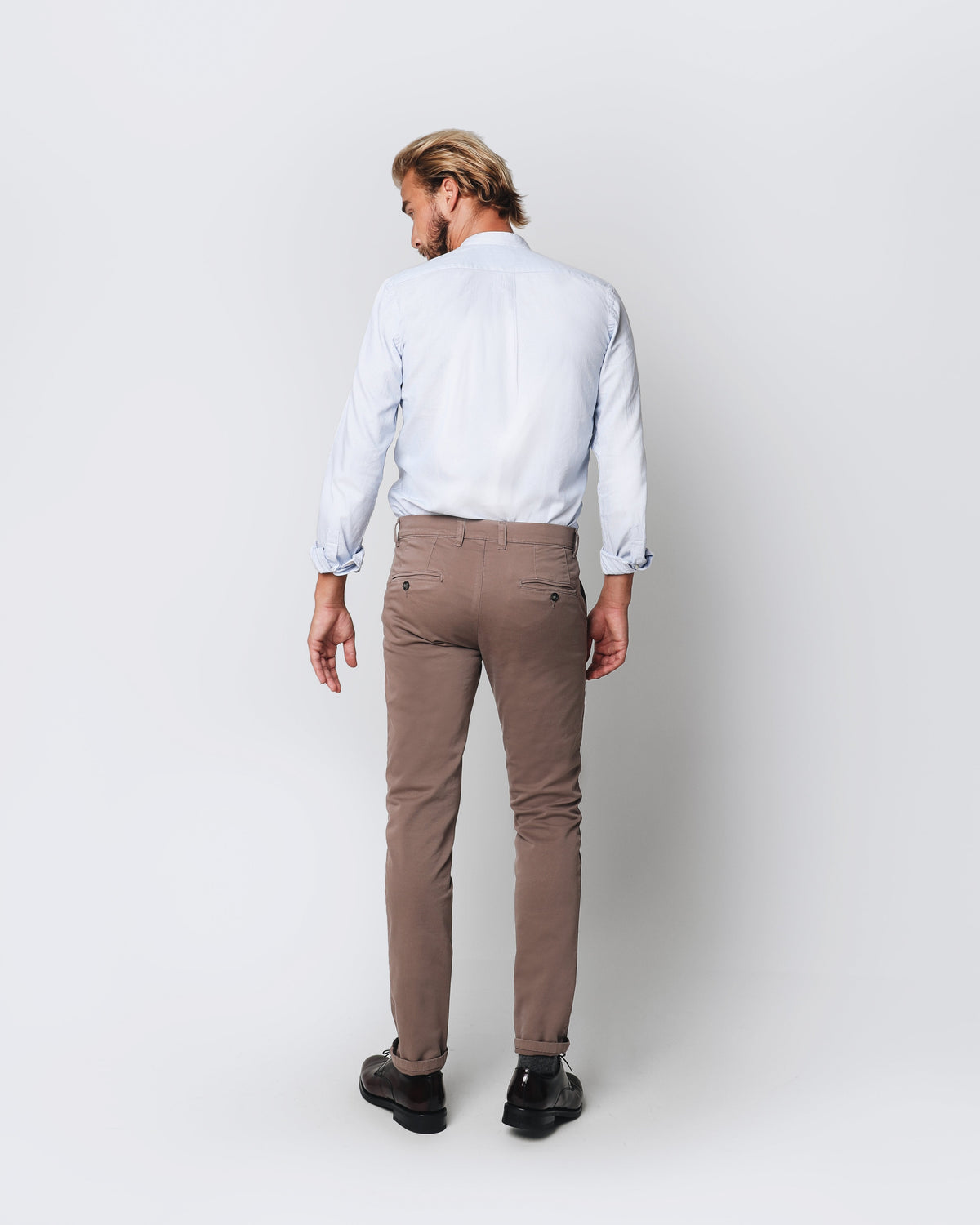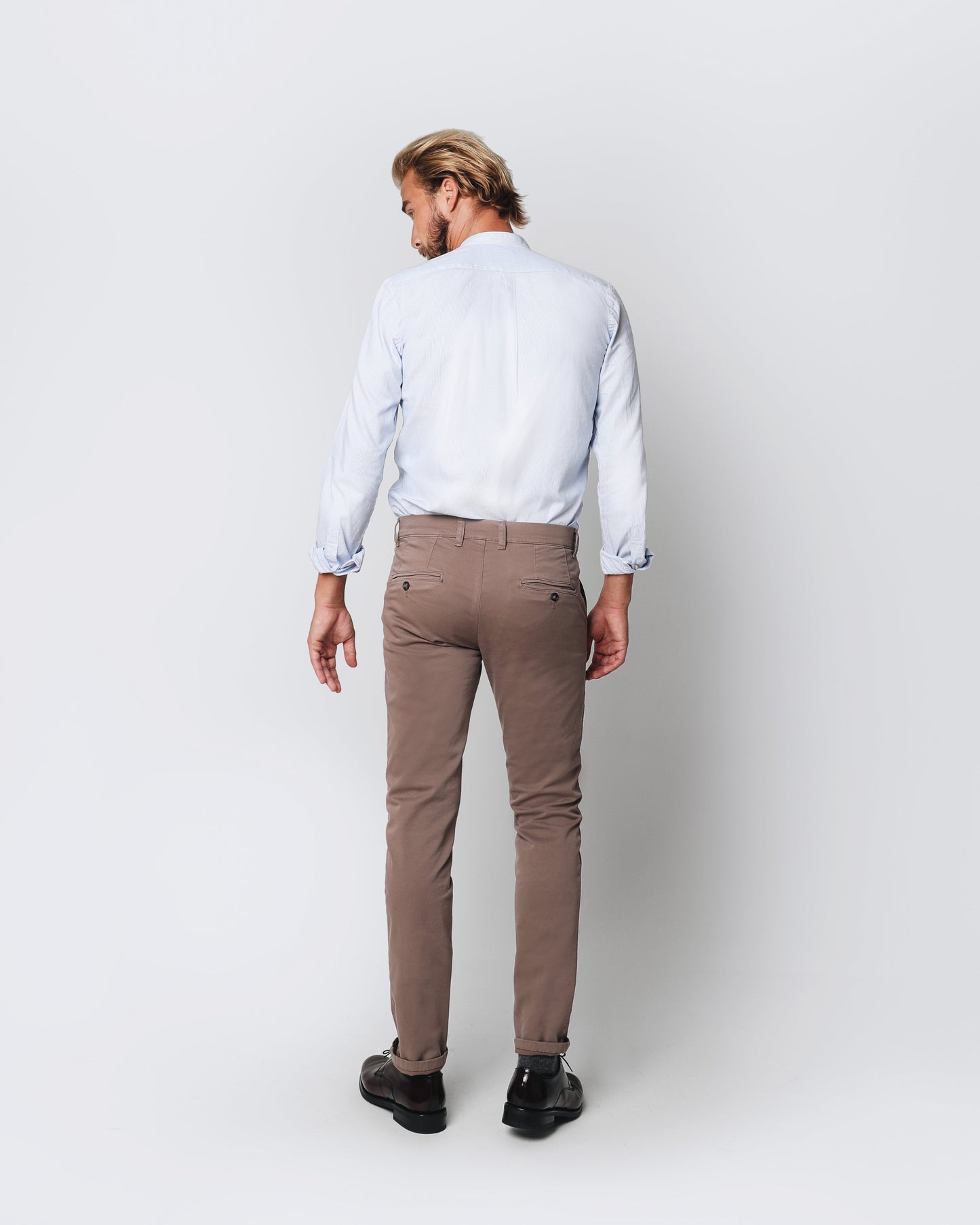 Pantalón de pinzas de corte slim fit. Cierre con botón y cremallera, trabillas y bolsillos.