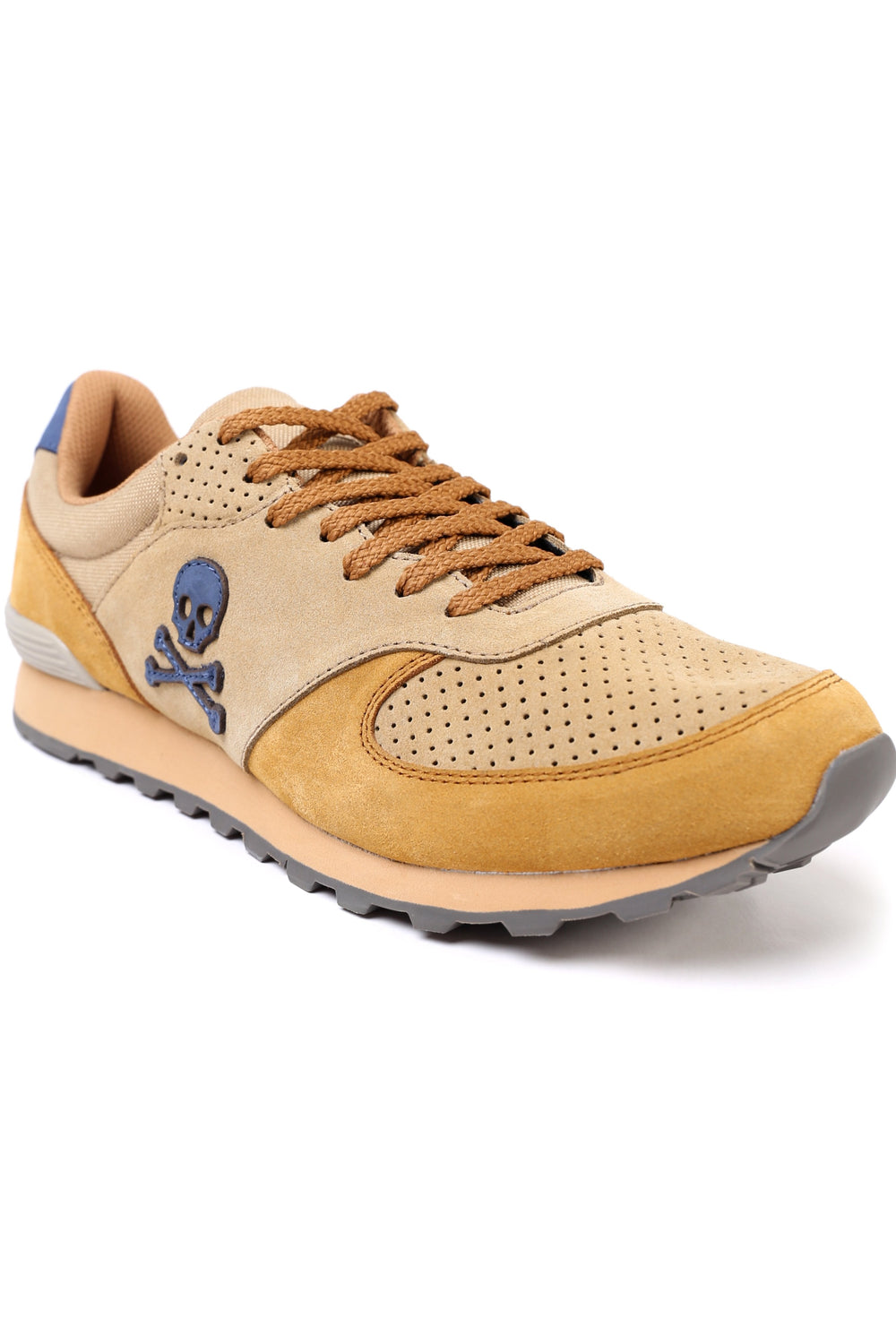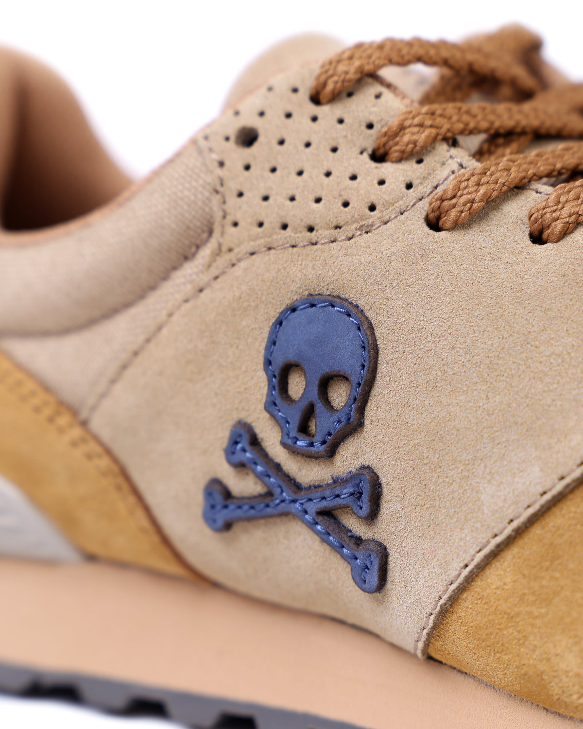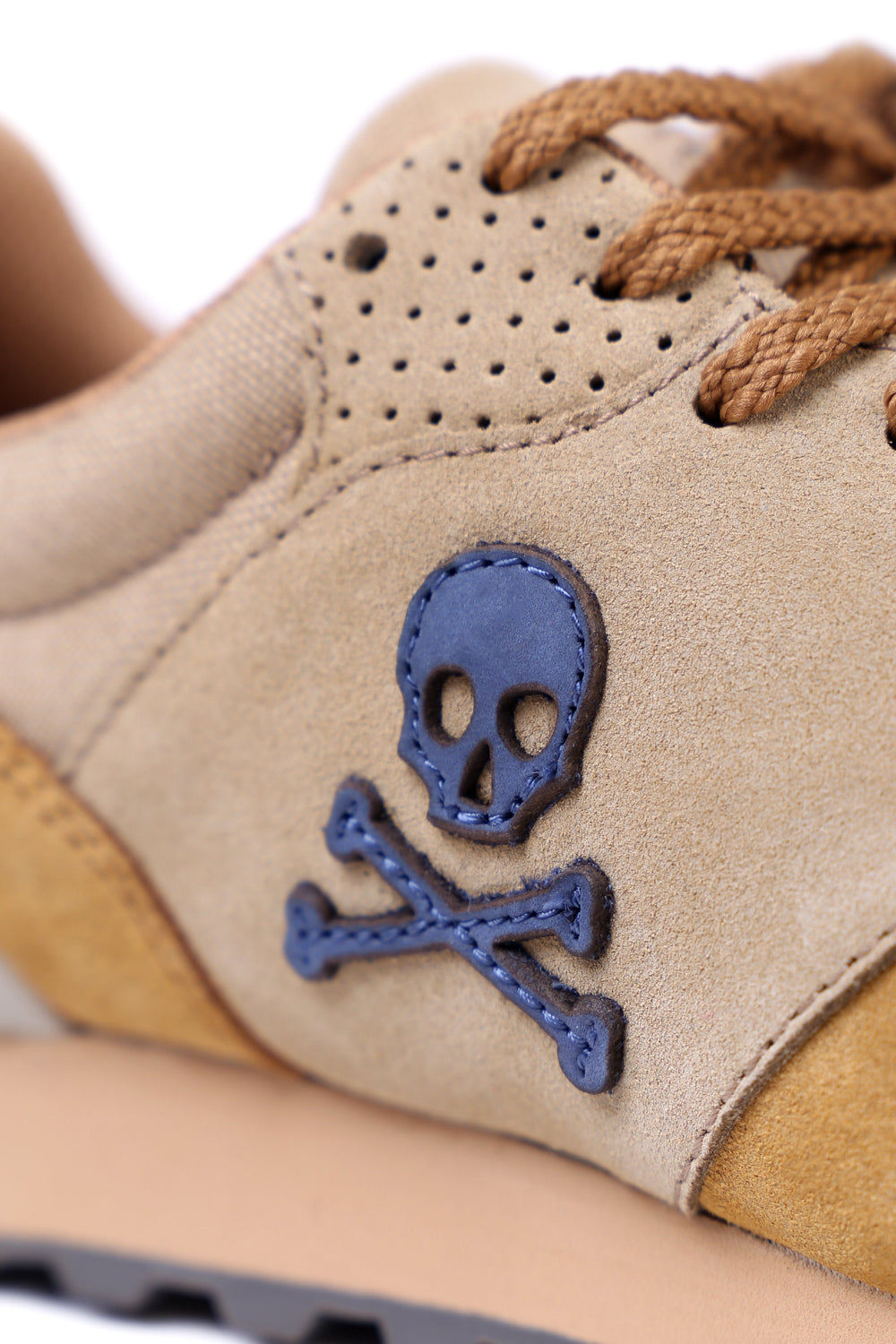 Sneakers confeccionada en serraje y piel. Cierre con cordones, rejilla delantera y cordones. Detalle de calavera bordada.