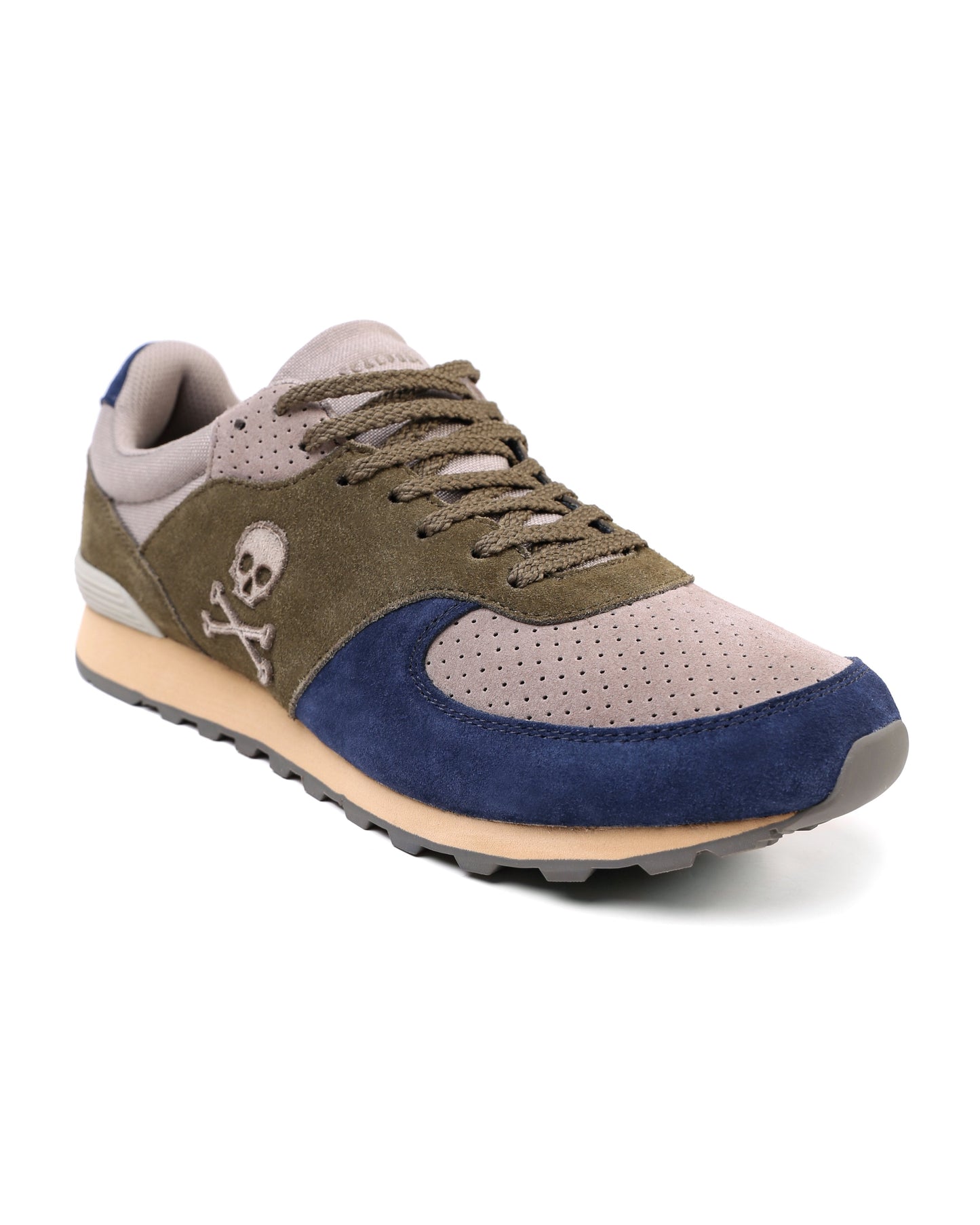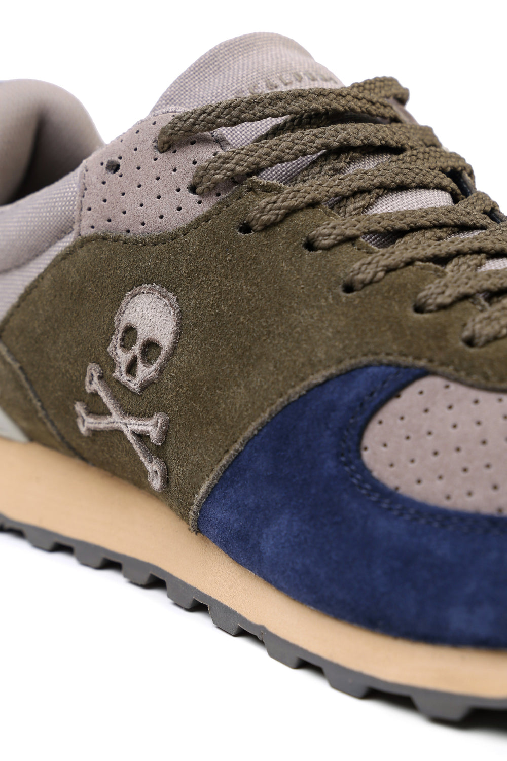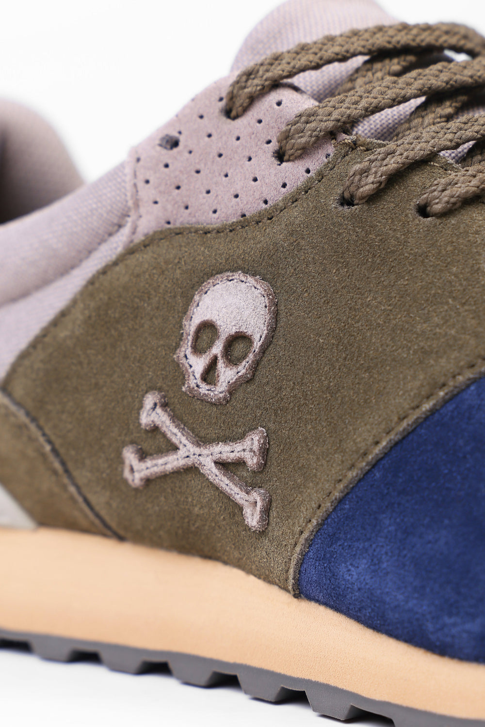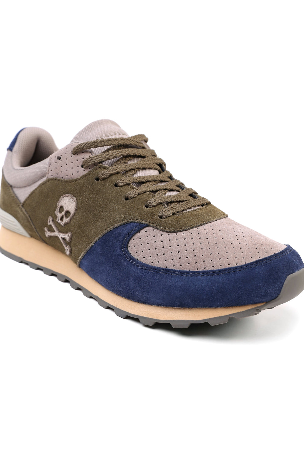 Sneakers confeccionada en serraje y piel. Cierre con cordones, rejilla delantera y cordones. Detalle de calavera bordada.