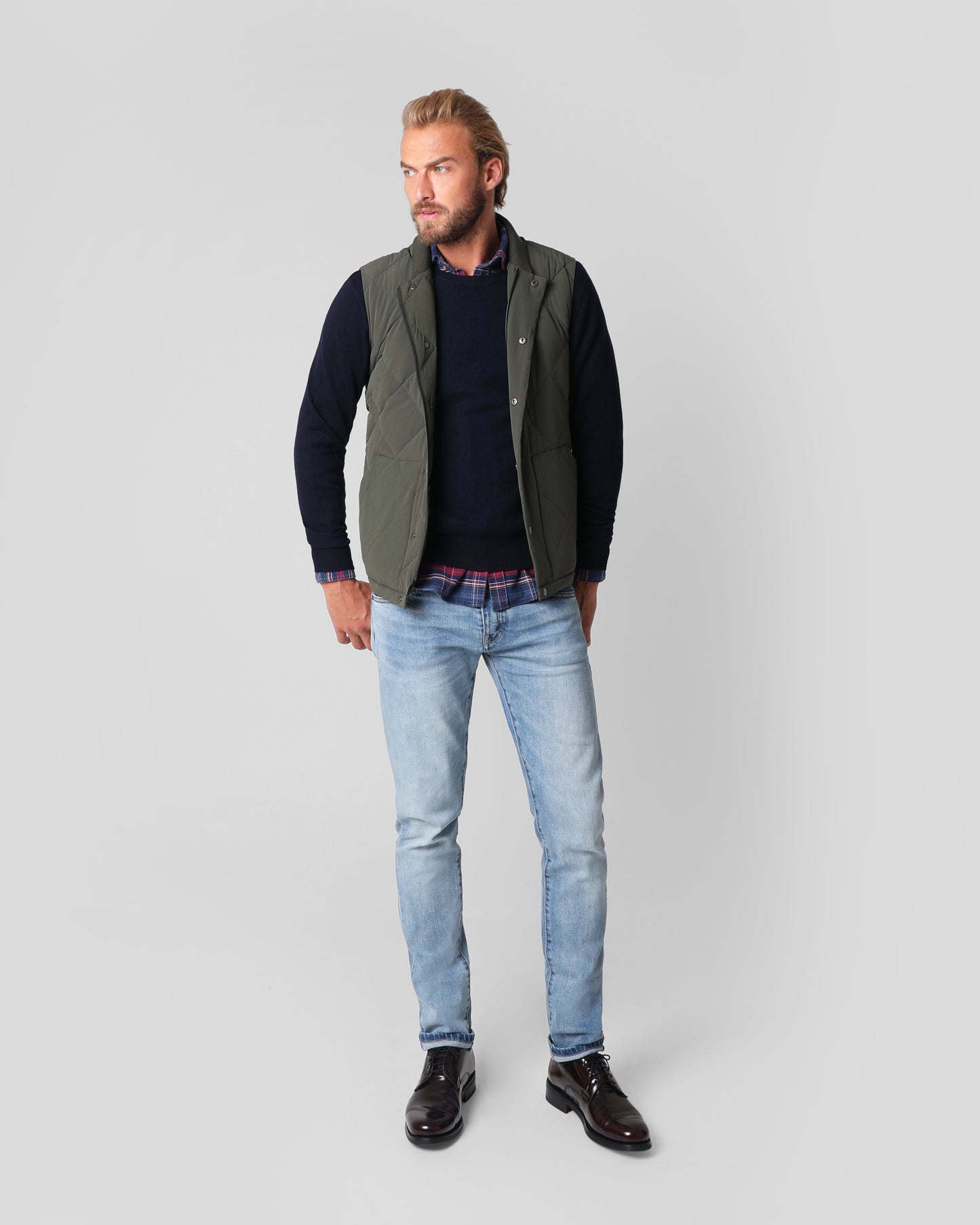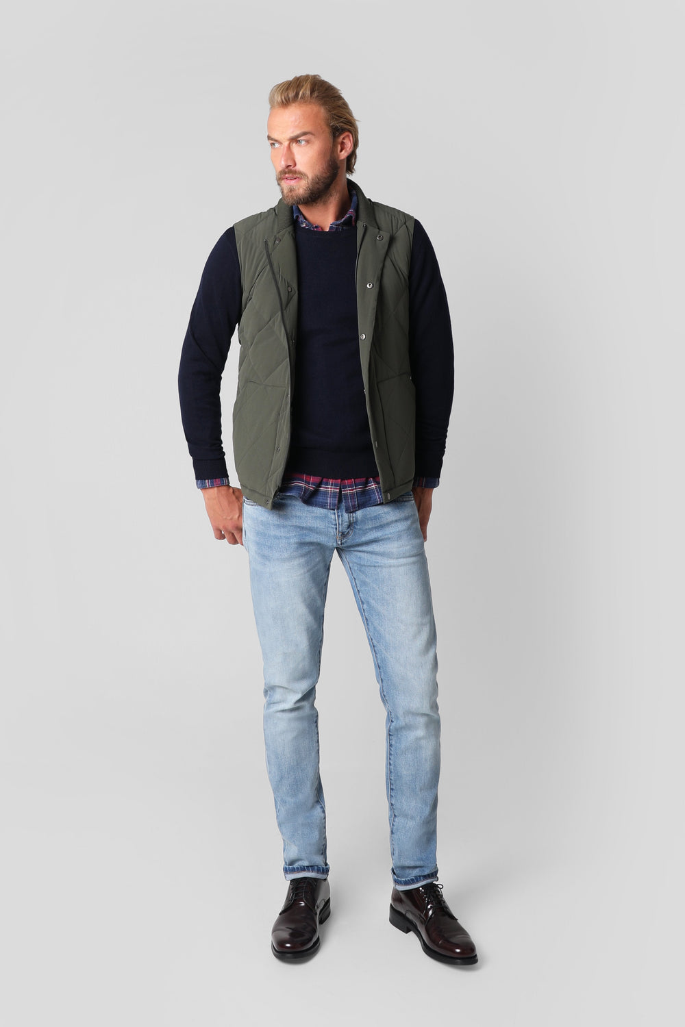 Chaleco guateado con cierre de botones de snaps, bolsillos de plastrón y elástico en el bajo.