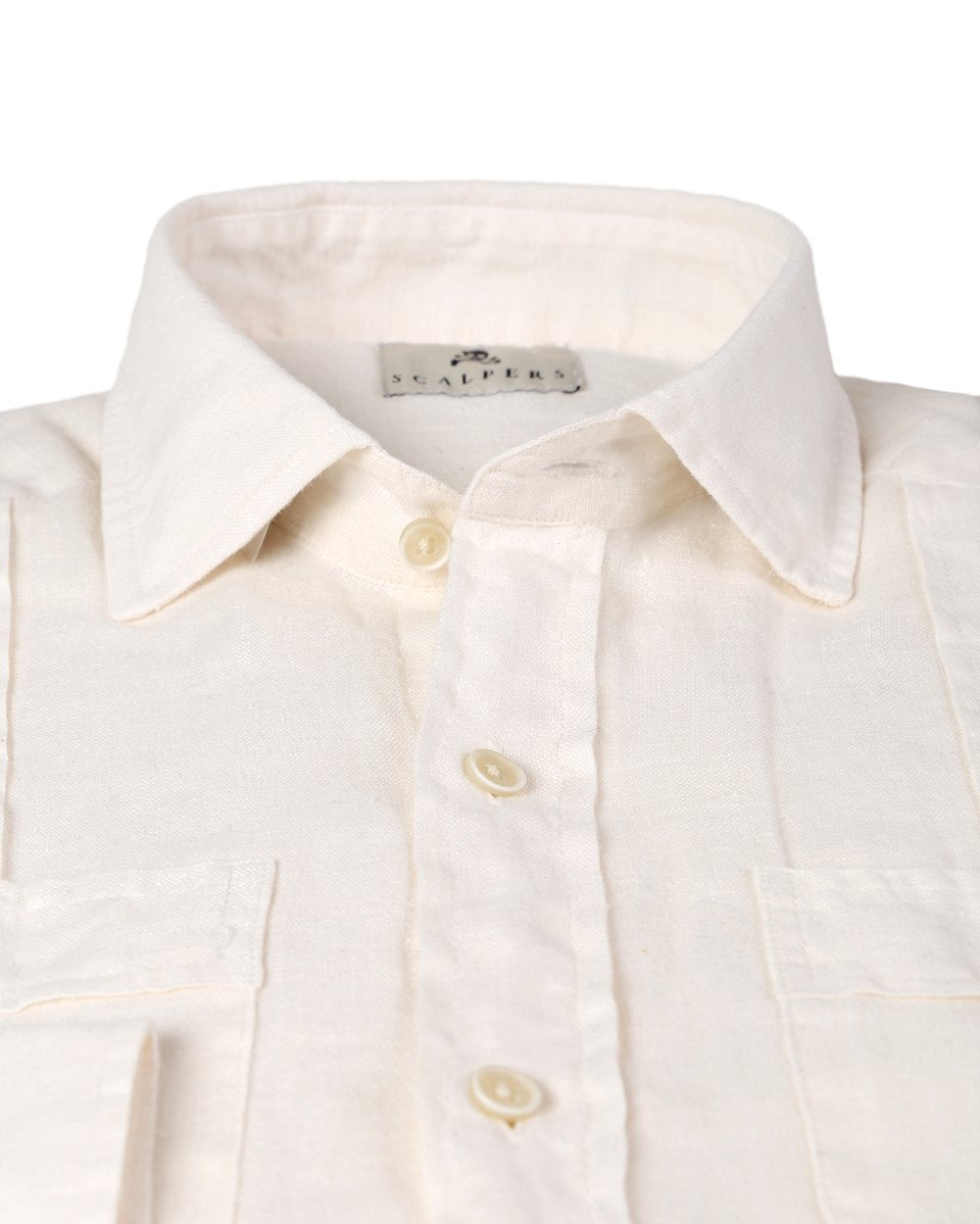 Camisa estilo guayabera. Corte Regular Fit, cuello clásico y cierre con botones. Manga larga terminada en puño con botones. Detalle de múltiples bolsillos delanteros con botones.