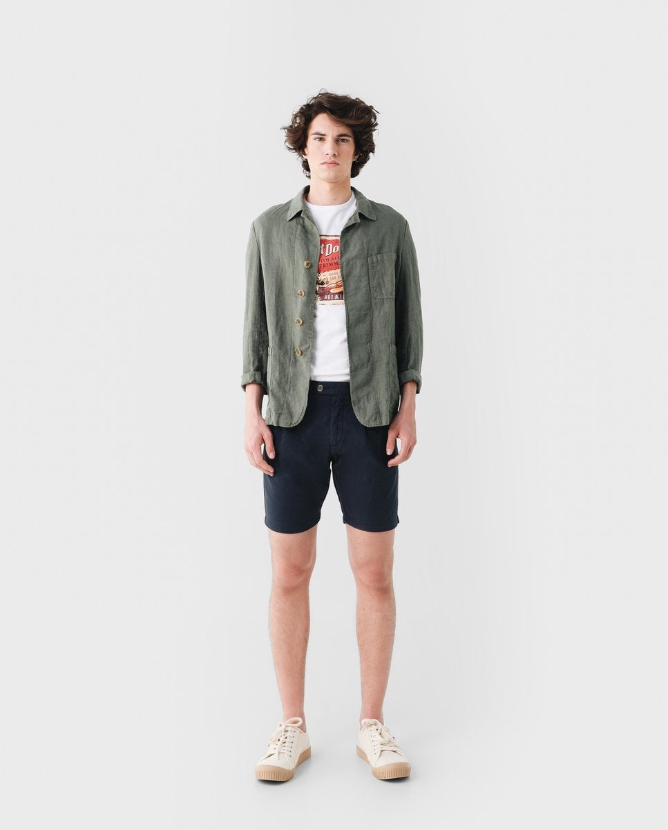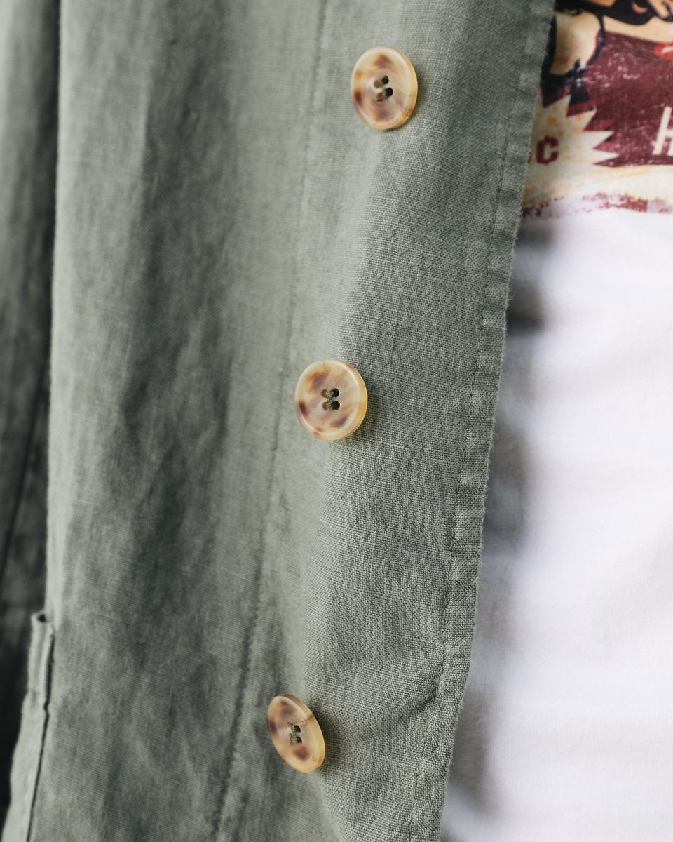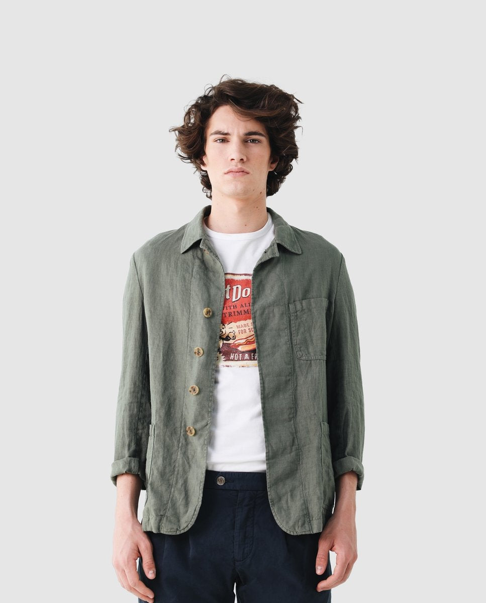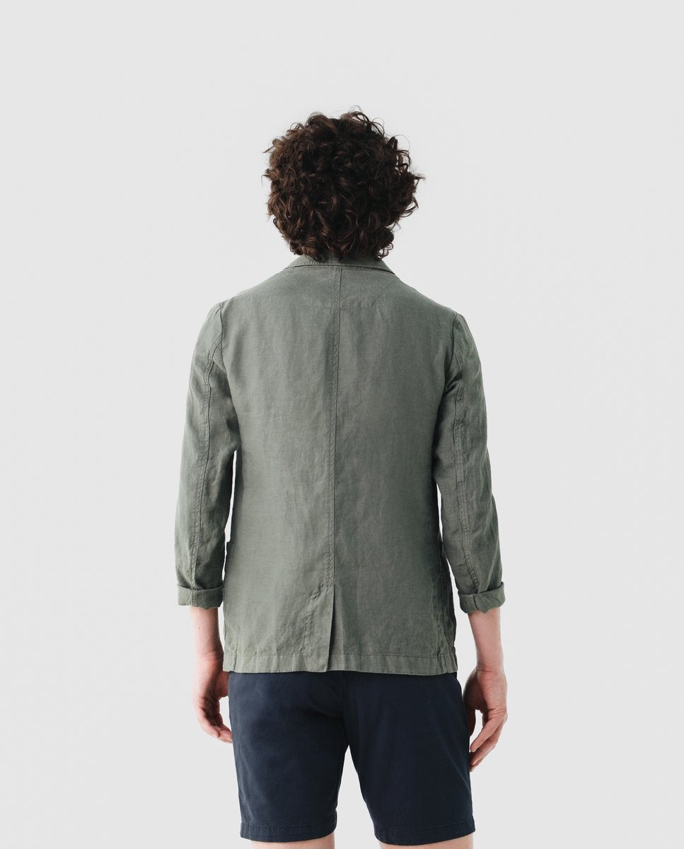 Americana confeccionada en tejido 100% lino. Corte slim fit, cuello solapa con ojal y cierre con dos botones ocultos por tapeta. Dos bolsillos de plastrón frontales y uno a la altura del pecho. Manga larga terminada en puño. Disponible en dos colores.