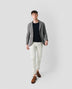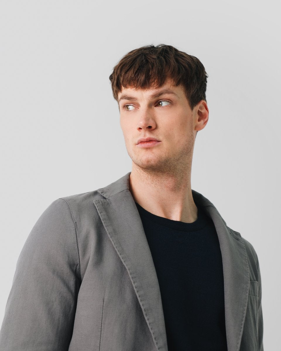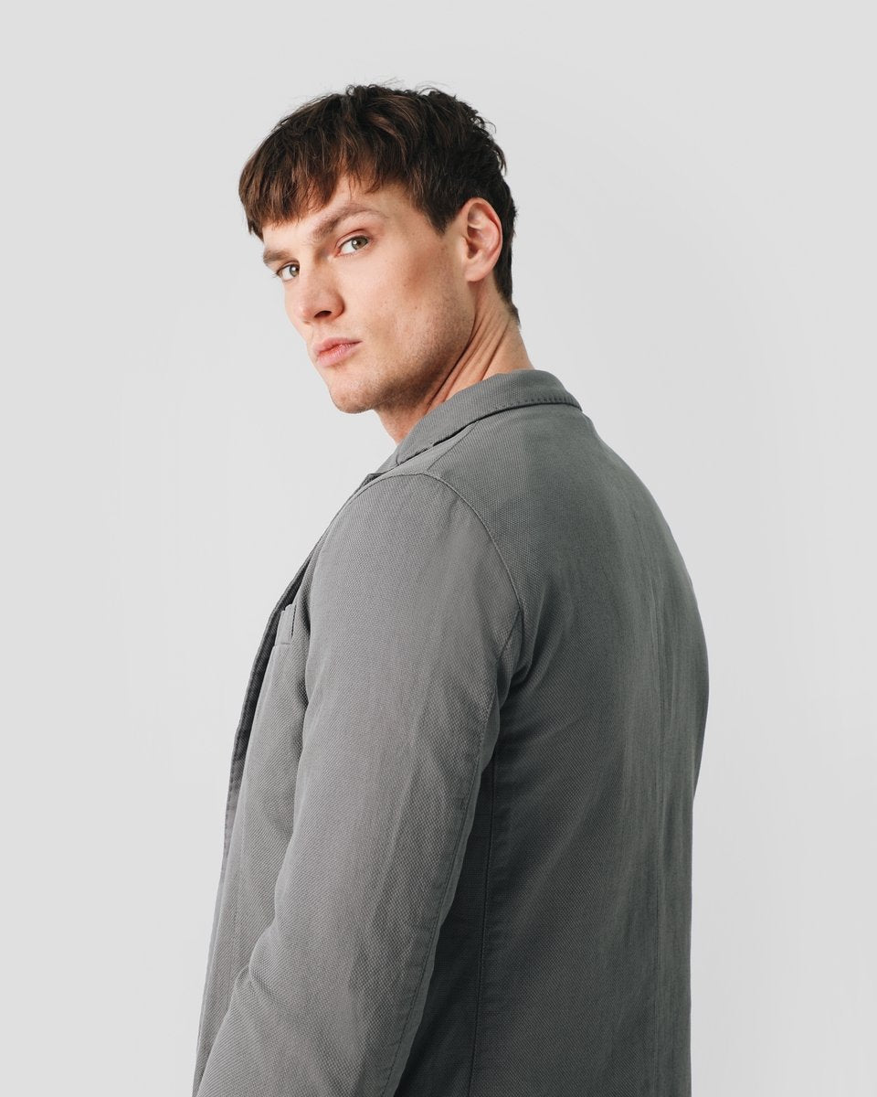 Blazer desestructurada confeccionada en mezcla de lino y algodón. Corte Slim Fit, cuello con solapas de pico, cierre cruzado con dos botones. Tiene dos bolsillos de parche frontales y uno insertado a la altura del pecho. Manga larga terminada en puño con cuatro botones y bolsillos interiores. Disponible en tres colores.