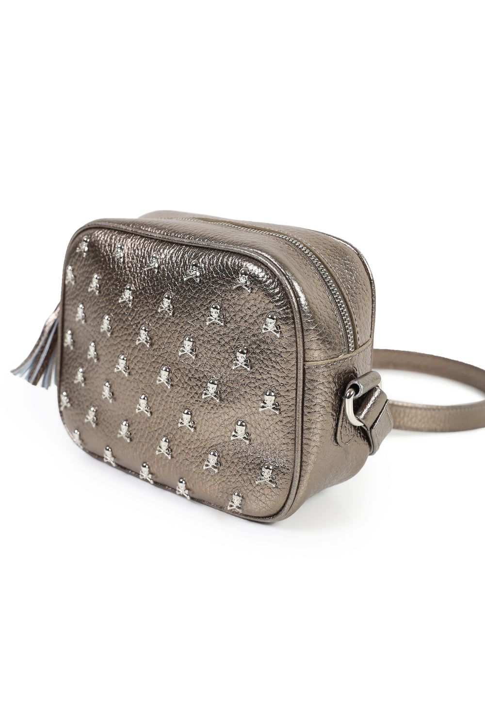 Bolso con tachuelas de calavera, confeccionado en tejido 100% piel. Cierre con cremallera con pompón y asa larga ajustable. Presenta detalle de logo grabado en el bajo.