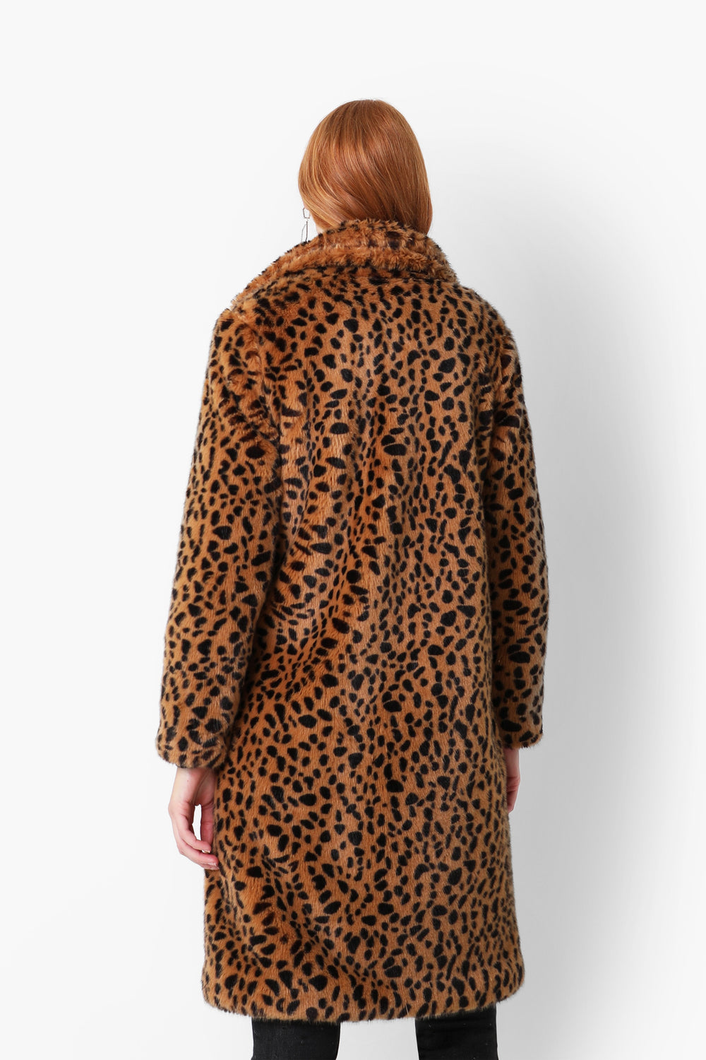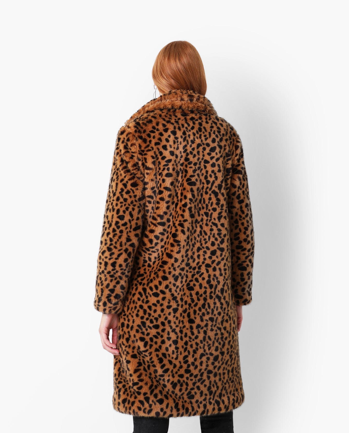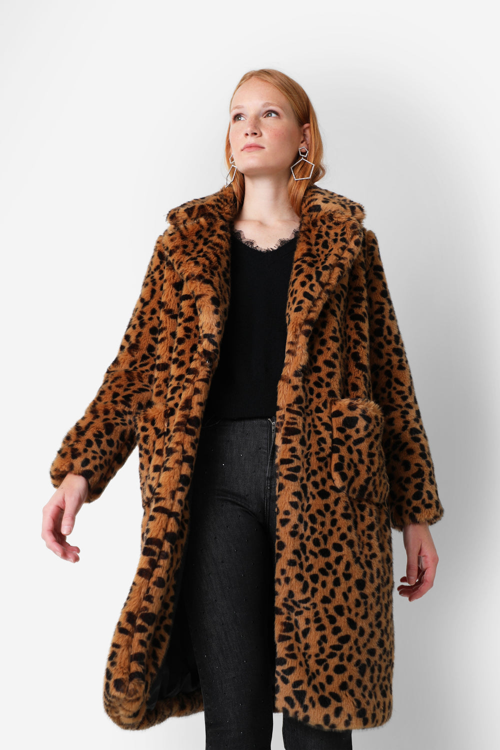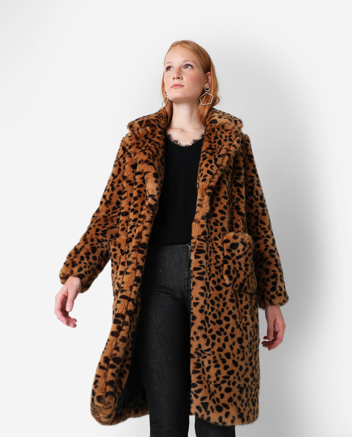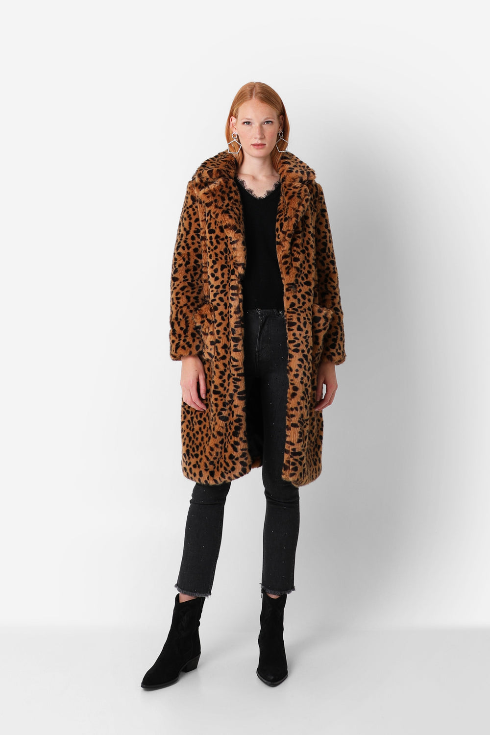Abrigo con estampado animal confeccionado en tejido imitación de pelo. Corte oversize, cuello con solapa y cierre con un botón. Manga larga y bolsillos de plastrón.