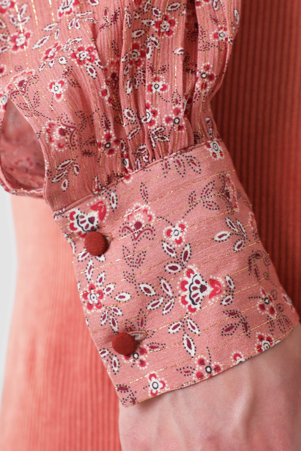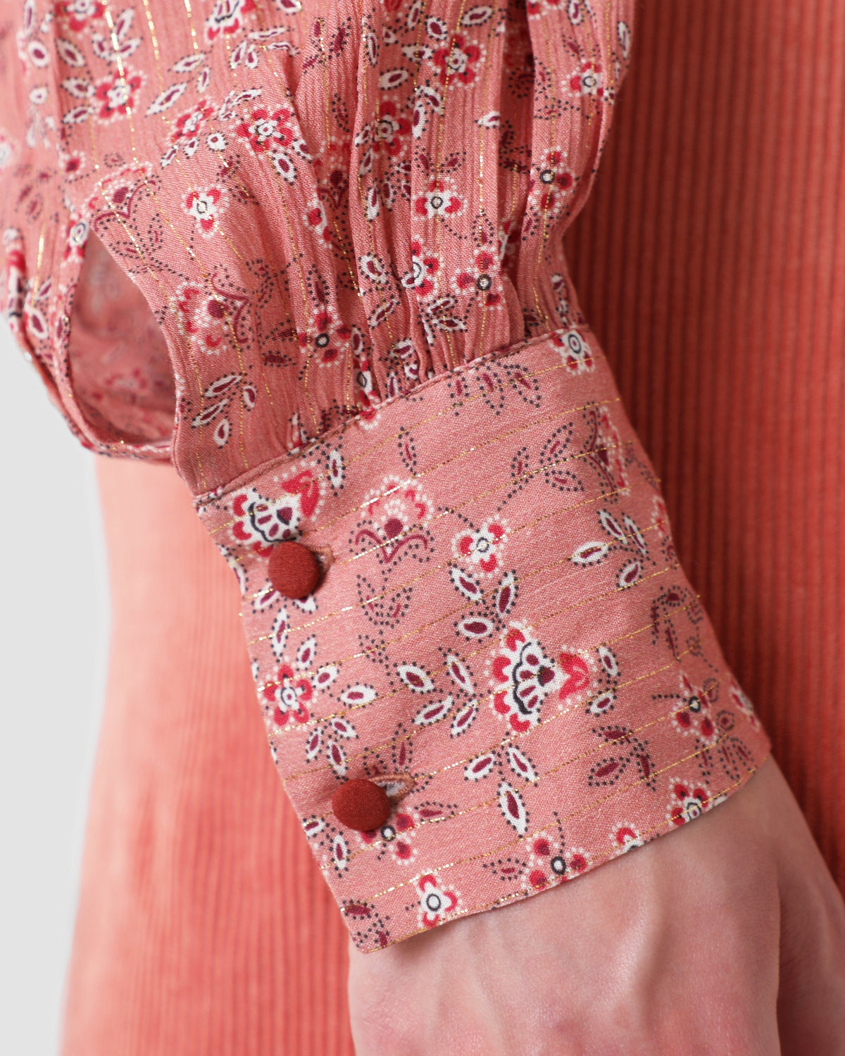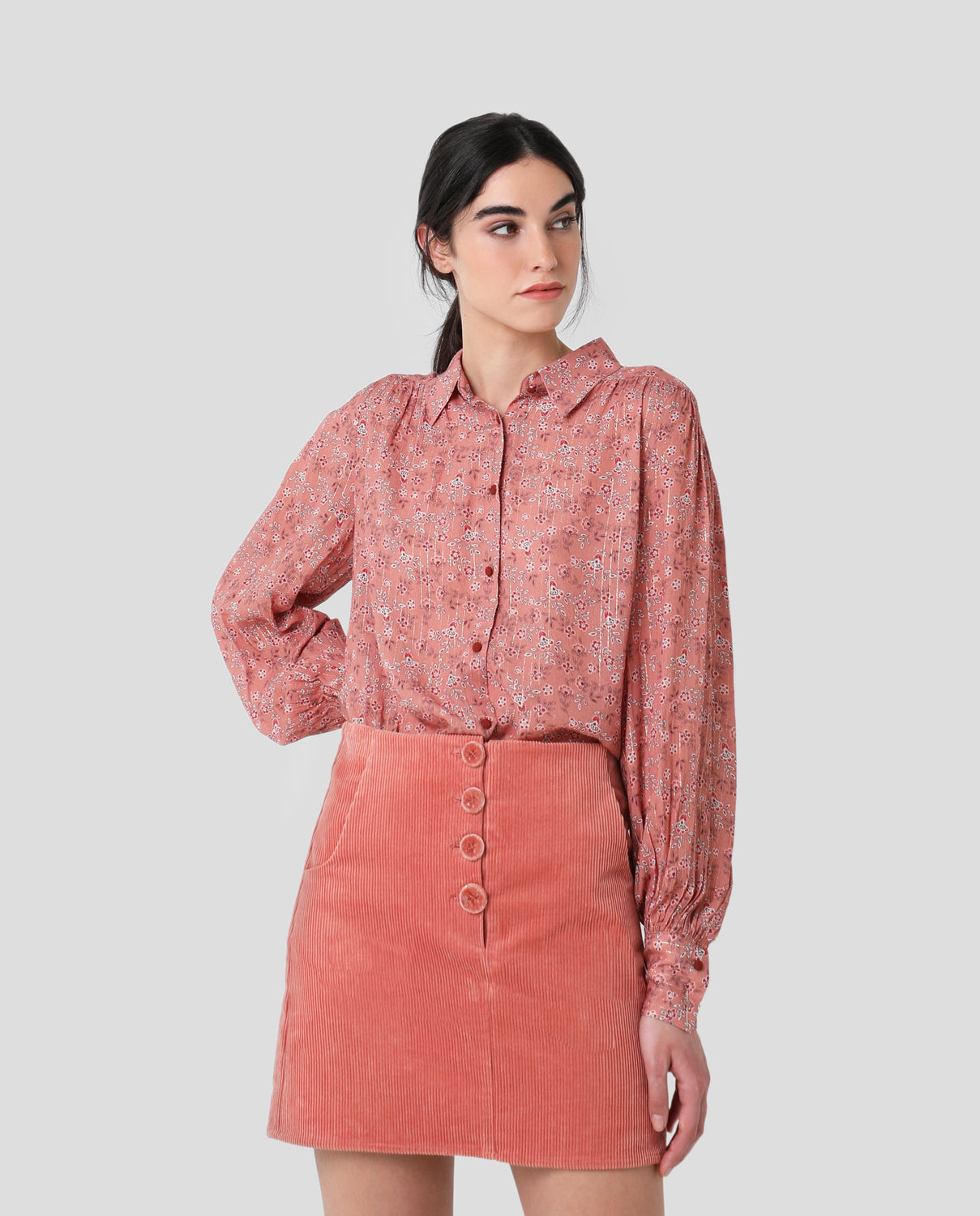 Blusa con estampado de flores confeccionada en tejido de lurex. Corte Regular Fit, cuello clásico y cierre con botones forrados. Manga larga abullonada terminada en puño.