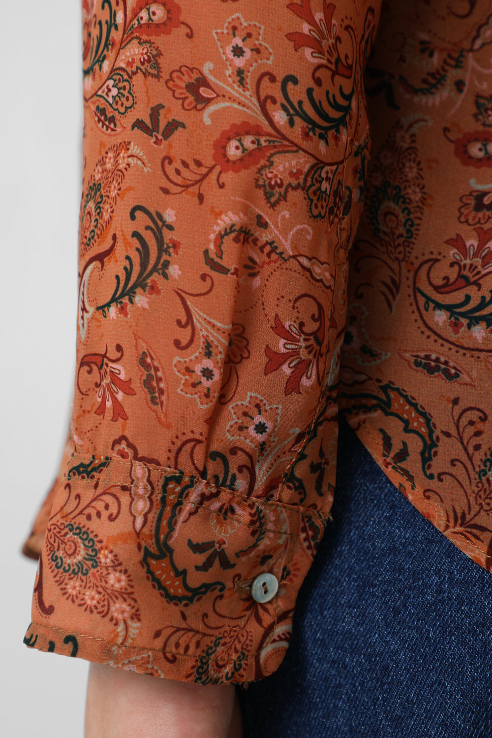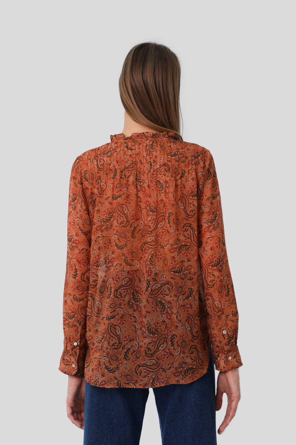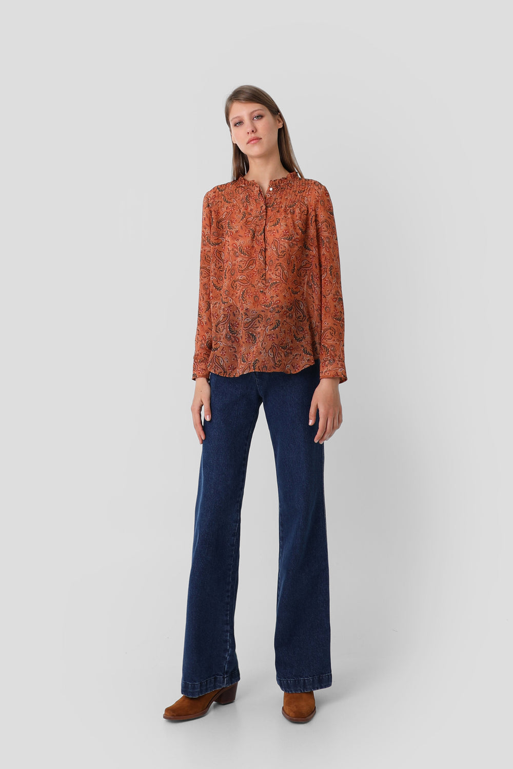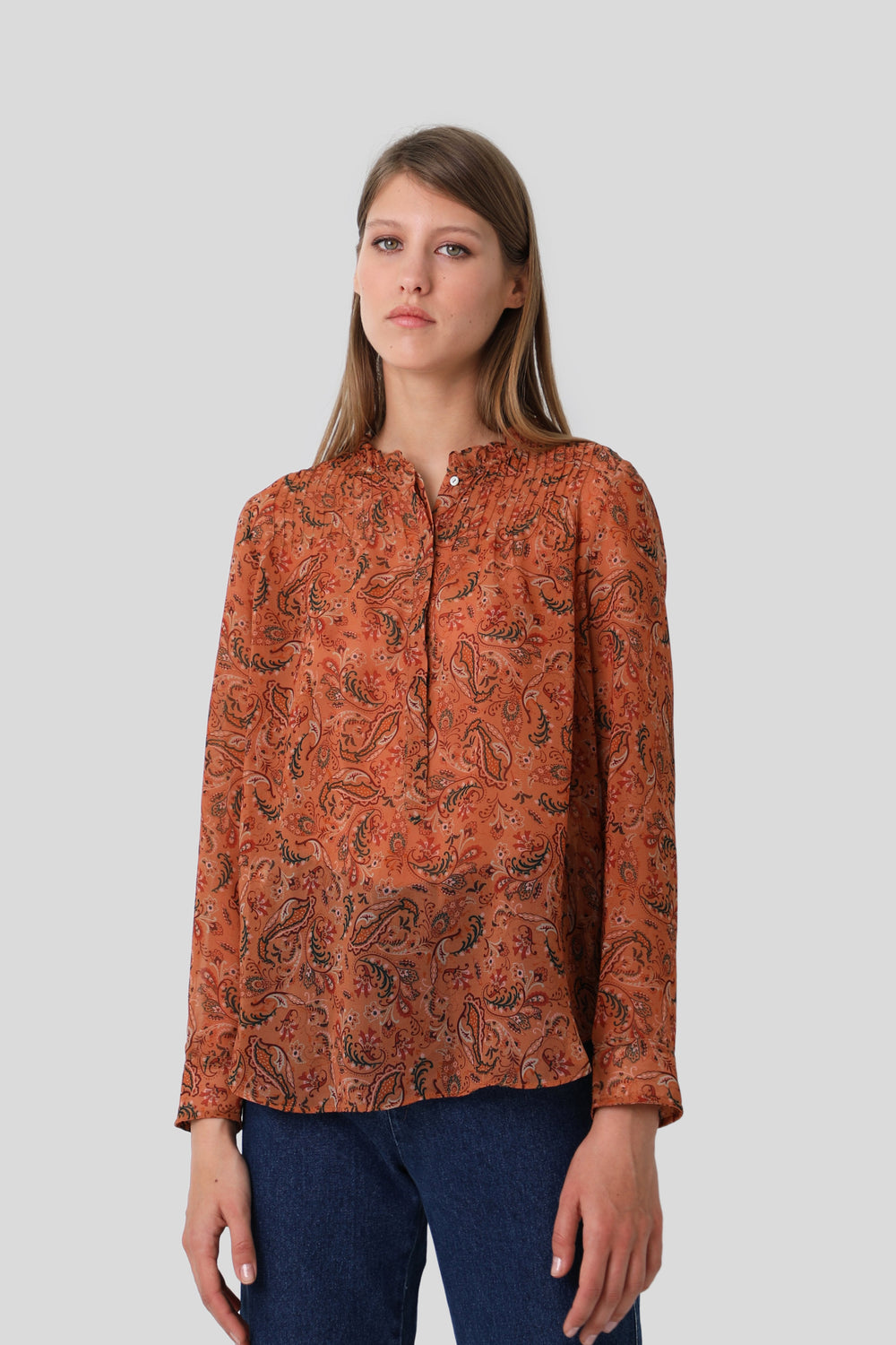 Blusa con motivo floral semitransparente. Corte recto, cuello mao con detalle de volantes y cierre con botones a media altura. Manga larga y detalle de jaretas frontales.