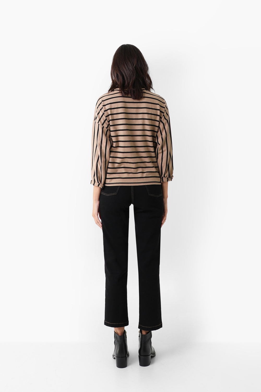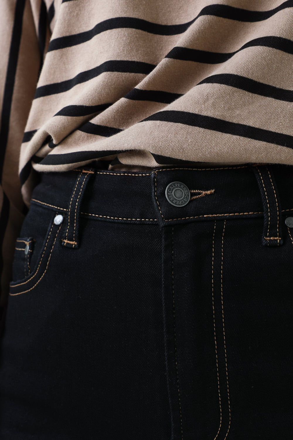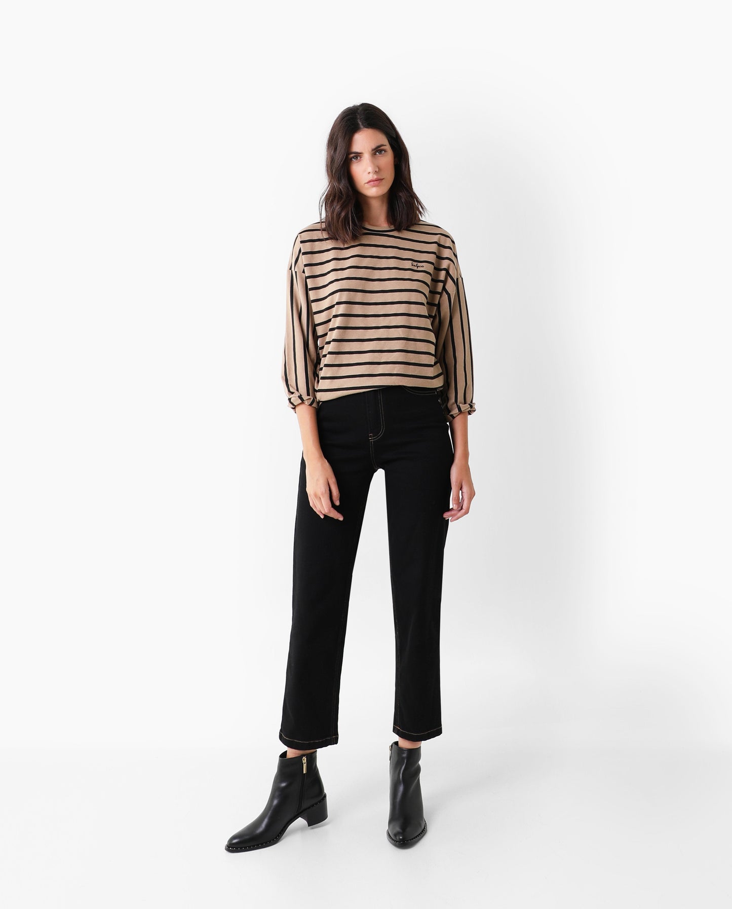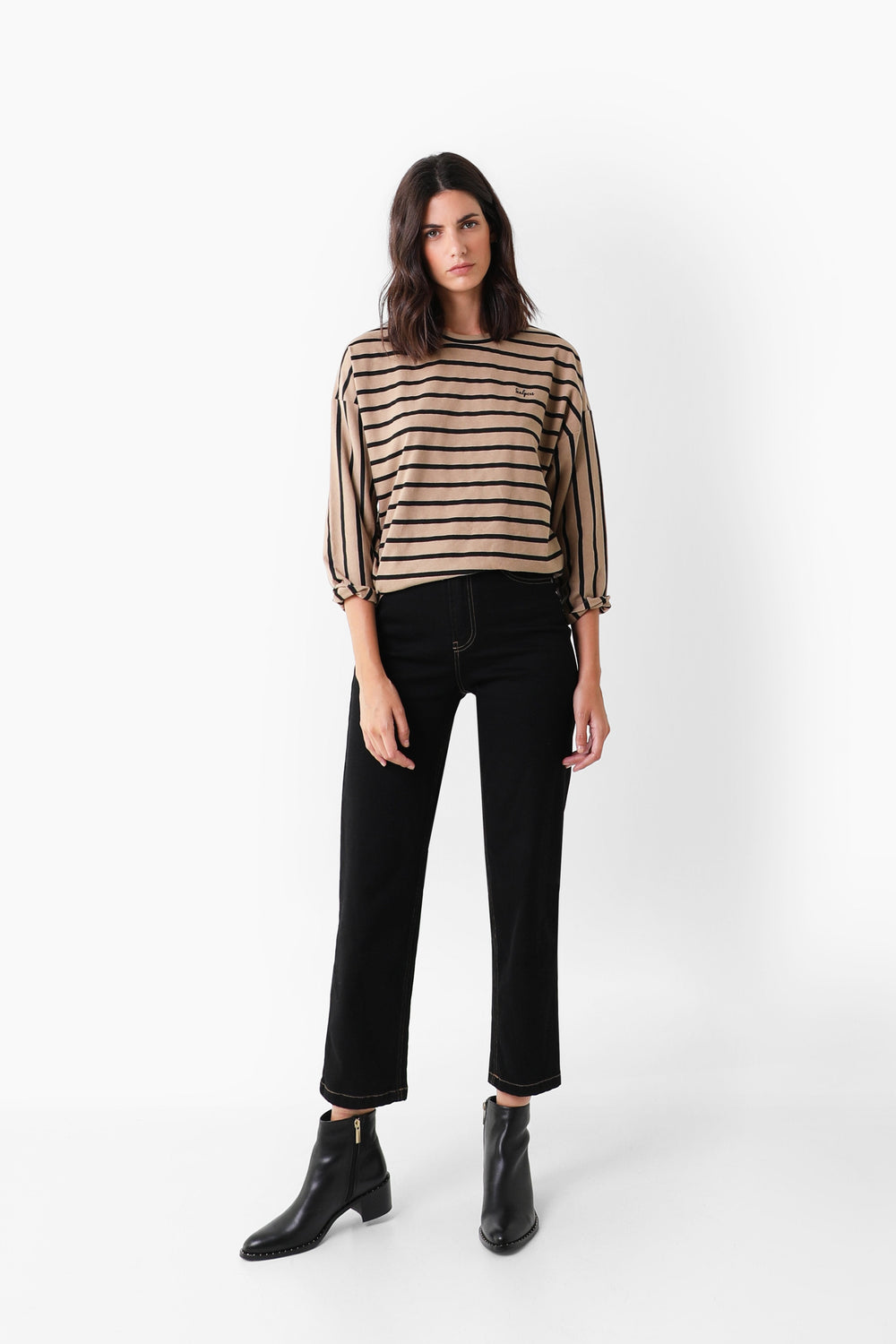 Pantalón confeccionado en tejido sarga de algodón orgánico. Corte Regular Fit con tiro alto, cierre con botón y cremallera. Bolsillos delanteros y traseros y detalle de pespuntes a contraste.