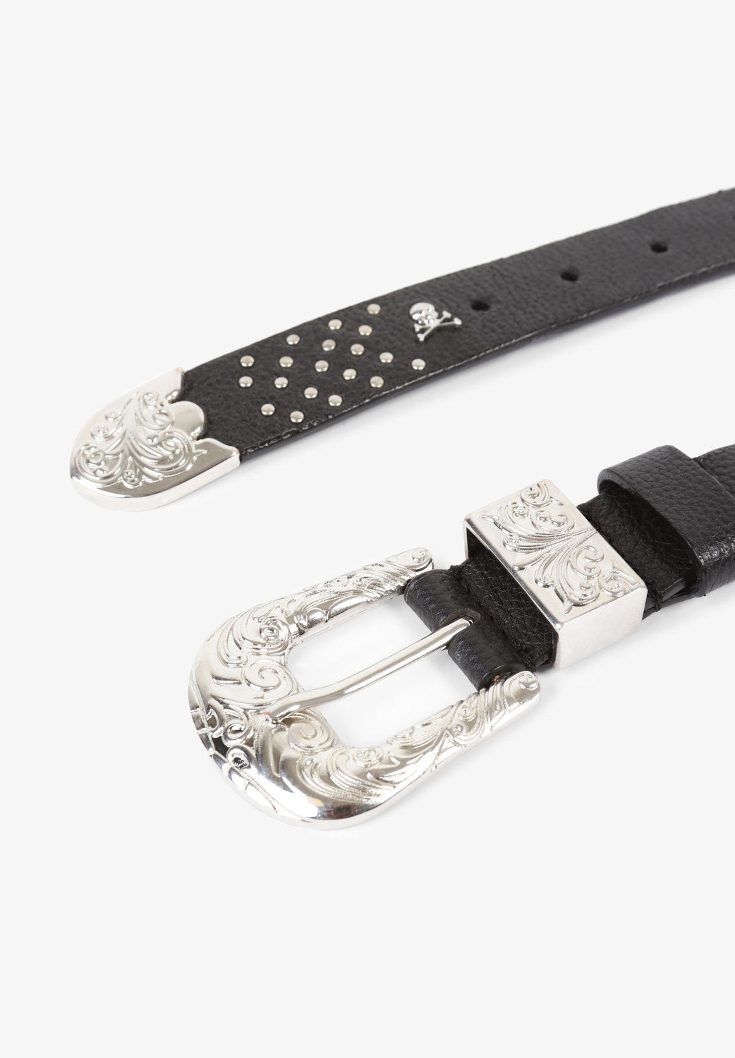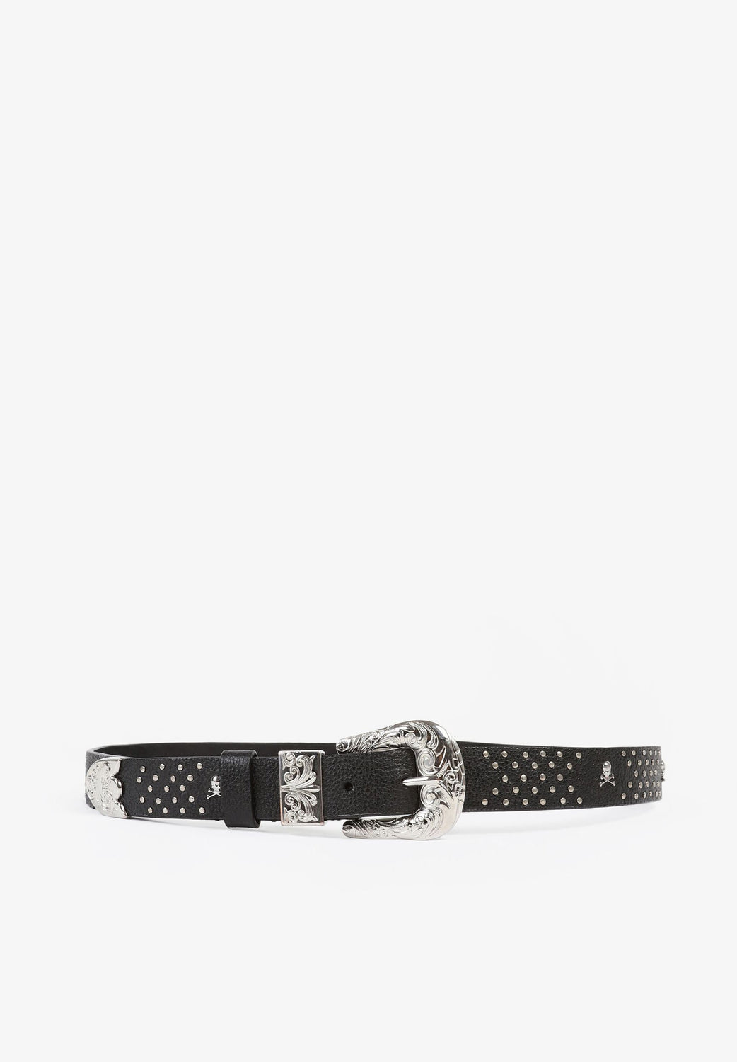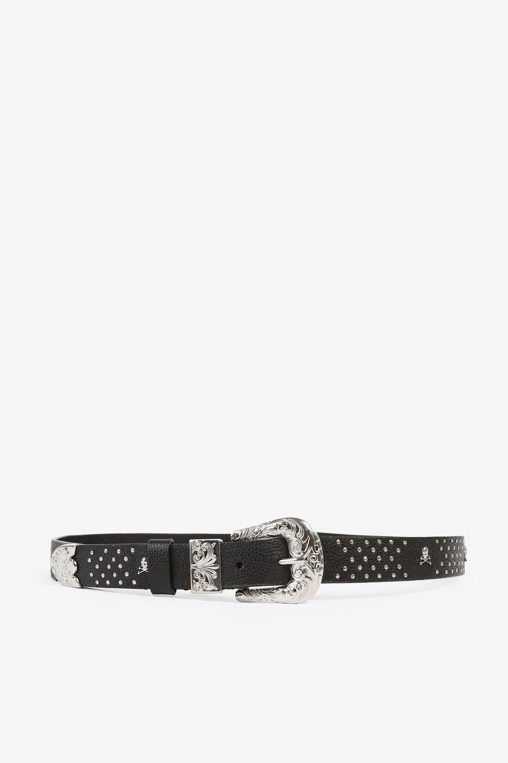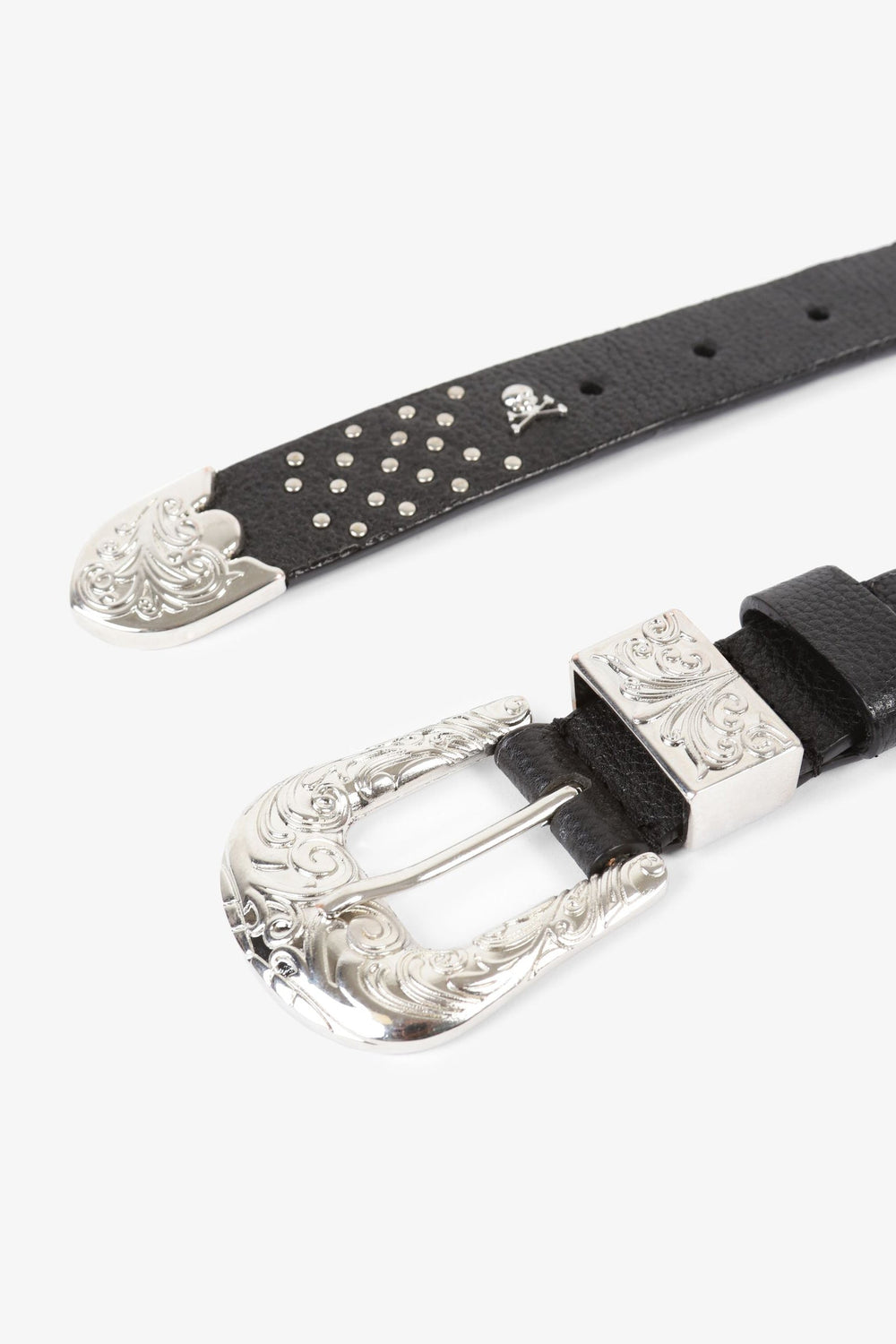 Cinturón confeccionado en tejido 100% piel de vacuno. Cierre con hebilla metálica con grabado y detalle de tachuelas.
