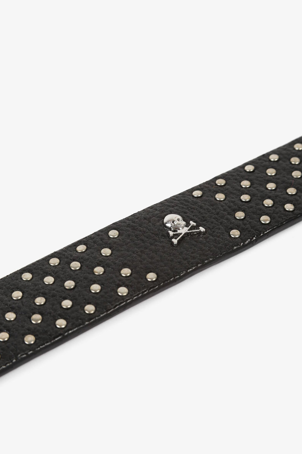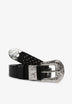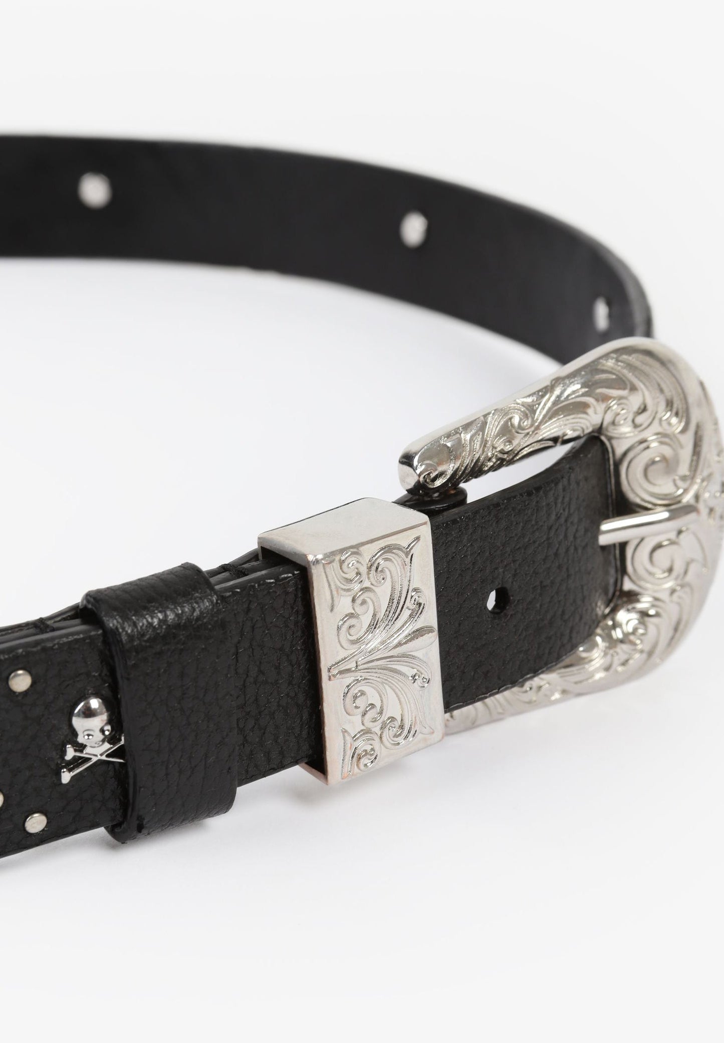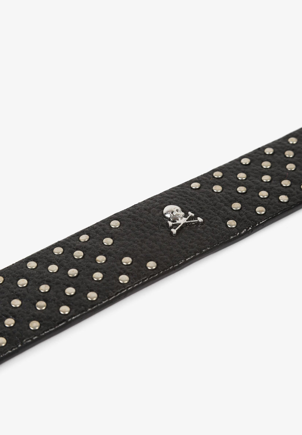 Cinturón confeccionado en tejido 100% piel de vacuno. Cierre con hebilla metálica con grabado y detalle de tachuelas.