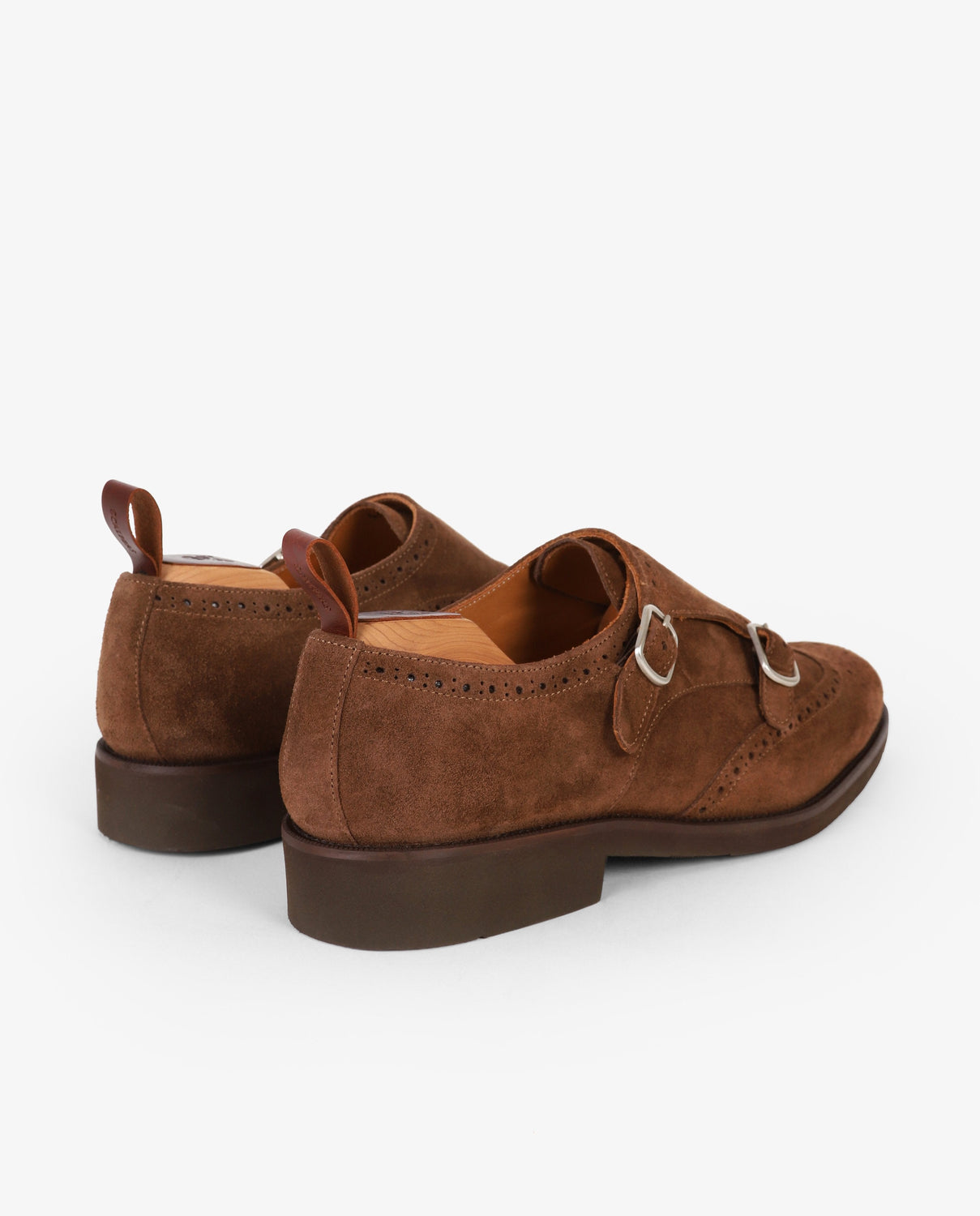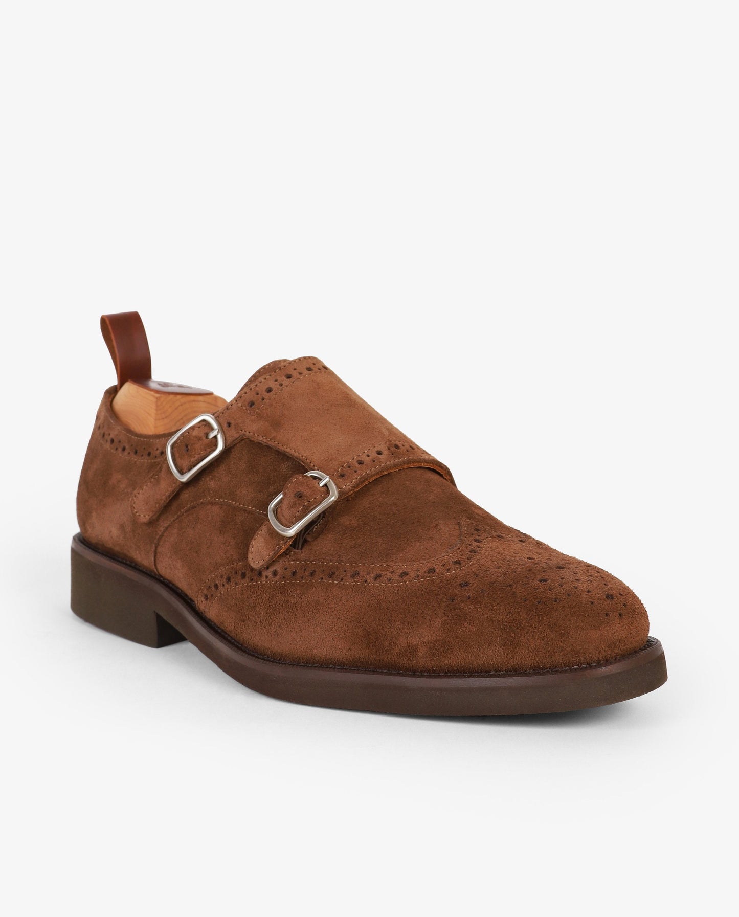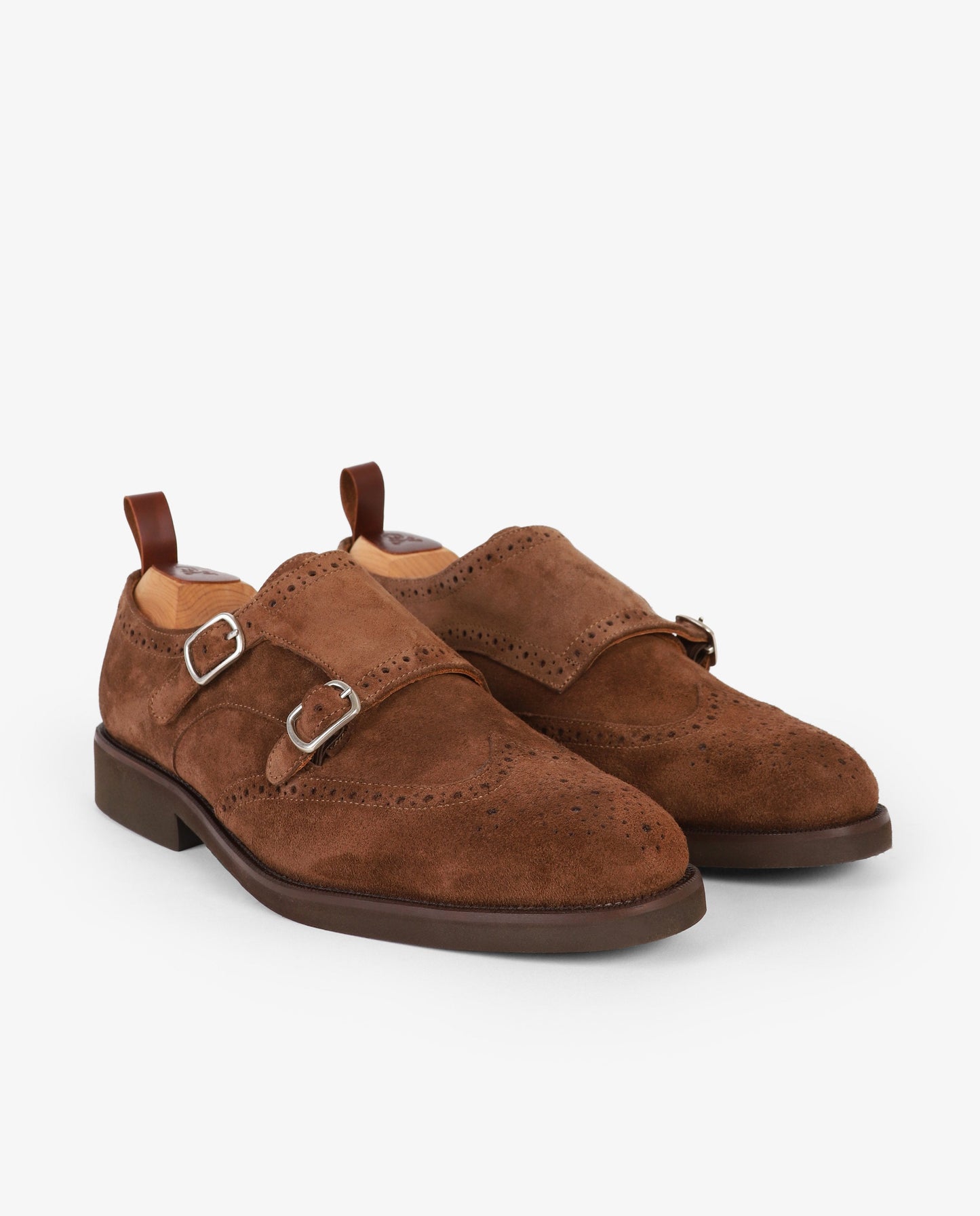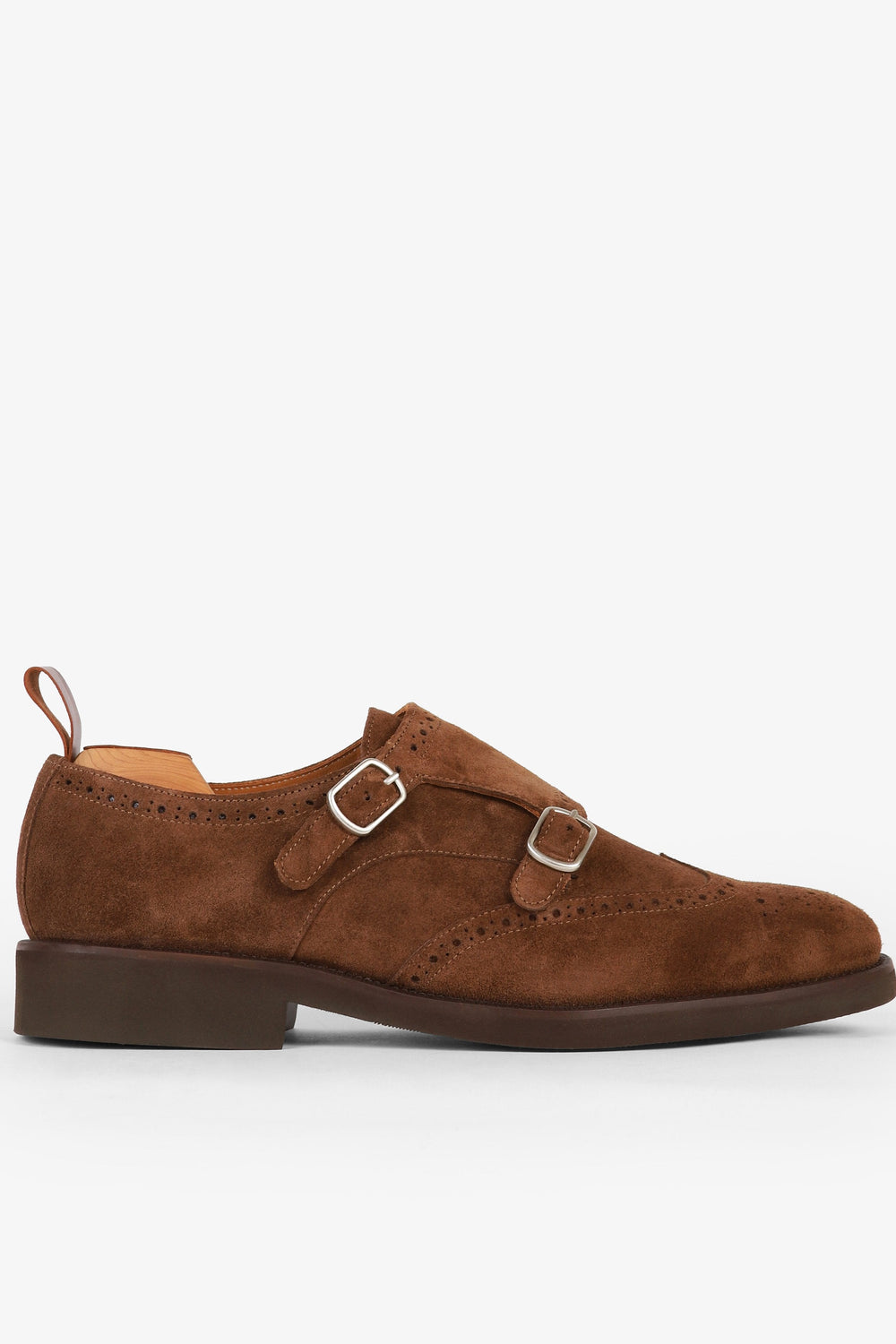 Zapatos monk confeccionados en 100% piel y exterior de serraje. Cierra con doble hebilla metálica, suela de goma extraligera, pala vega y detalle picados. Forro de piel. Fabricados en España.