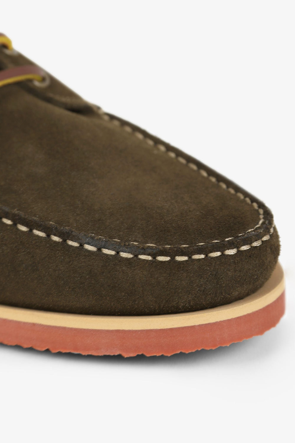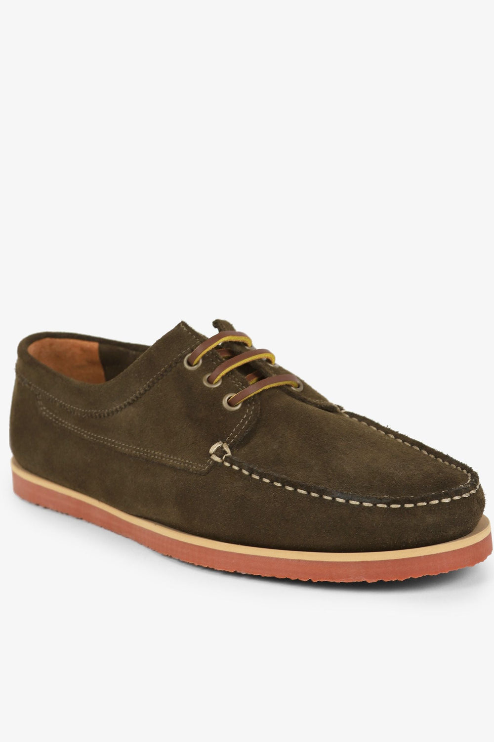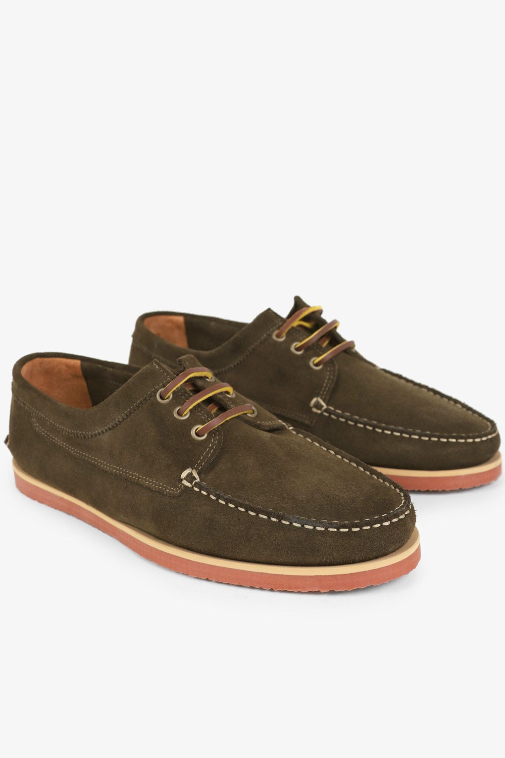 Naúticos confeccionados en serraje. Cierre con cordones de piel y suela de goma.