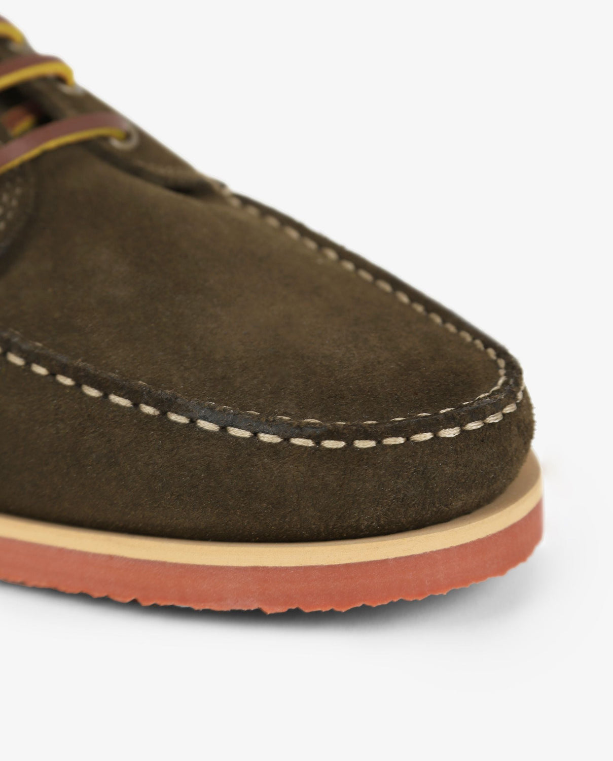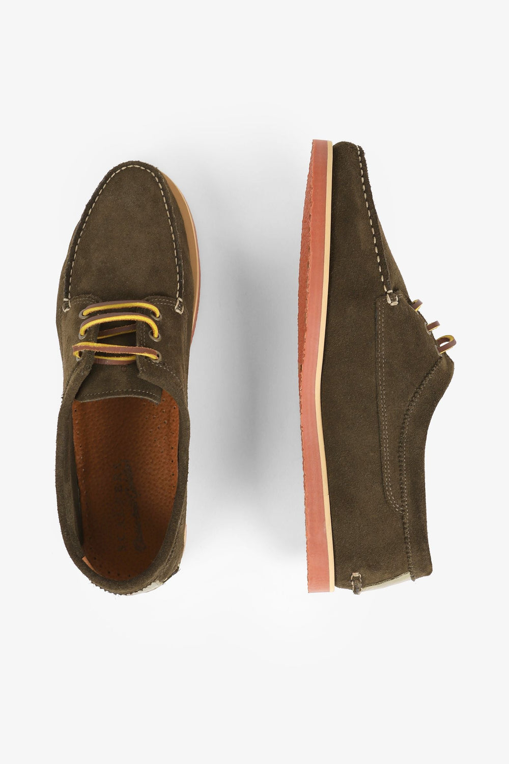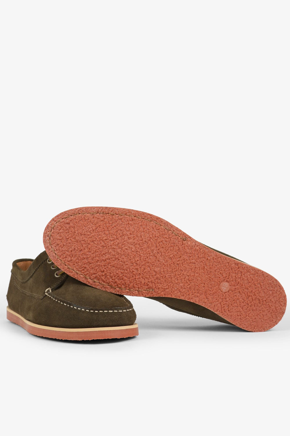 Naúticos confeccionados en serraje. Cierre con cordones de piel y suela de goma.