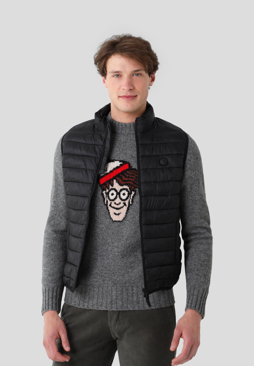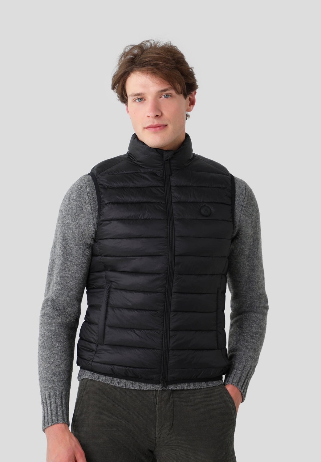 Parka relleno de poliéster reciclado confeccionado en tejido water repellent suave al tacto. Cuello alzado y cierre con cremallera de doble carro. Tiene dos bolsillos laterales cerrados con cremallera y dos bolsillos interiores. Sin mangas con sisa elástica y con parche de goma en el pecho.