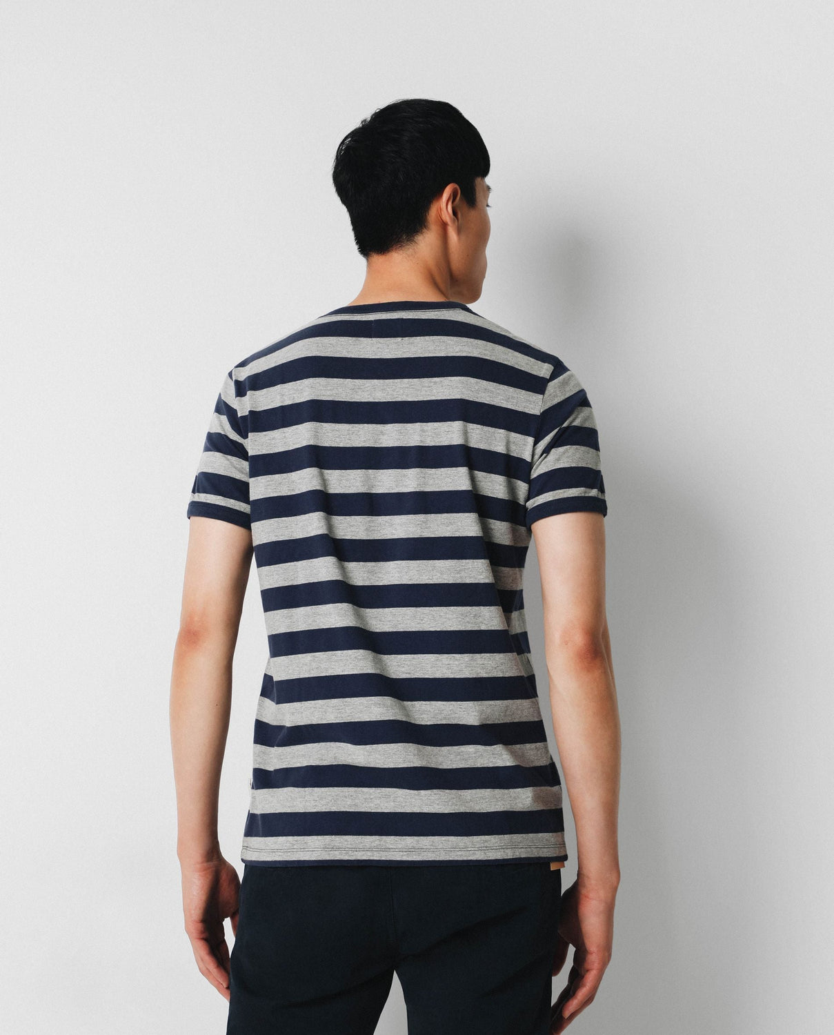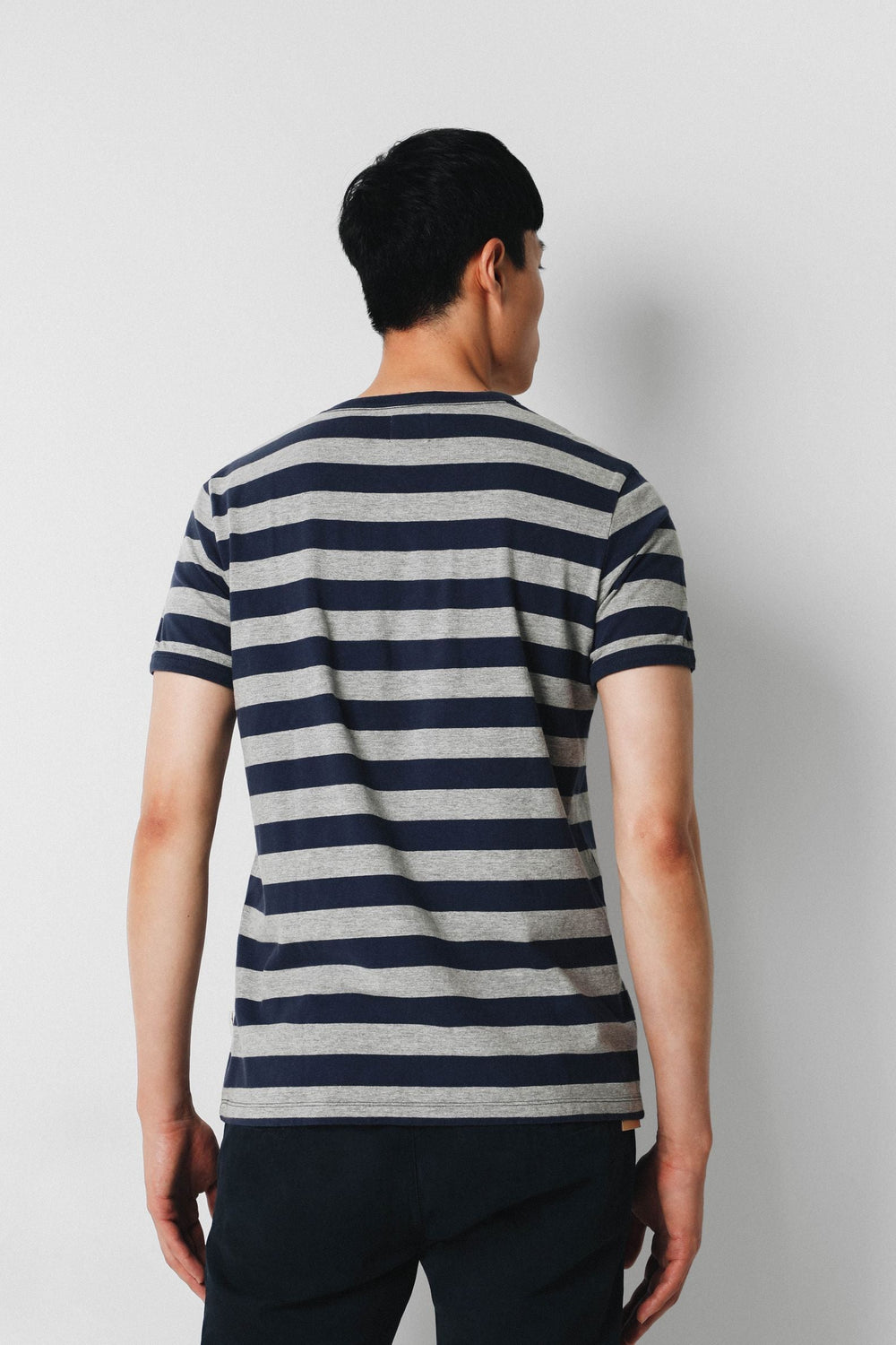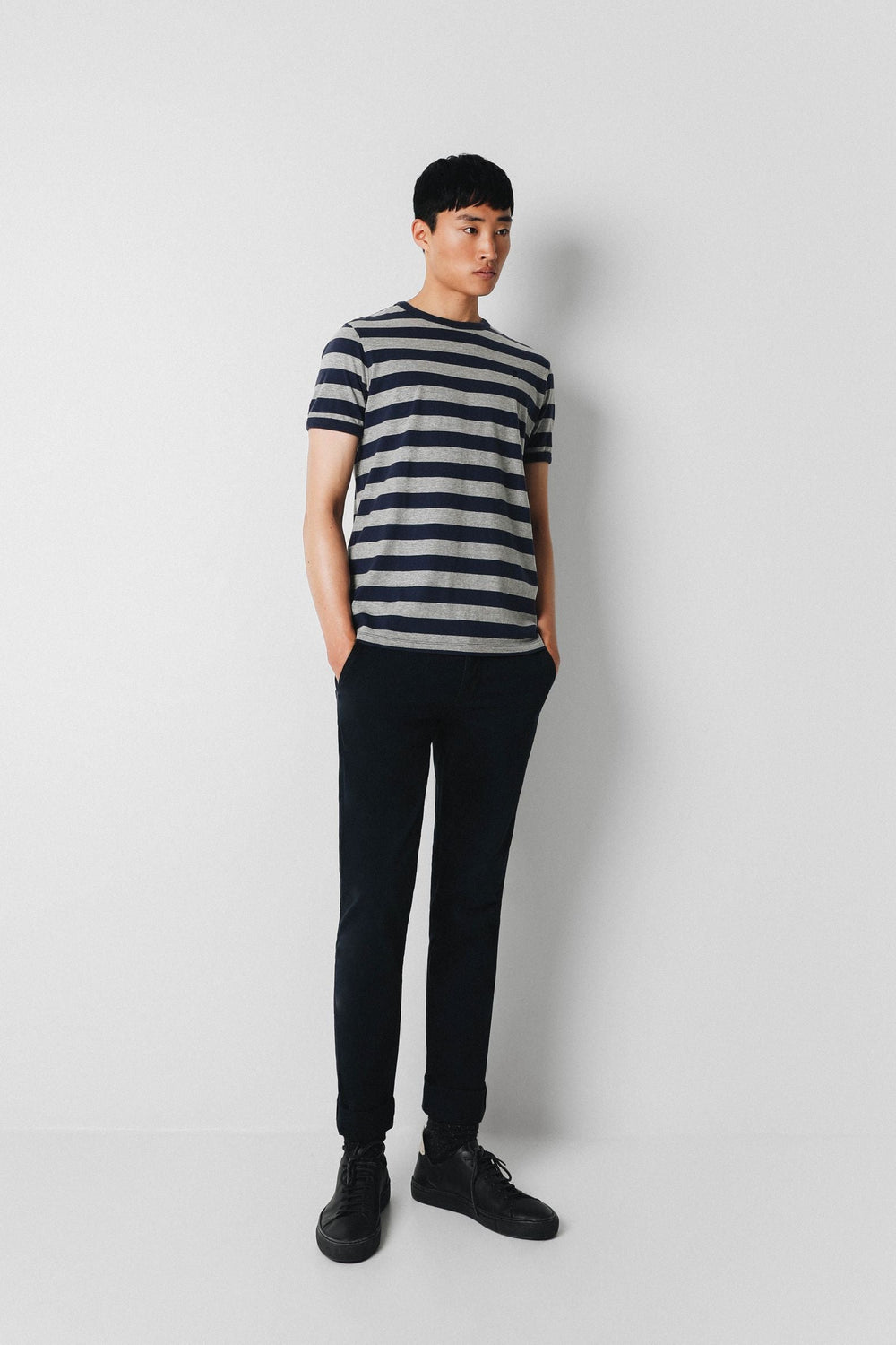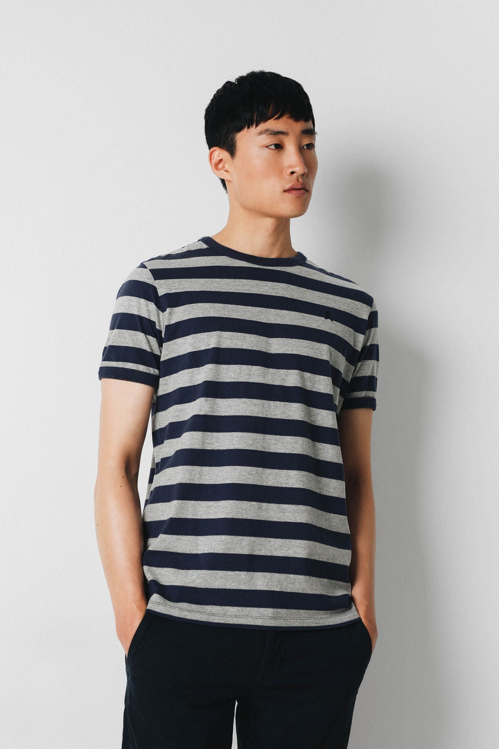 Camiseta con estampado de rayas confeccionada en tejido de algodón. Corte Regular Fit, cuello redondo y manga corta.