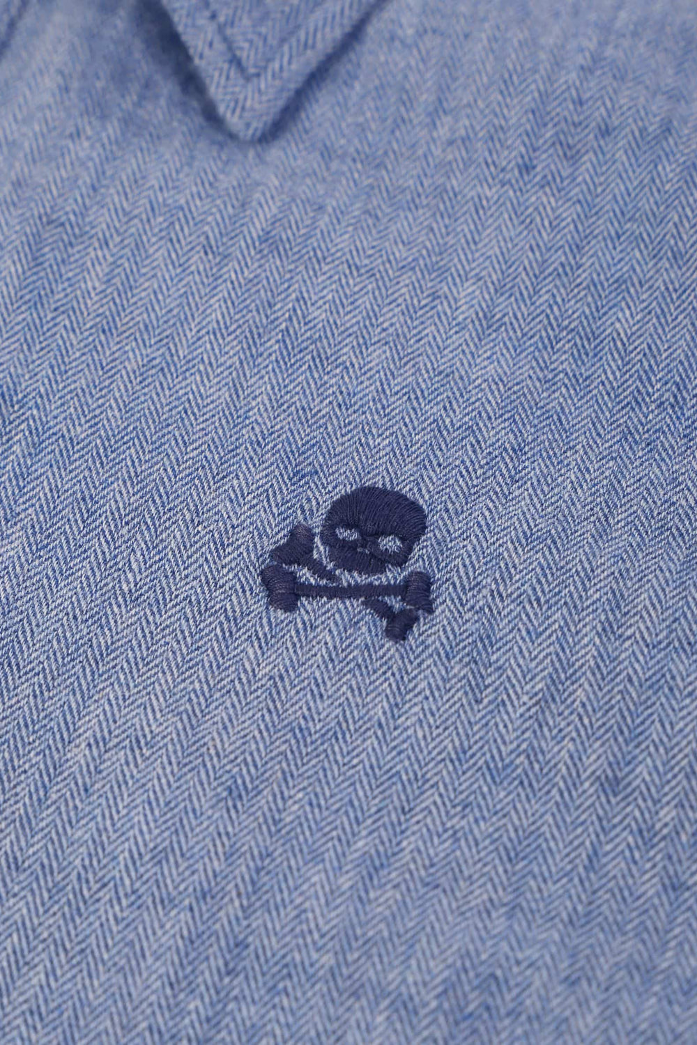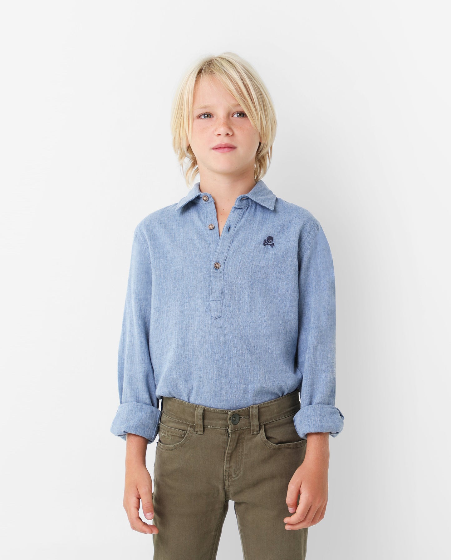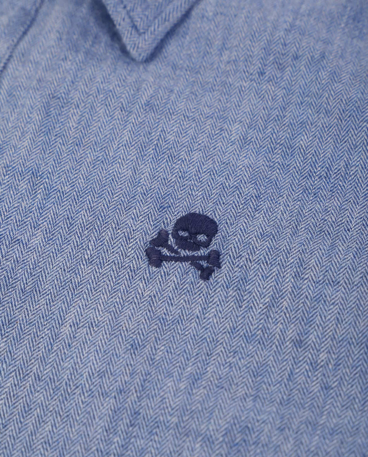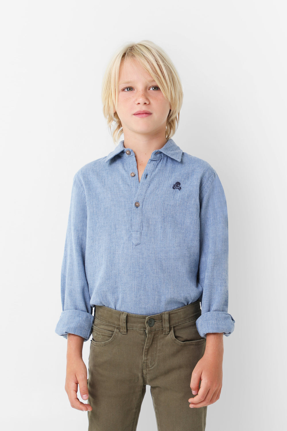 Camisa confeccionada en tejido 100% algodón. Corte Regular Fit, cuello konika tipo polo y botones. Manga larga y detalle de calavera a contraste en el pecho.