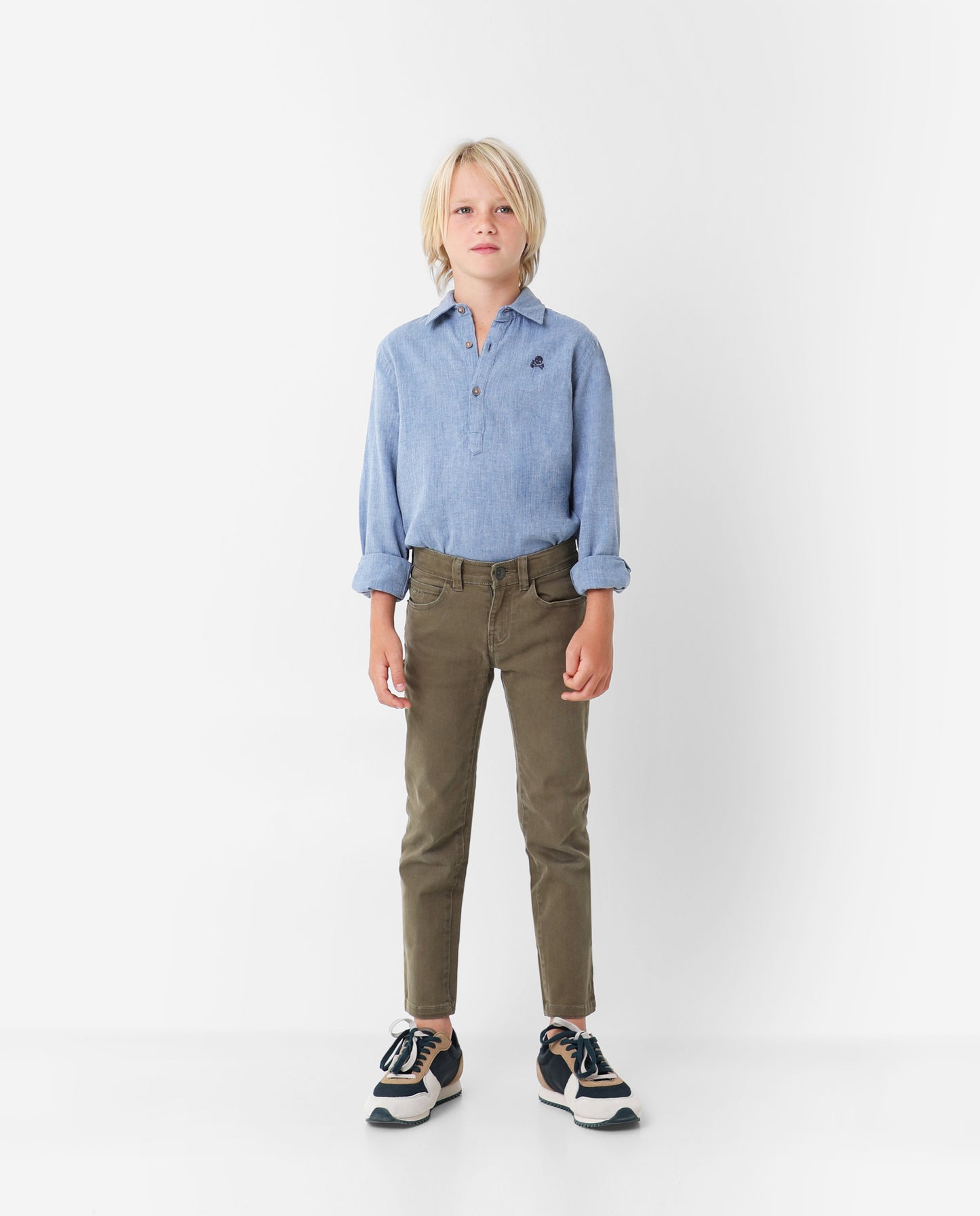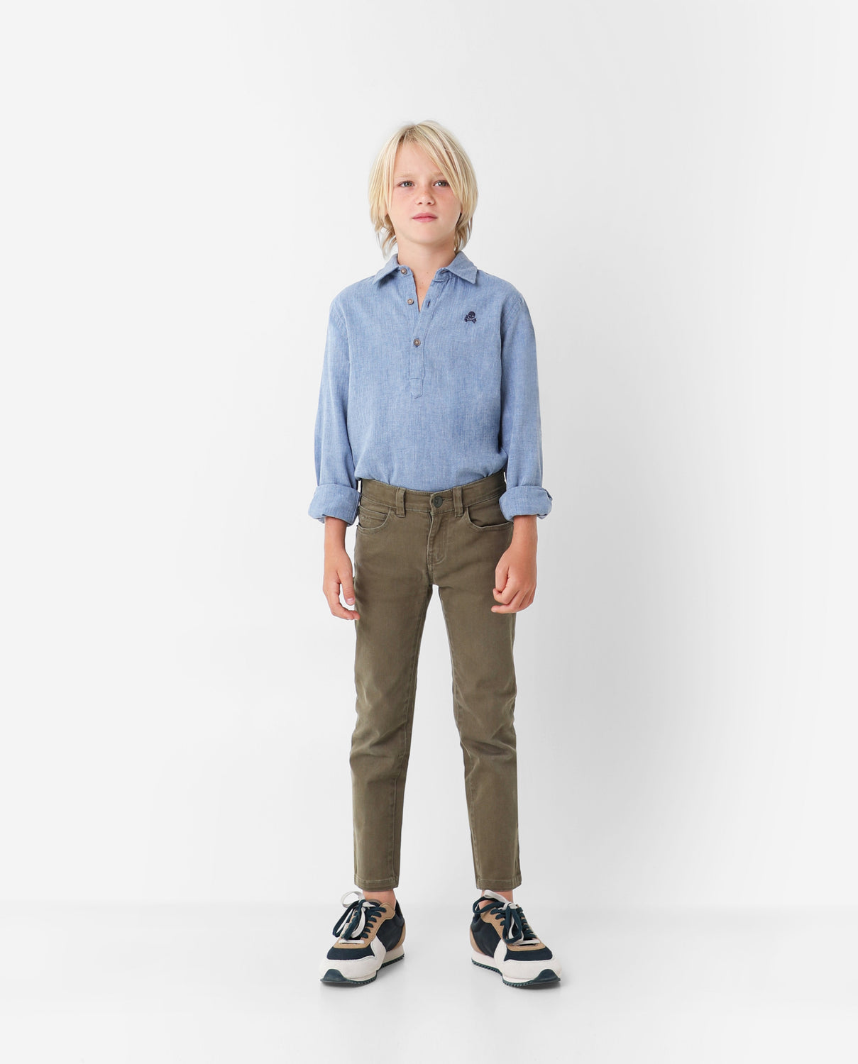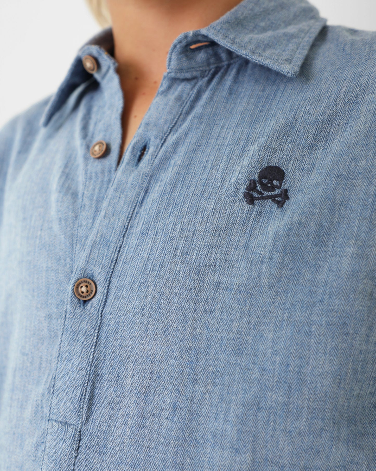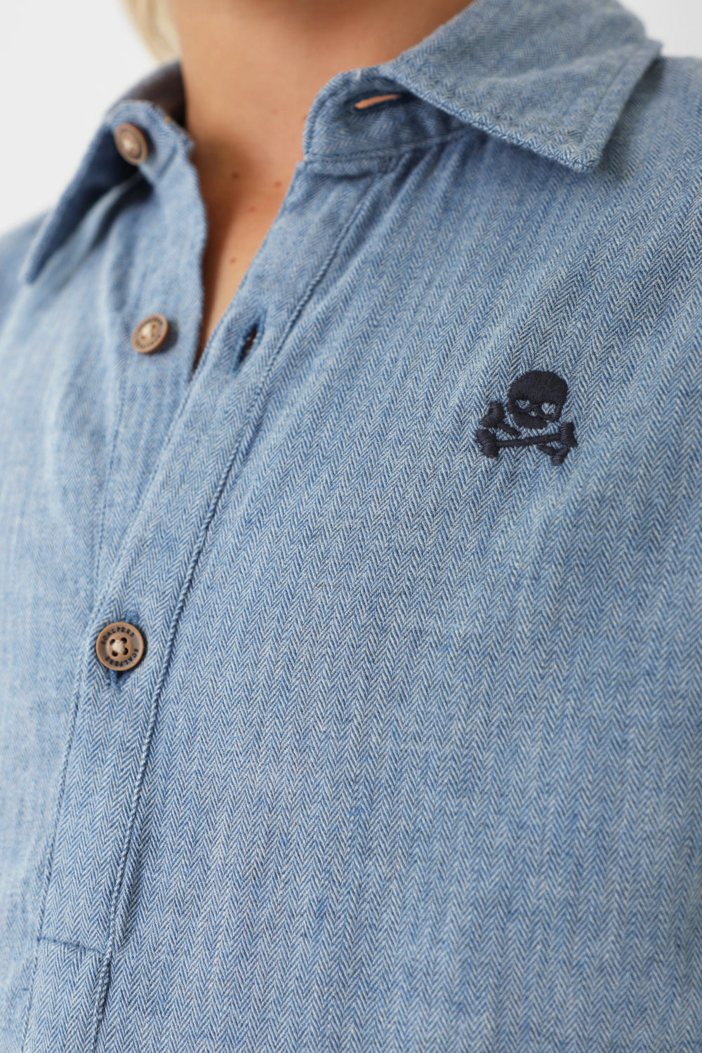 Camisa confeccionada en tejido 100% algodón. Corte Regular Fit, cuello konika tipo polo y botones. Manga larga y detalle de calavera a contraste en el pecho.
