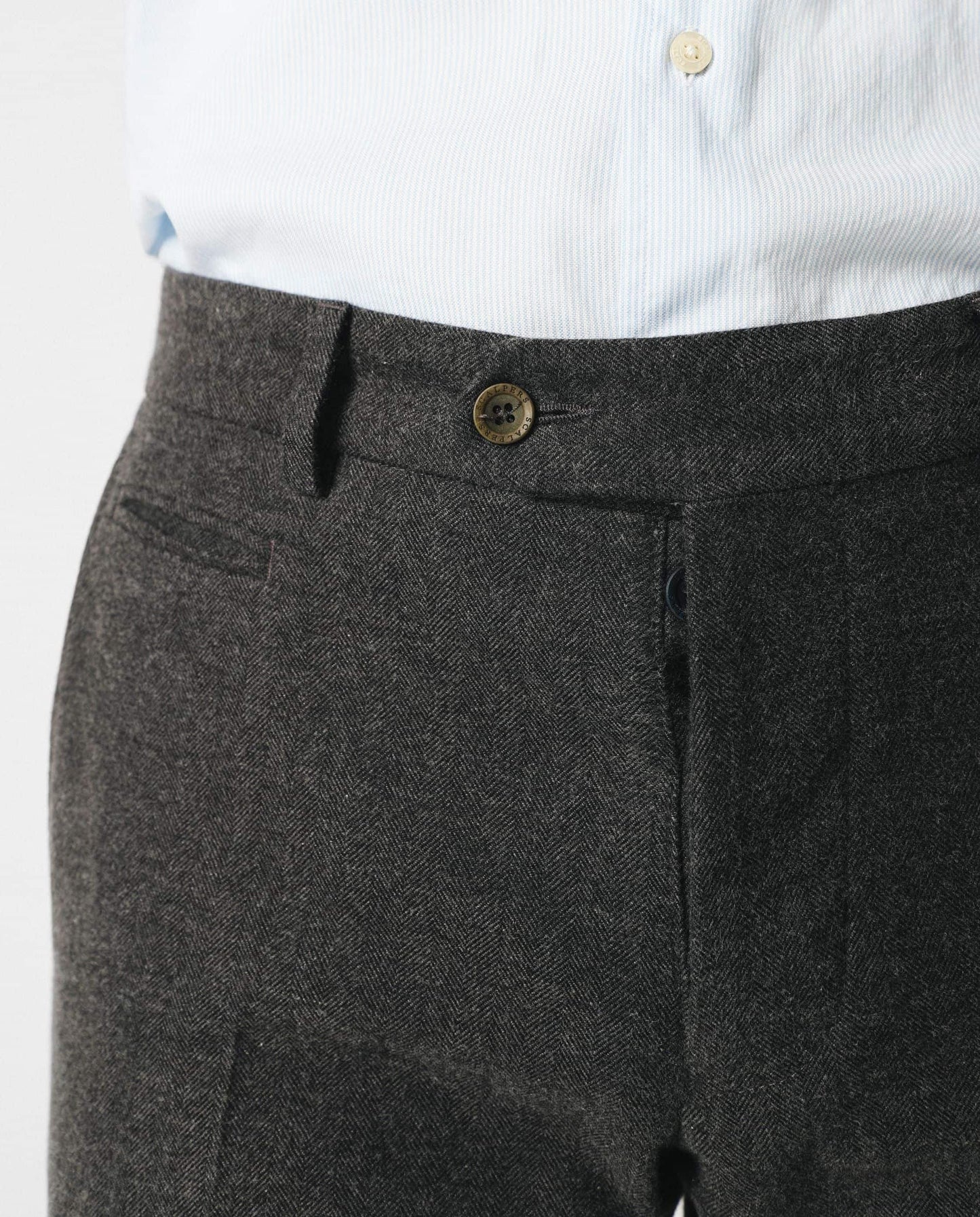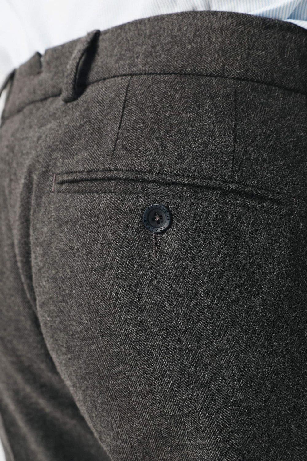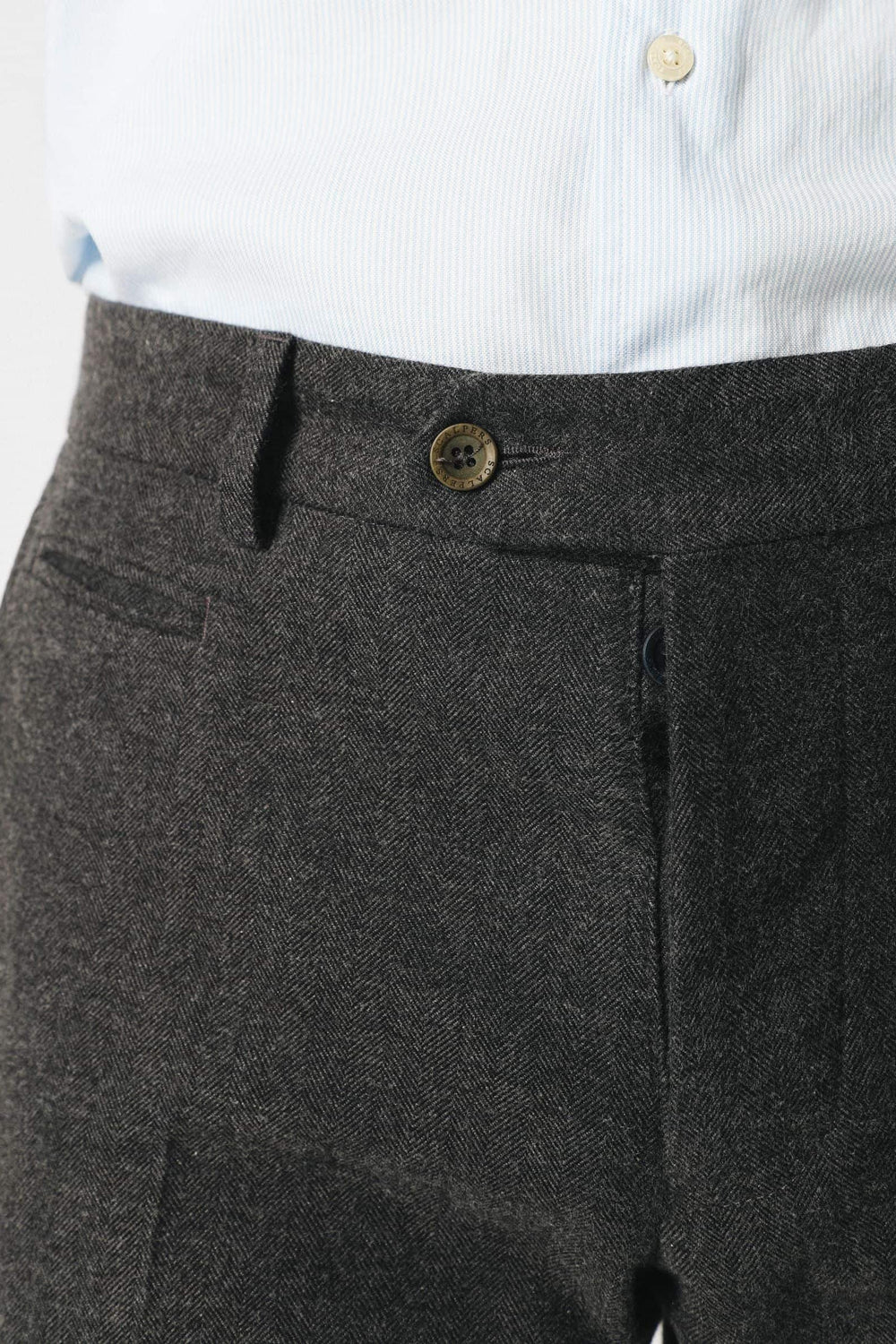 Pantalón confeccionado en tejido franela de algodón de espiga. Corte Regular Fit, cierre con botones de colores y bolsillos. Tiene trabillas.