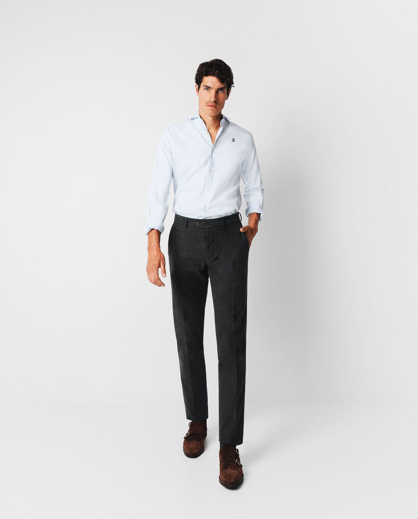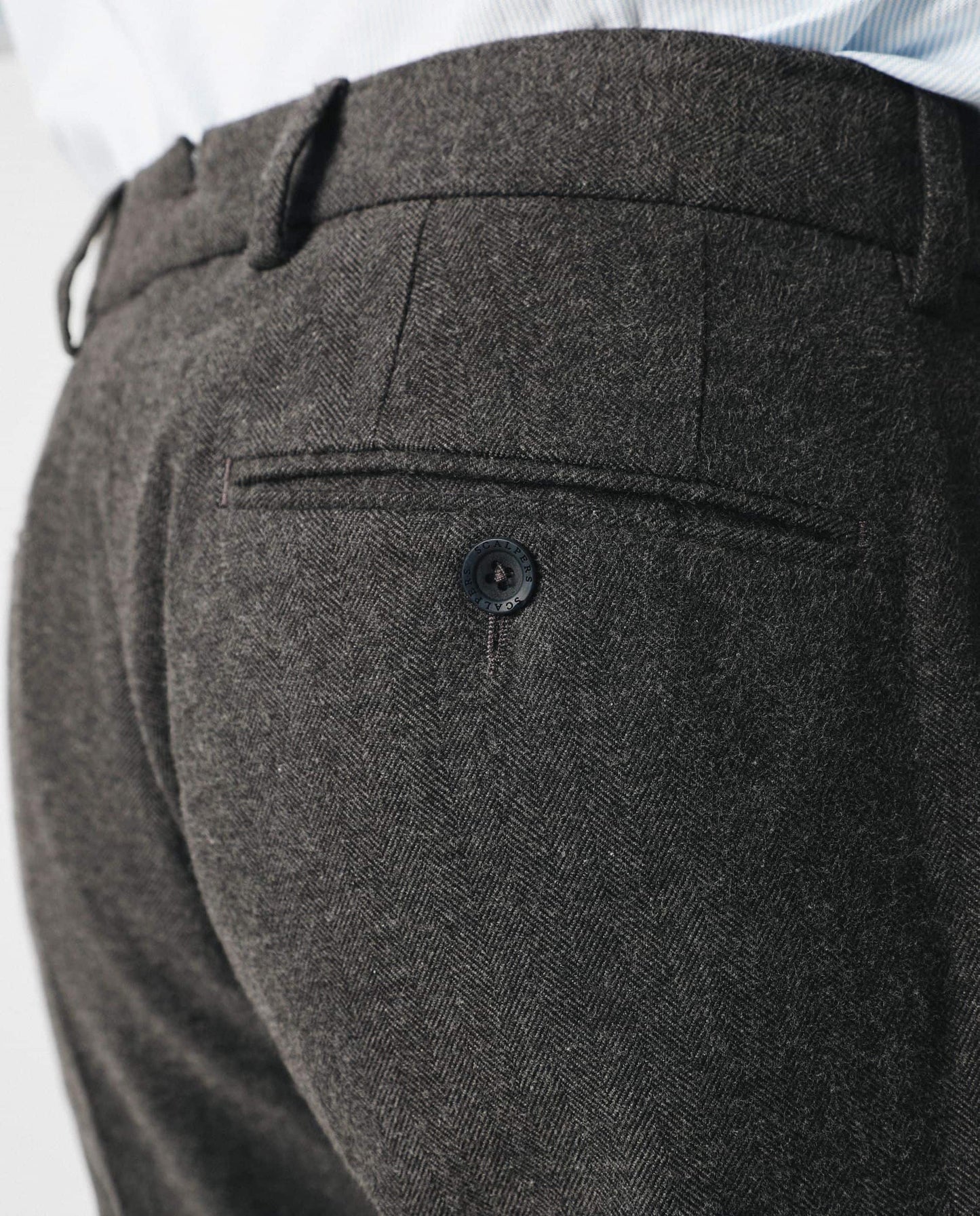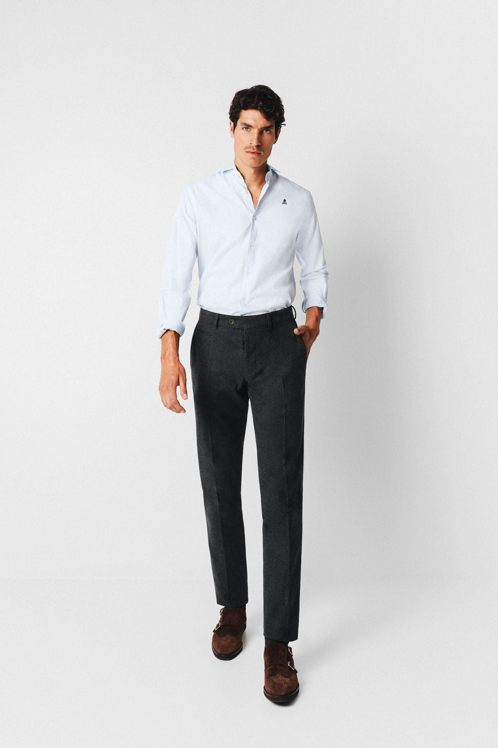 Pantalón confeccionado en tejido franela de algodón de espiga. Corte Regular Fit, cierre con botones de colores y bolsillos. Tiene trabillas.