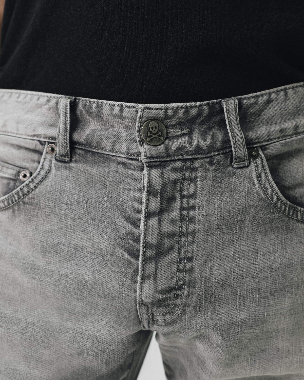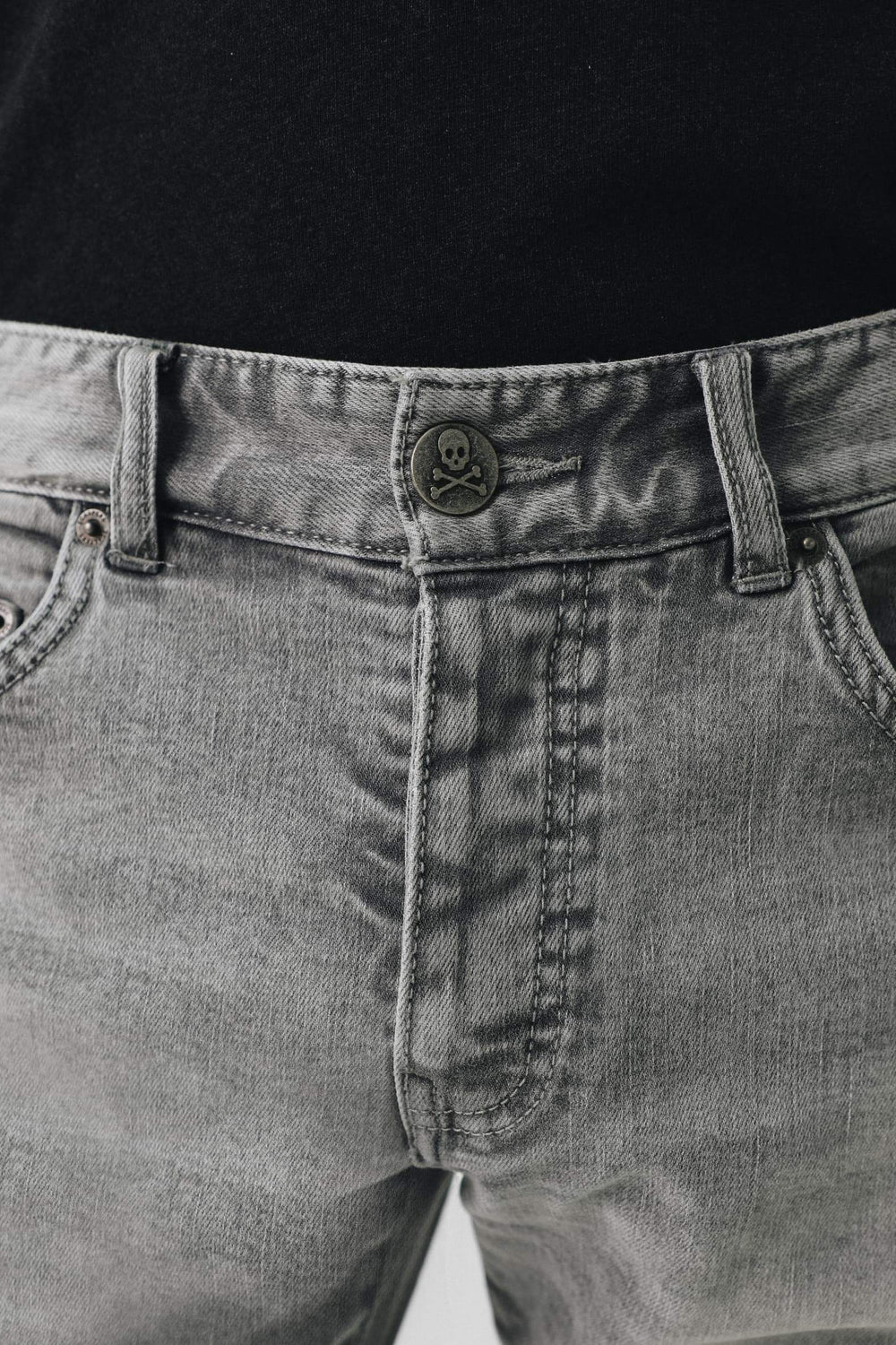 Pantalón vaquero de efecto lavado. Corte Slim Fit, cierre con botón y cremallera oculta por tapeta. Cinco bolsillos delanteros, traseros y cerillero. Tiene trabillas y detalle de huesos bordados en la parte trasera.