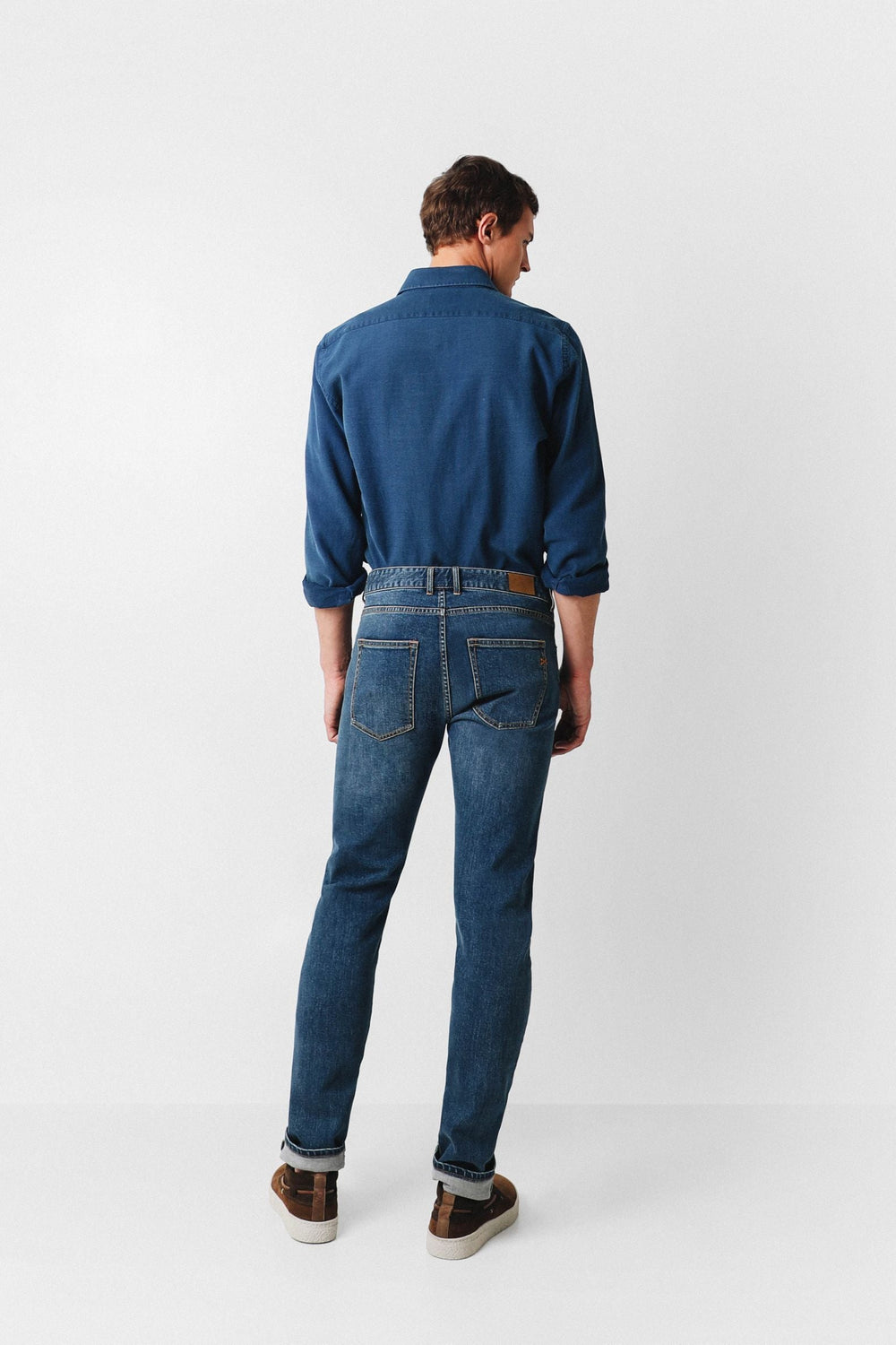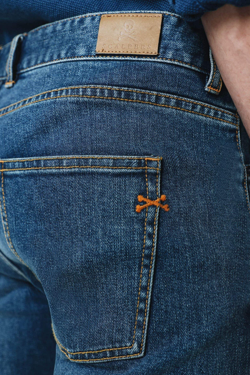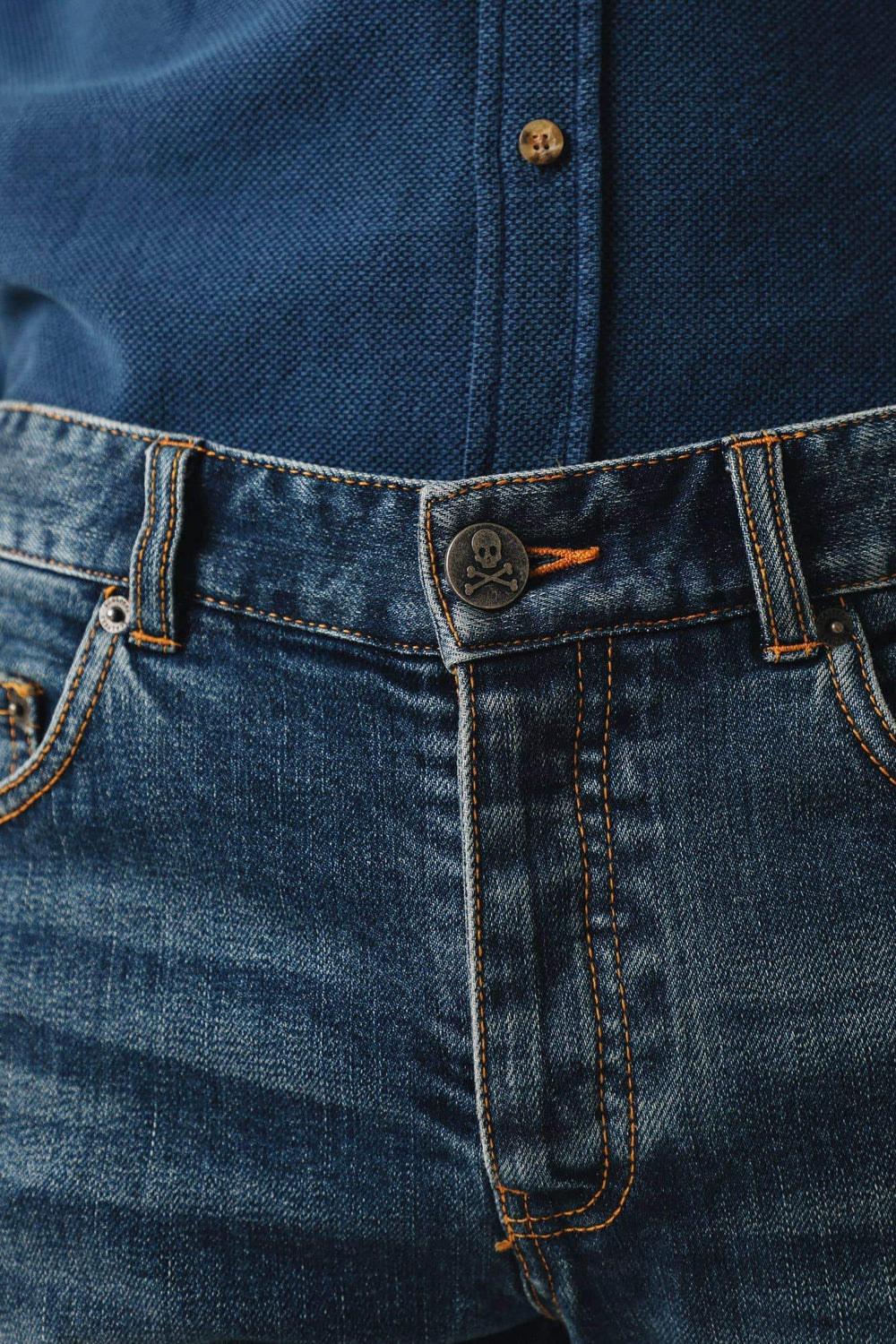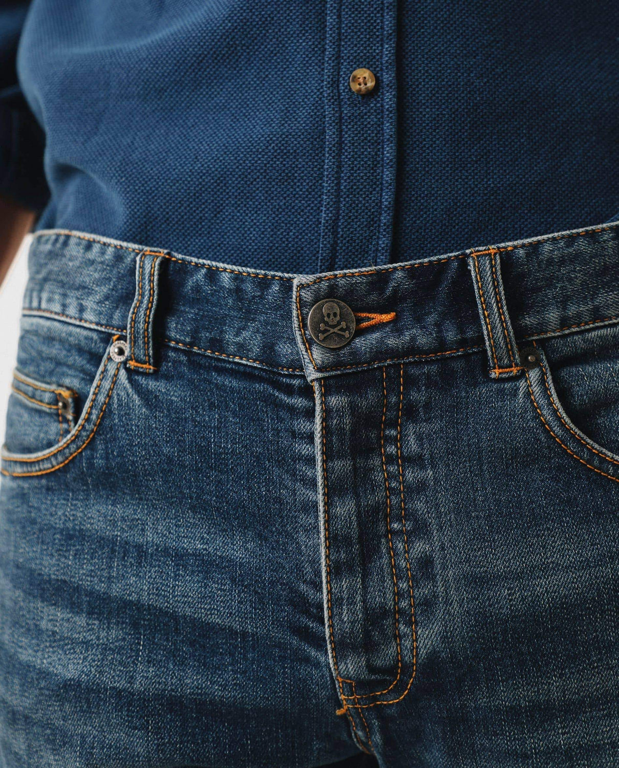Pantalón vaquero de efecto lavado. Corte Slim Fit, cierre con botones ocultos por tapeta. Cinco bolsillos delanteros, traseros y cerillero. Tiene trabillas y detalle de huesos bordados en la parte trasera.