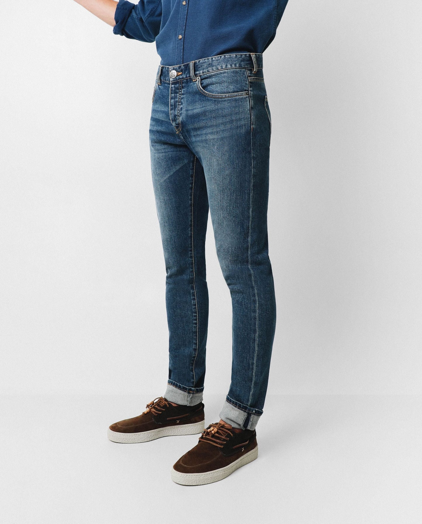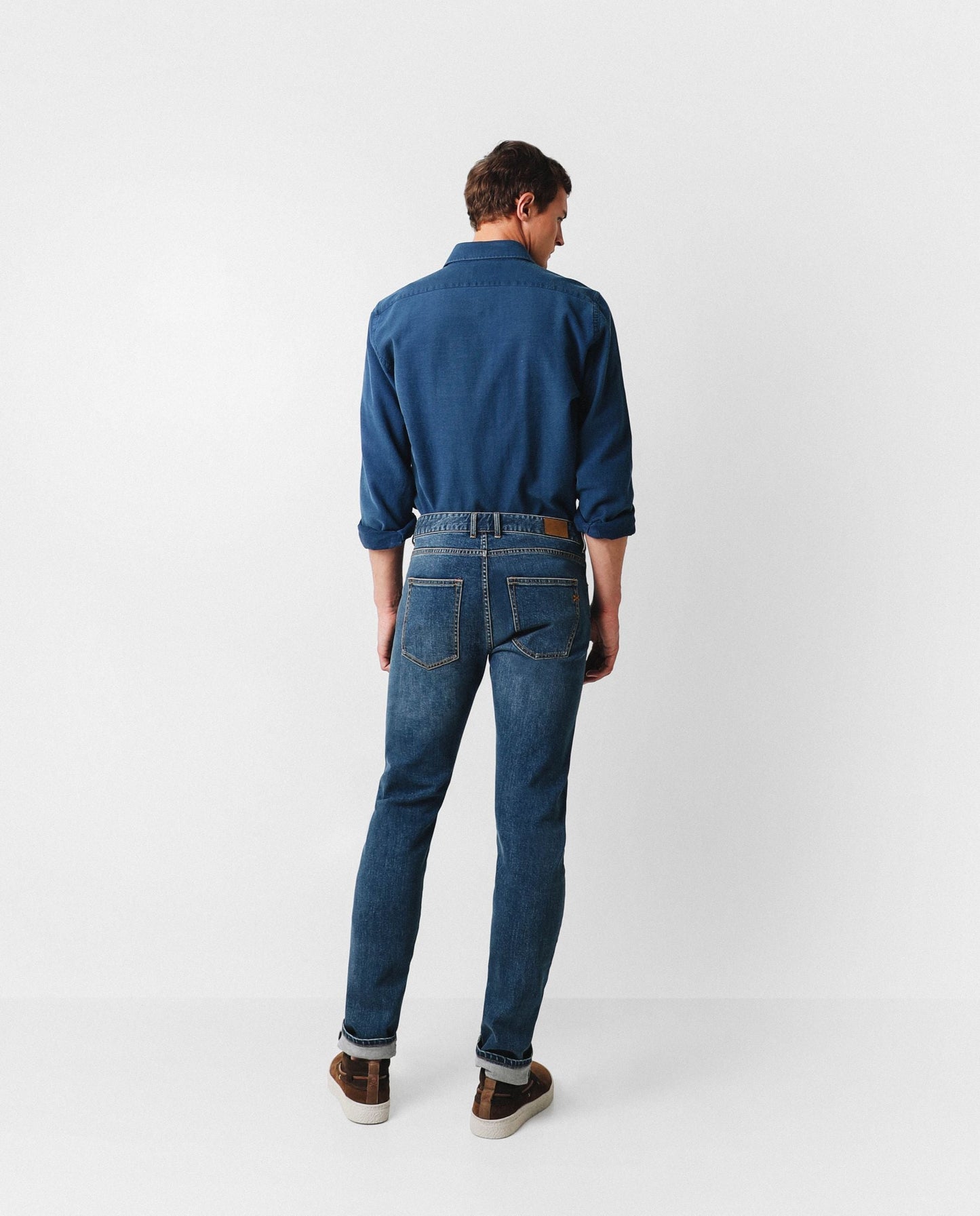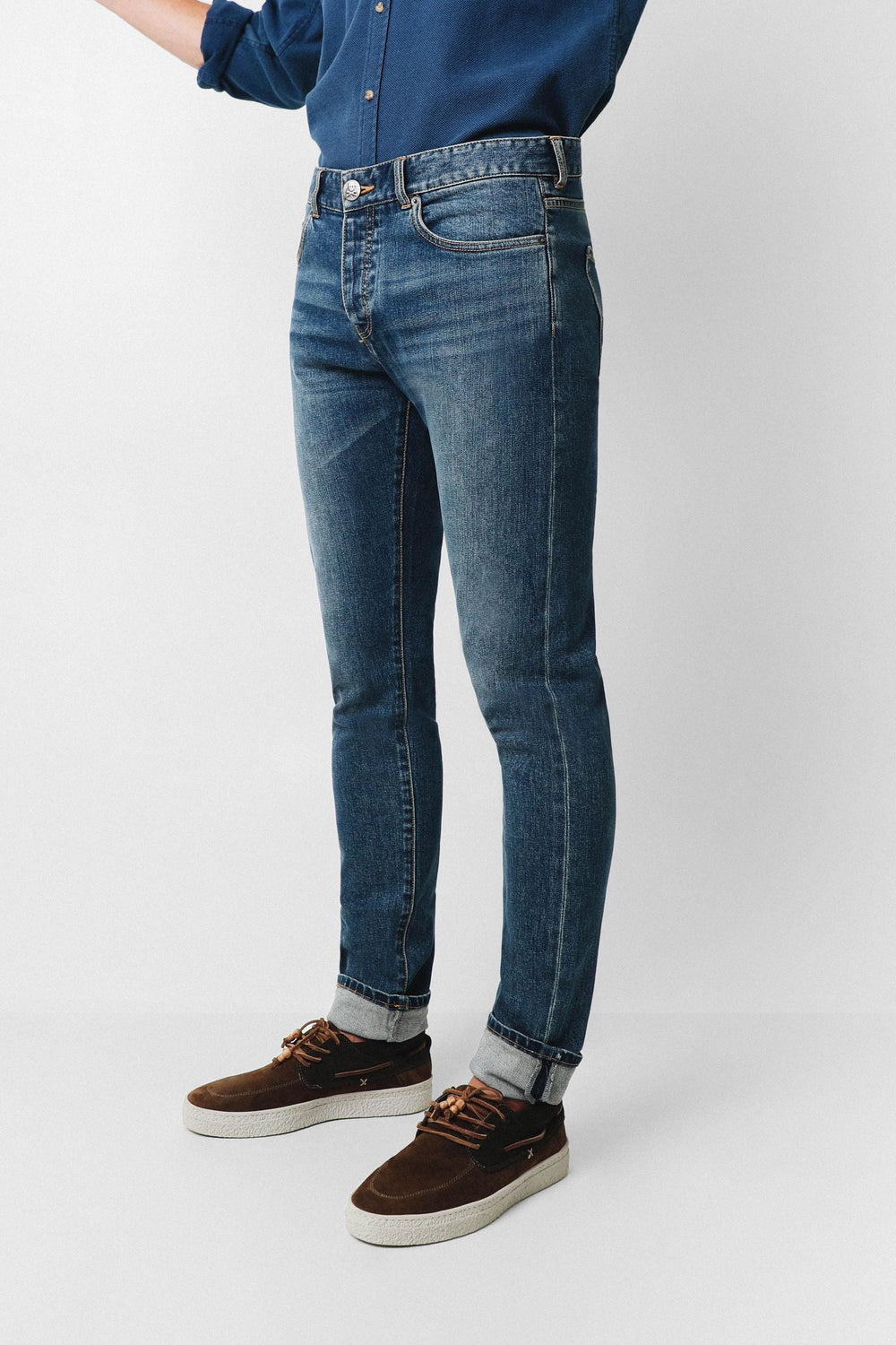 Pantalón vaquero de efecto lavado. Corte Slim Fit, cierre con botones ocultos por tapeta. Cinco bolsillos delanteros, traseros y cerillero. Tiene trabillas y detalle de huesos bordados en la parte trasera.