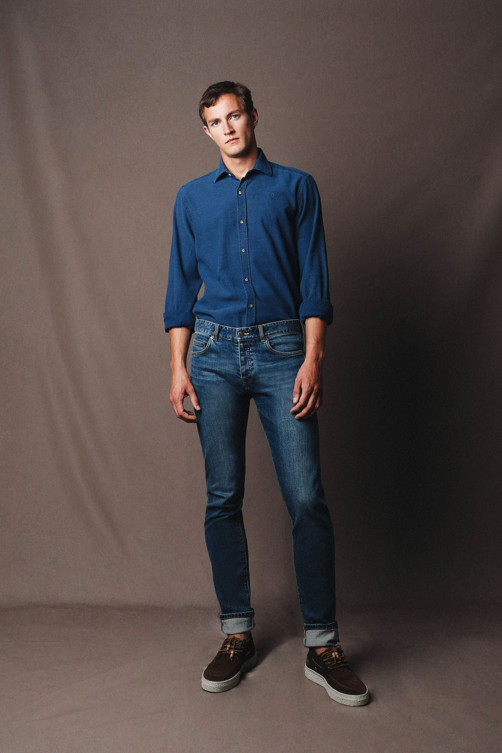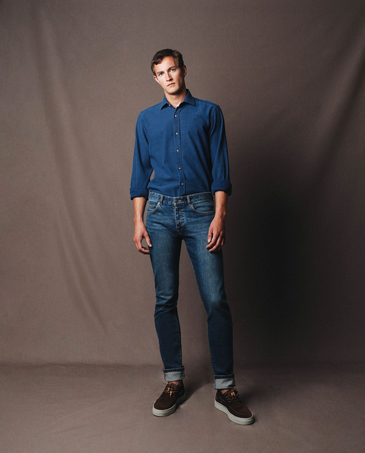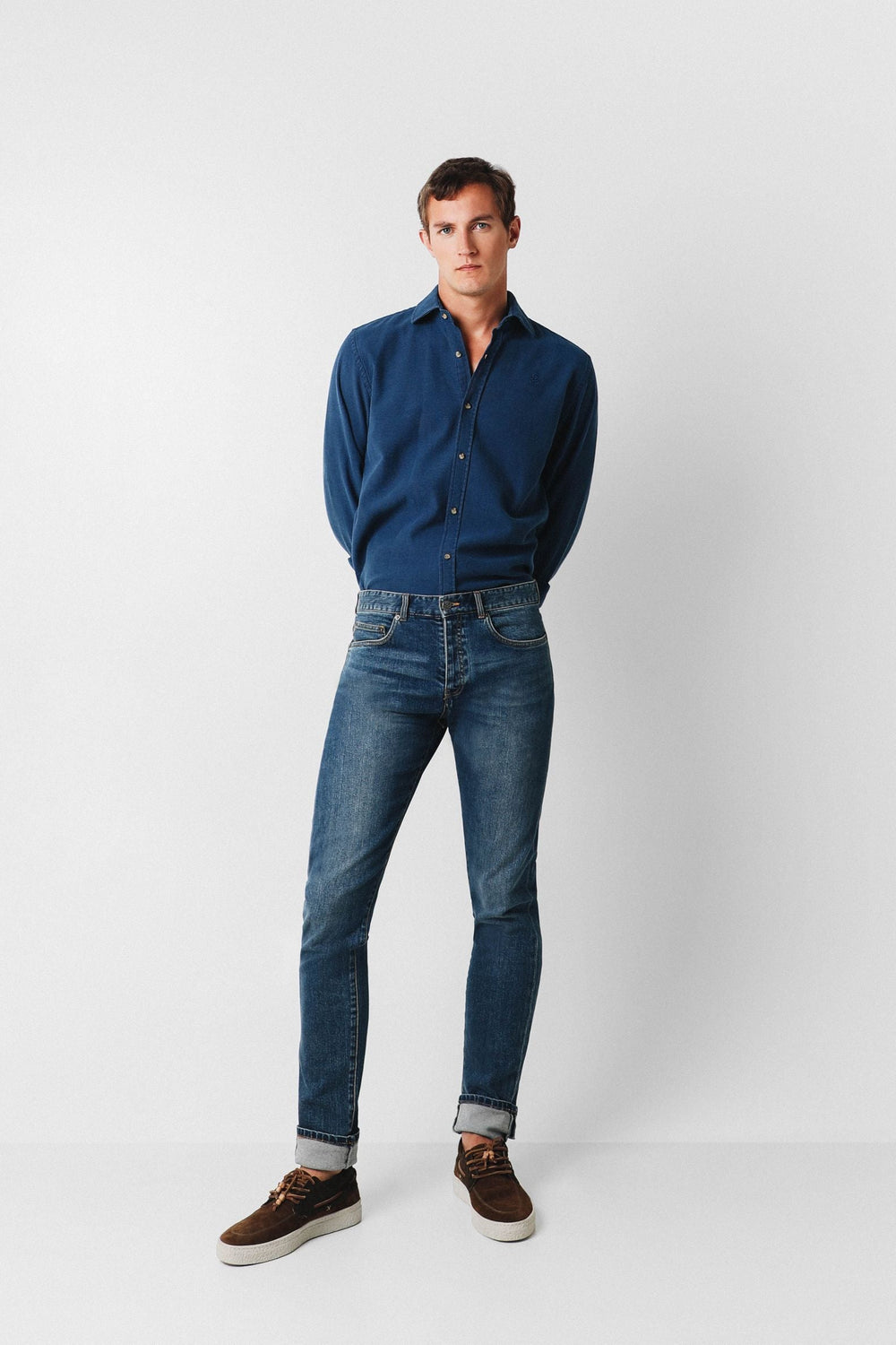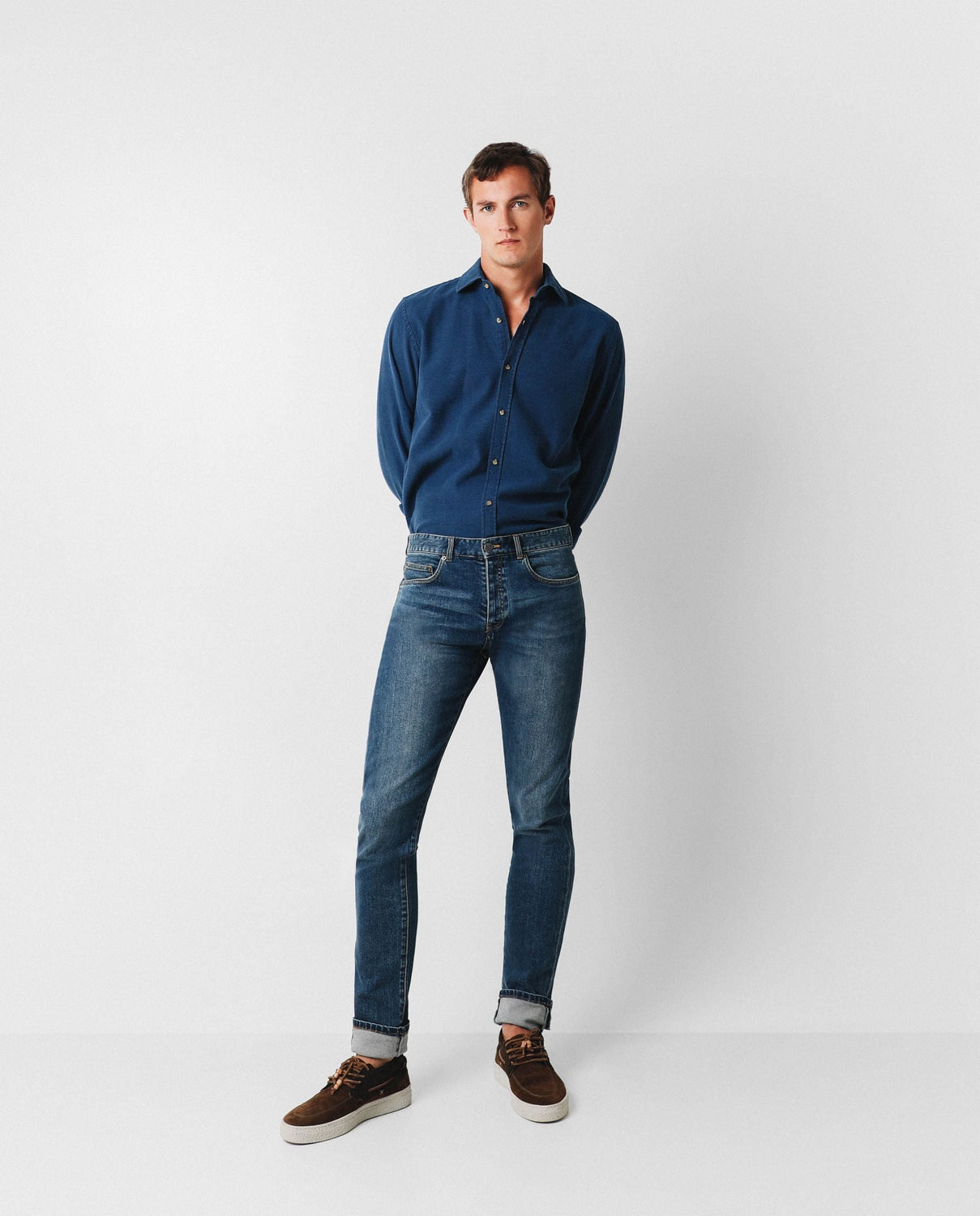 Pantalón vaquero de efecto lavado. Corte Slim Fit, cierre con botones ocultos por tapeta. Cinco bolsillos delanteros, traseros y cerillero. Tiene trabillas y detalle de huesos bordados en la parte trasera.