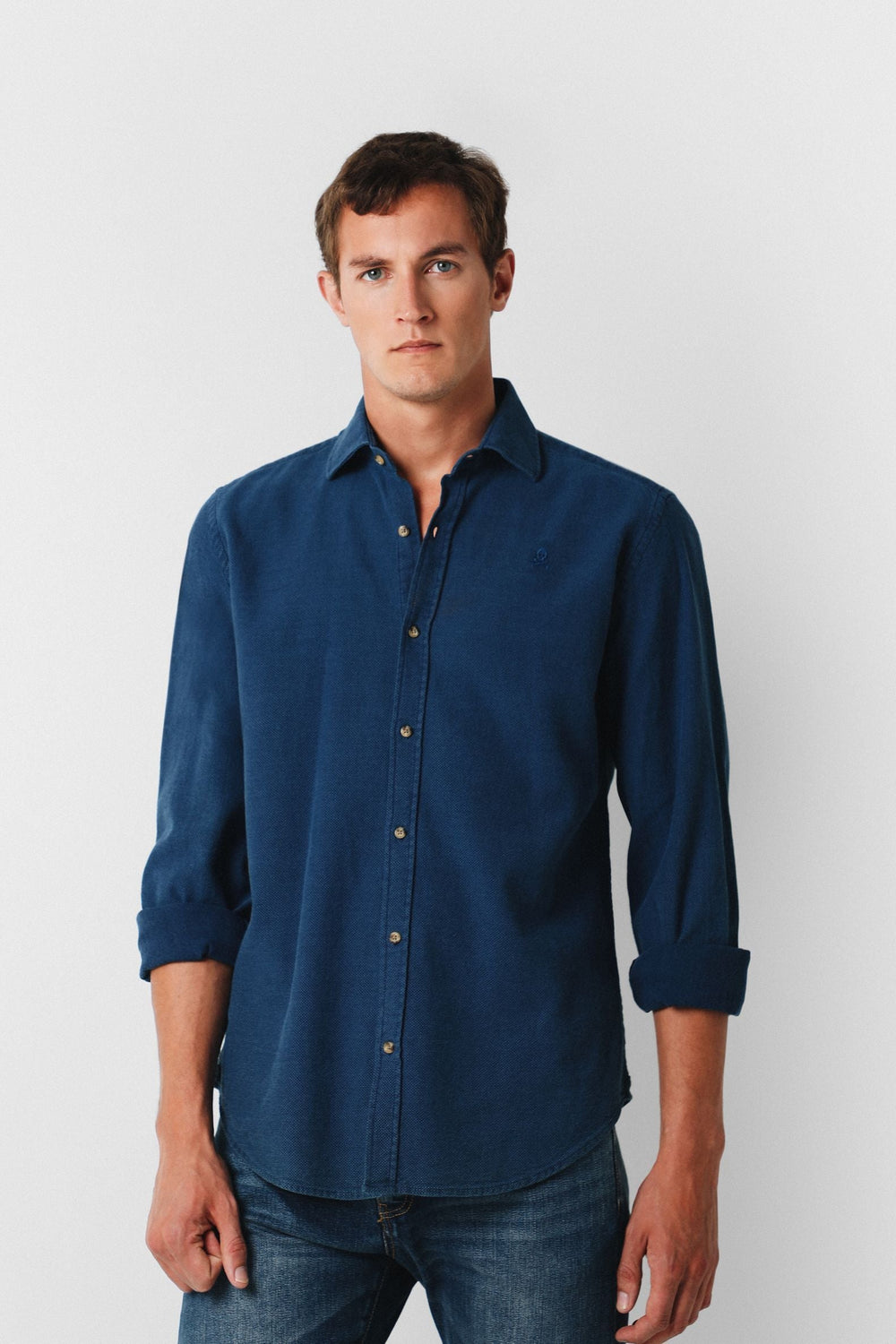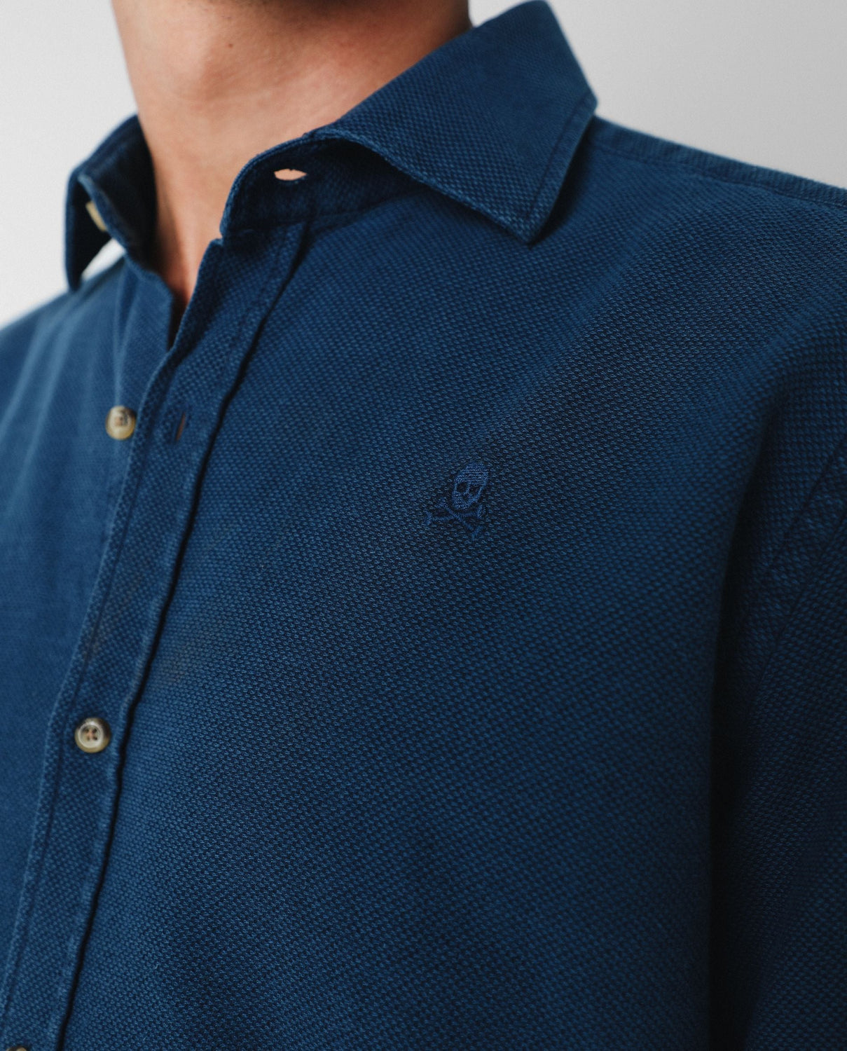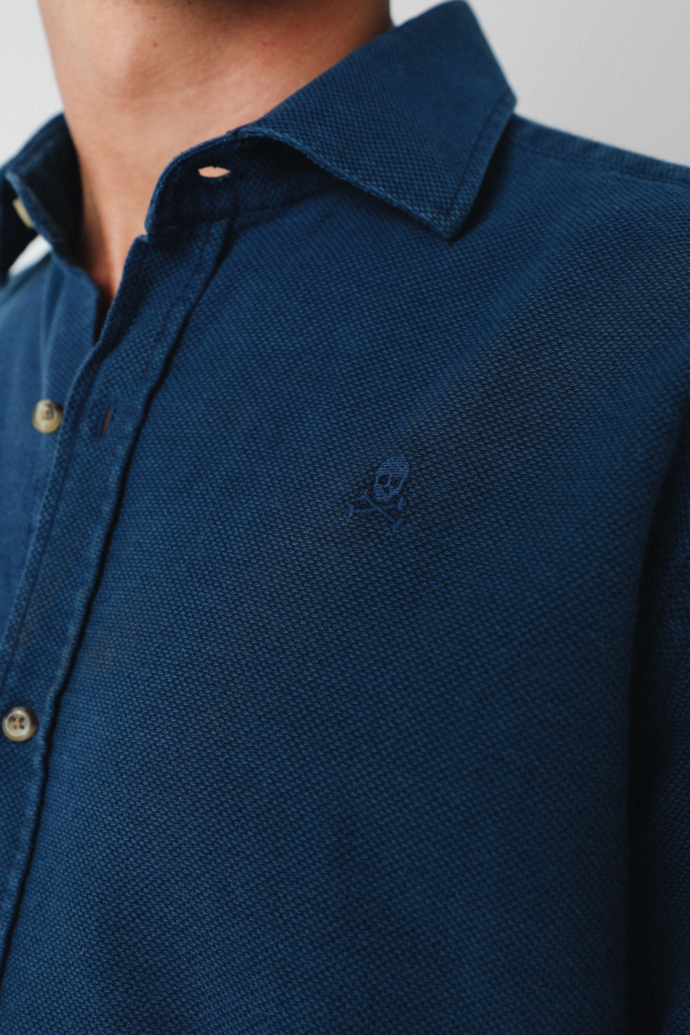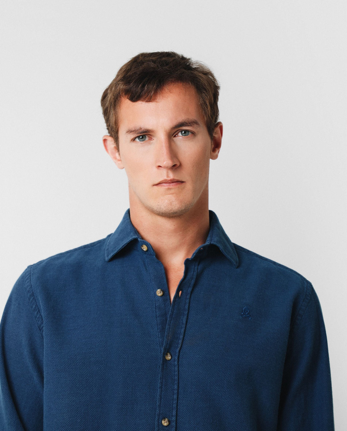 Camisa confeccionada en tejido denim. Corte Regular Fit, cuello konika y cierre con botones. Manga larga terminada en puño simple. Detalle de calavera bordada en el pecho.