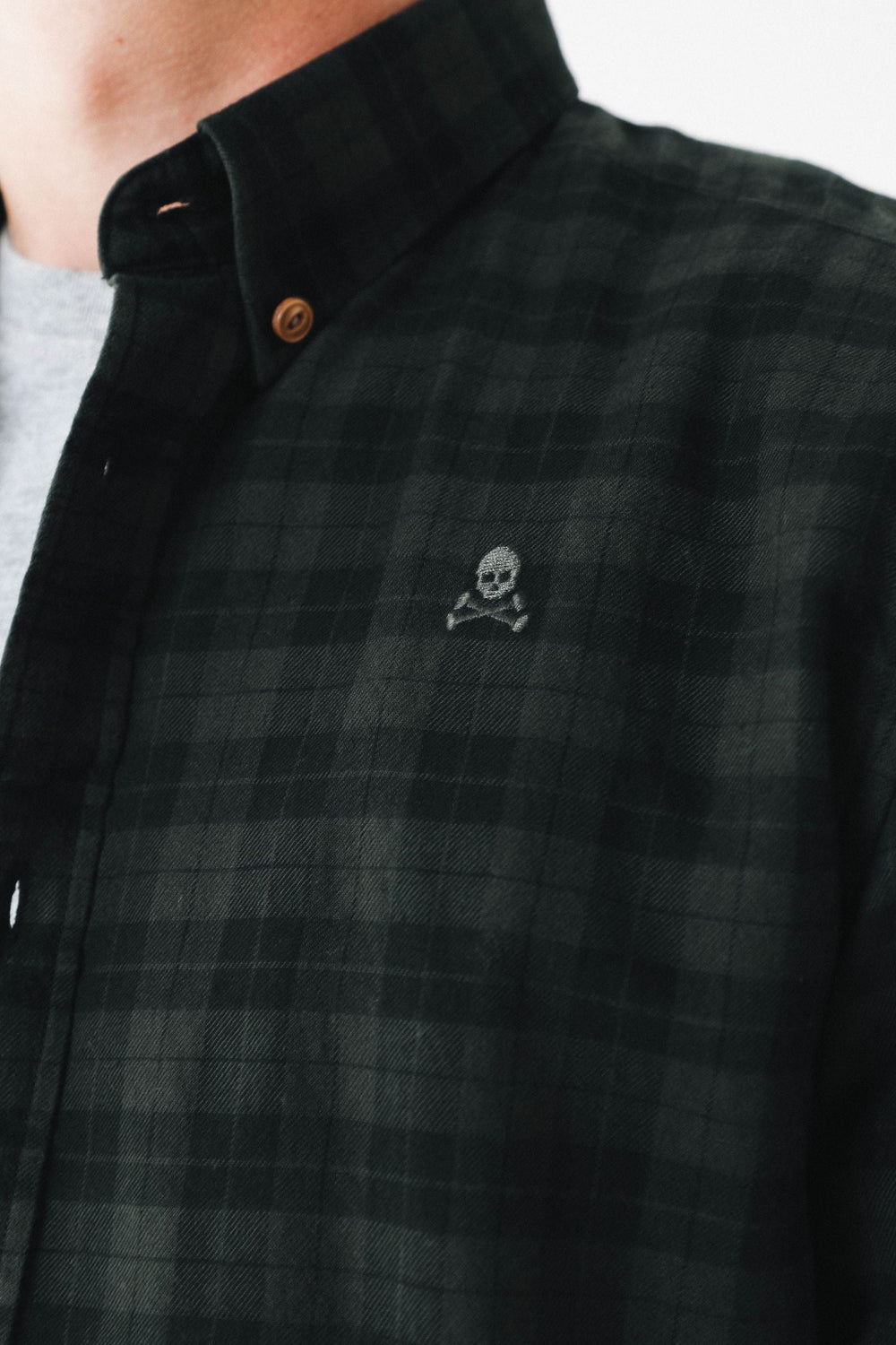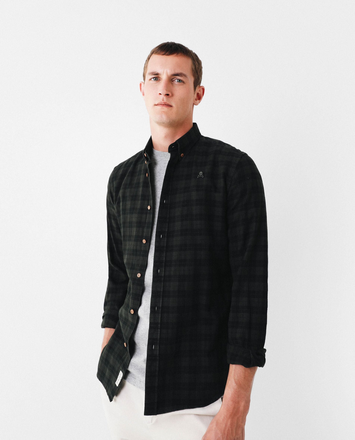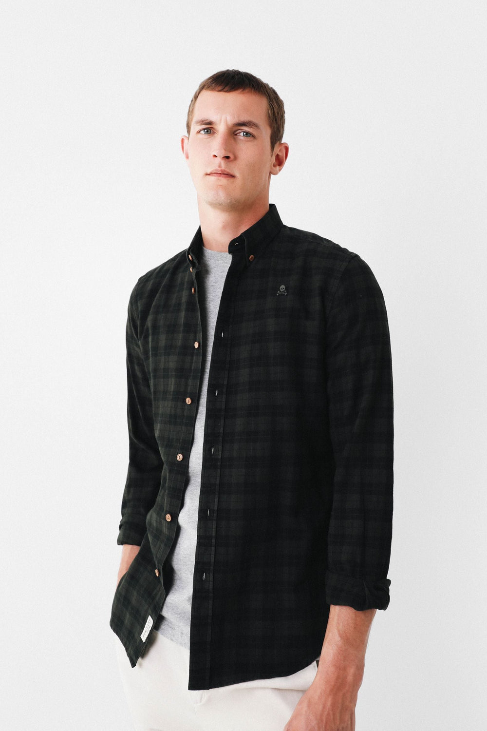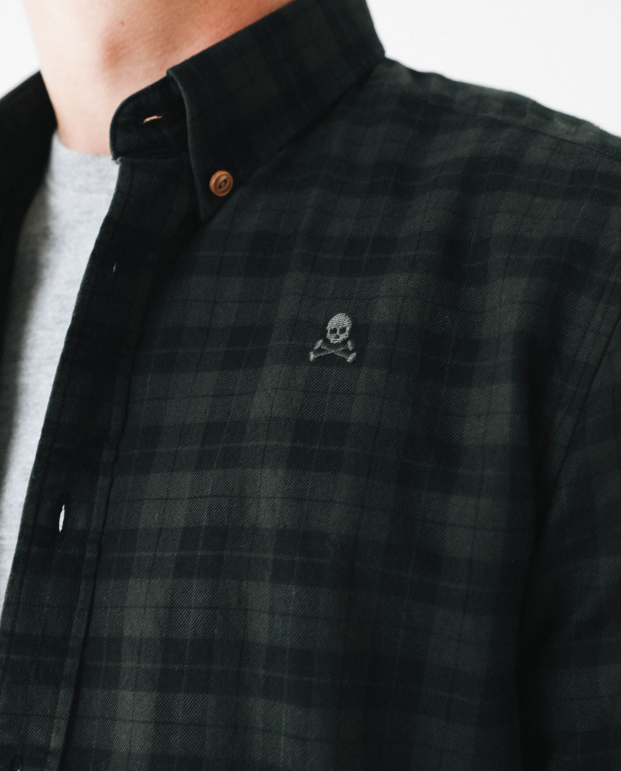 Camisa de cuadros garment dyed confeccionada en tejido 100% algodón. Corte Regular Fit, cuello Button Down y cierre con botones. Manga larga terminada en puño y detalle de calavera bordada en el pecho.