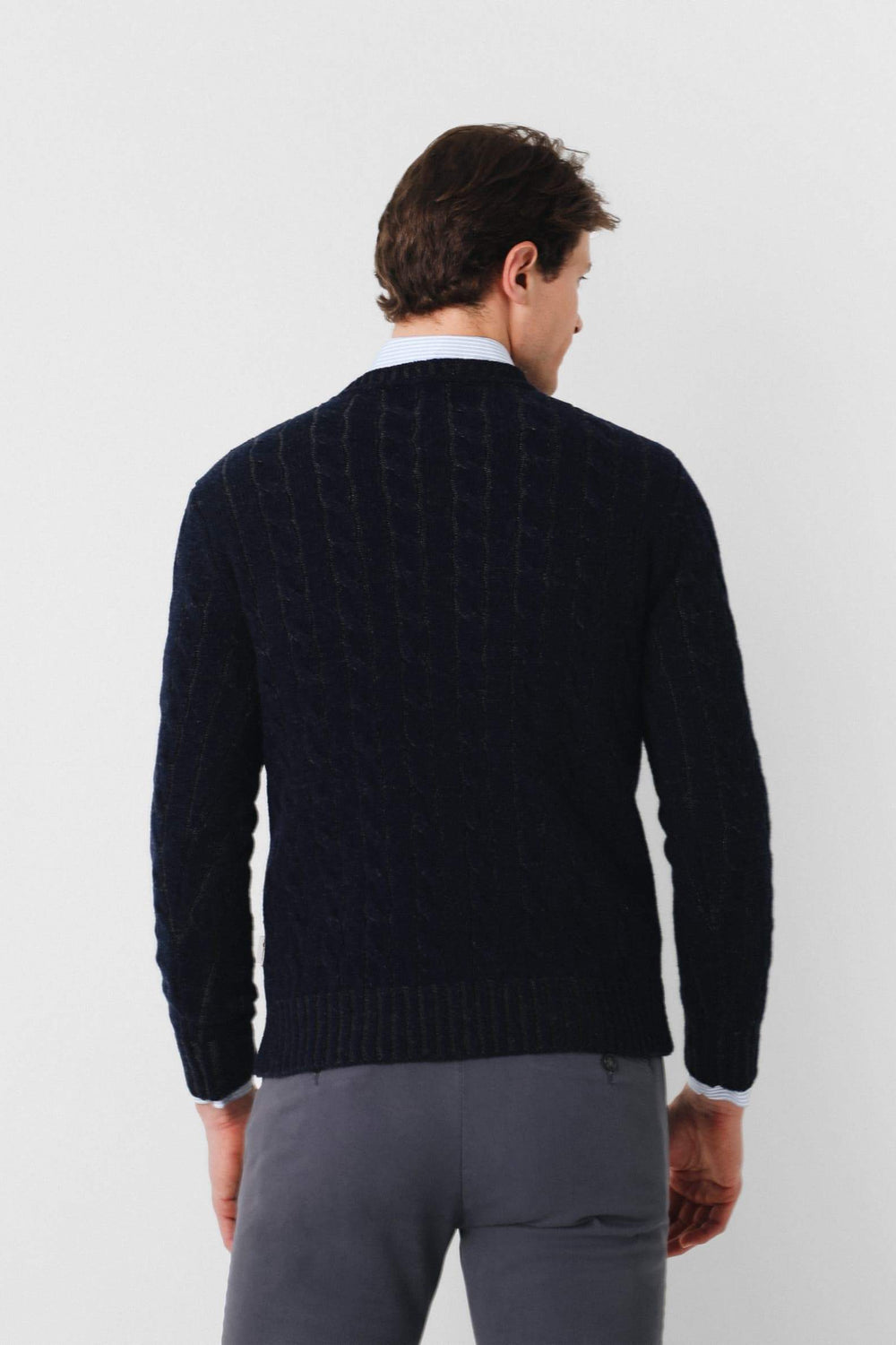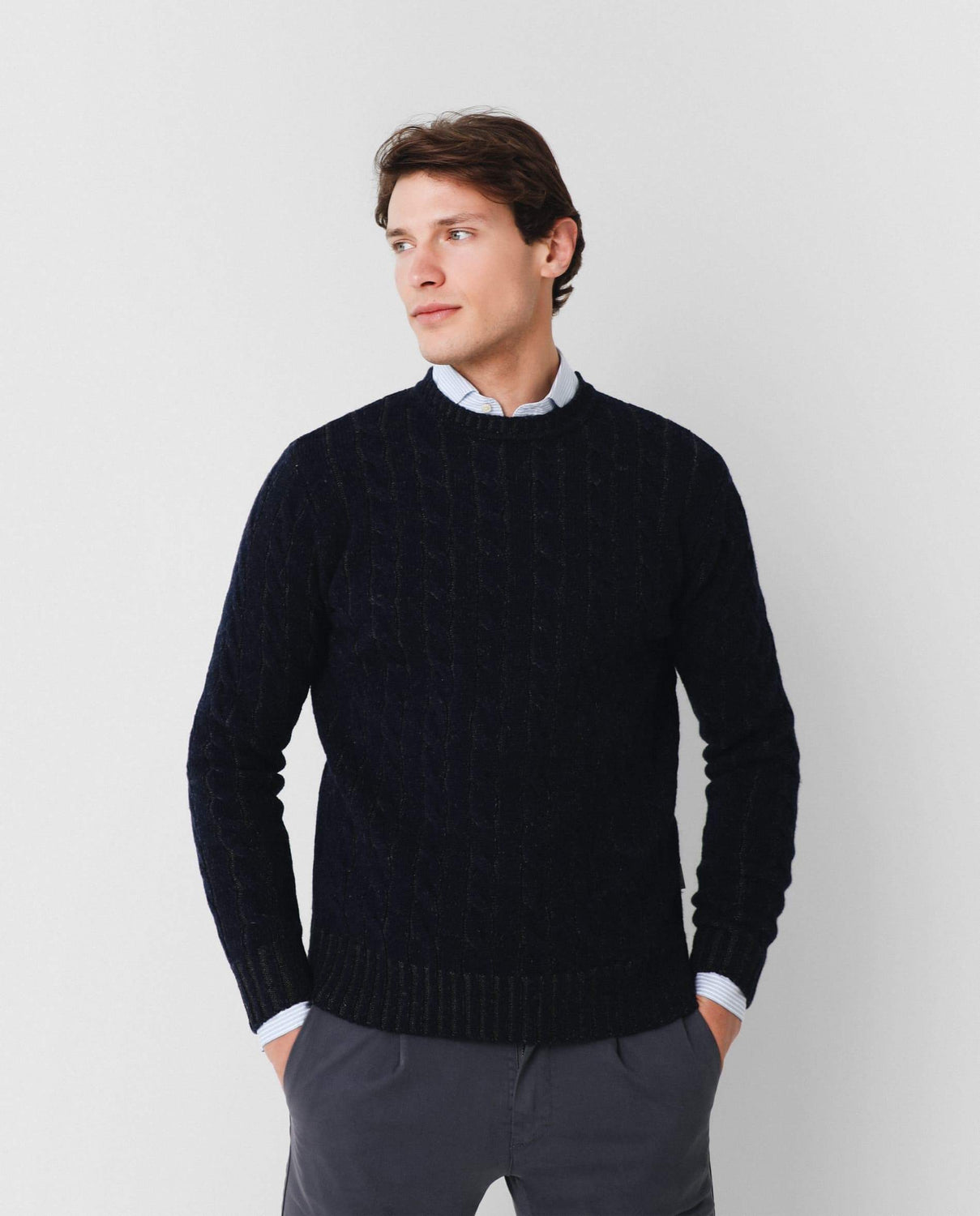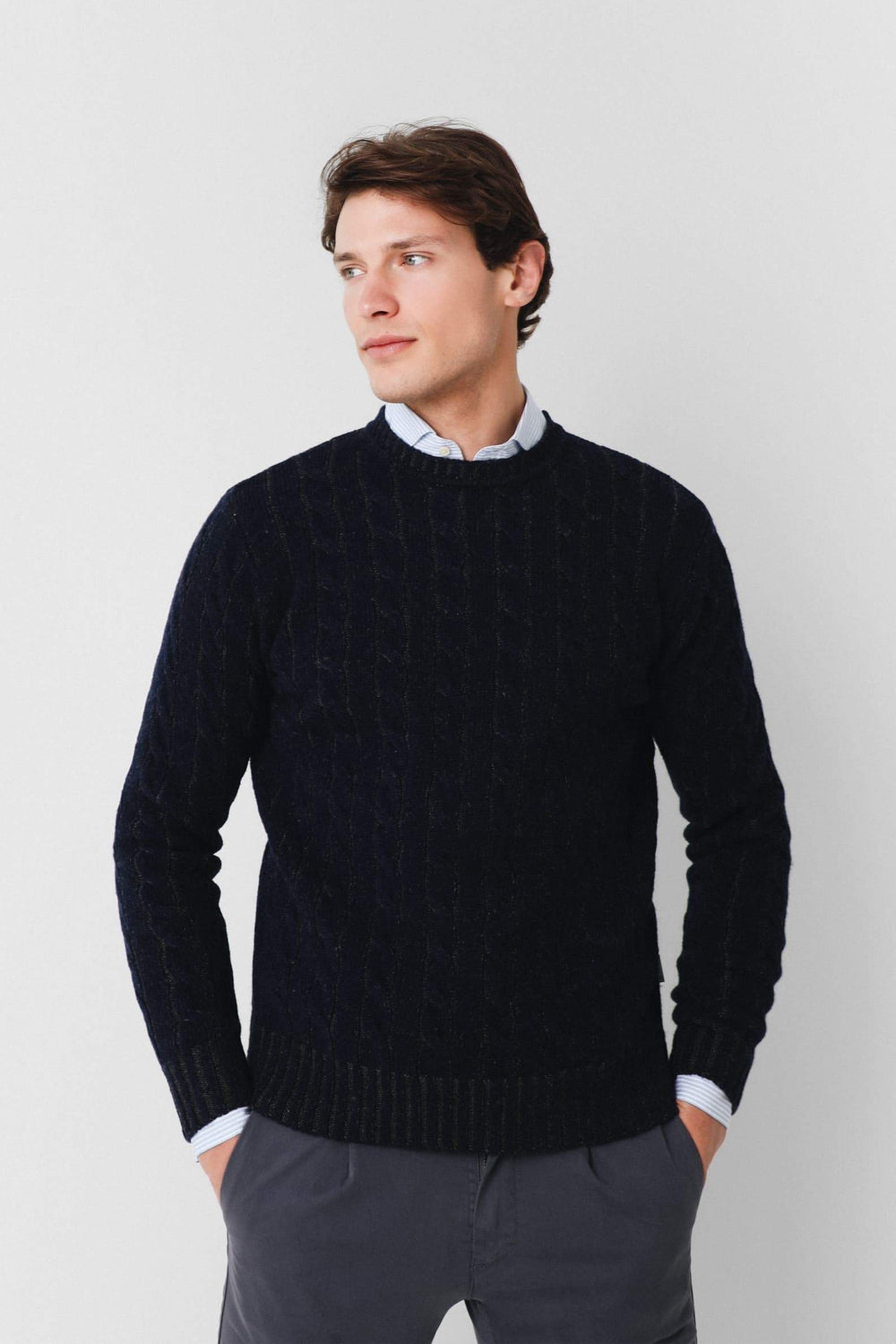 Jersey trenzado en dos tonos de hilo confeccionado en lana merino. Corte Regular Fit, cuello redondo y manga larga.