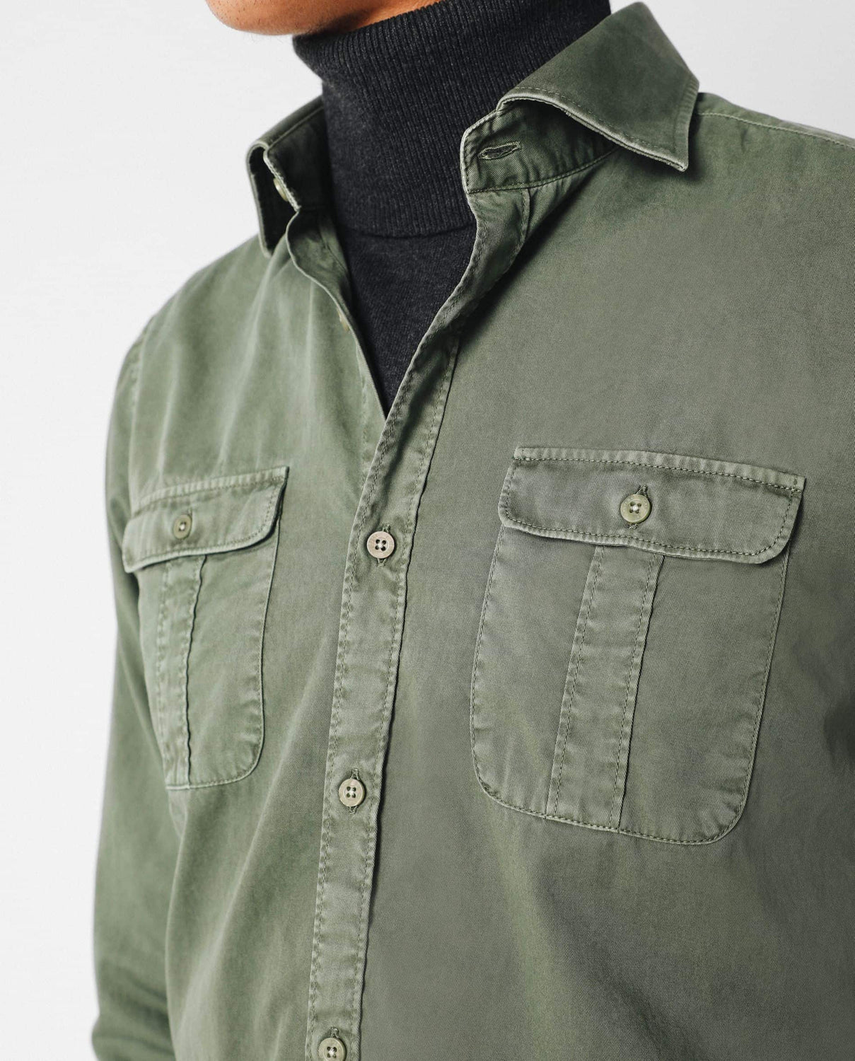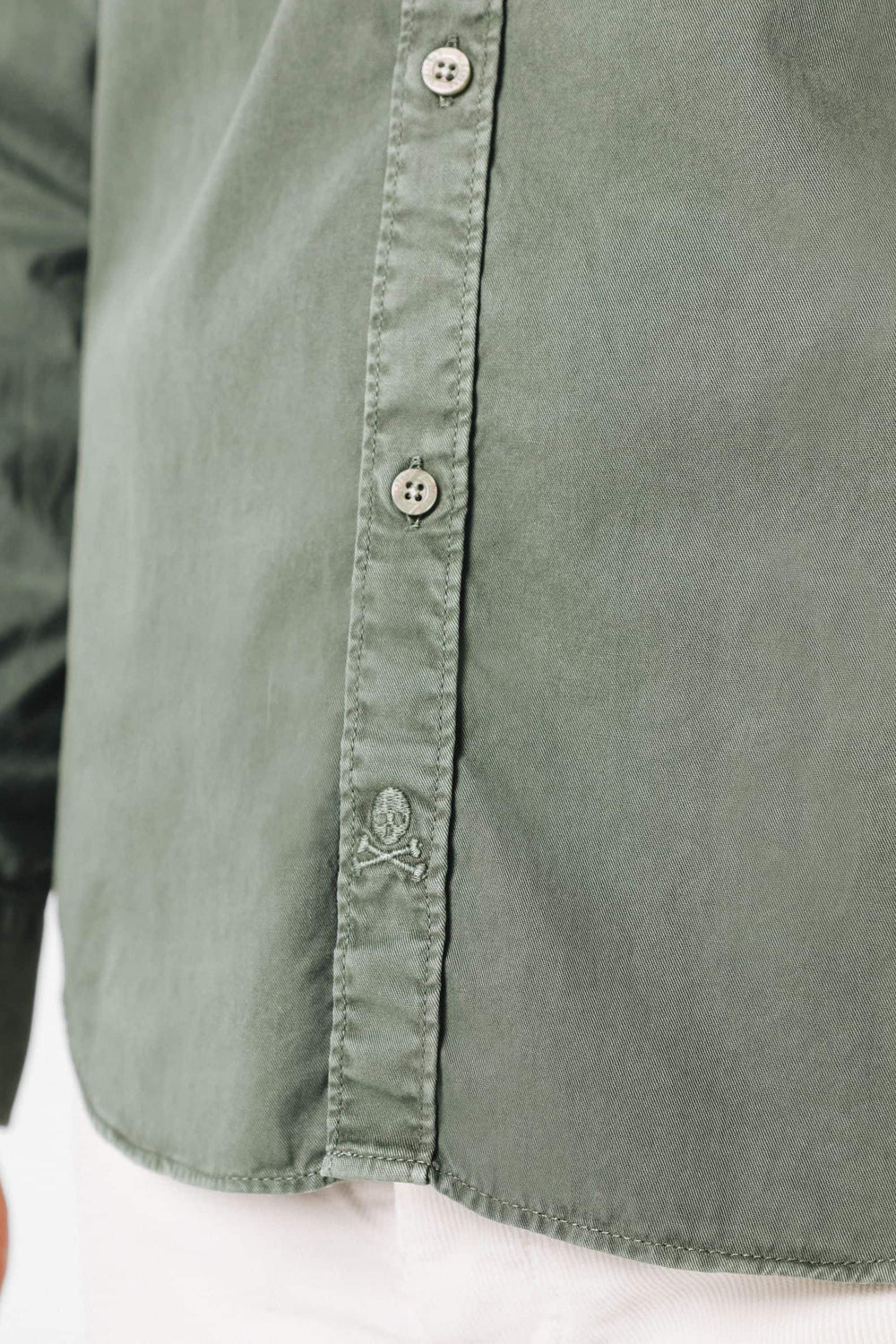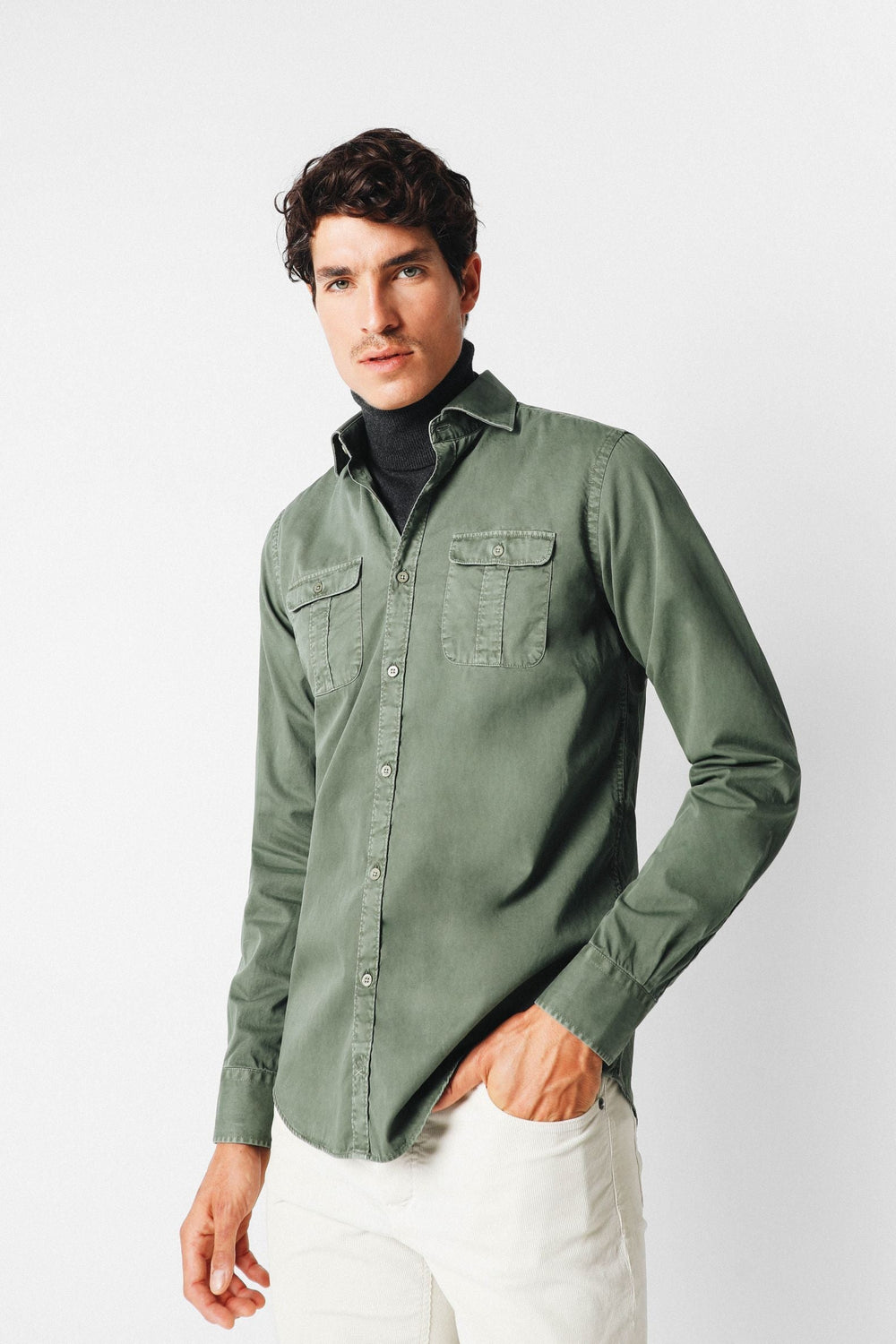 Camisa con bolsillos en el pecho, cierre con botones, cuello clásico y manga larga.