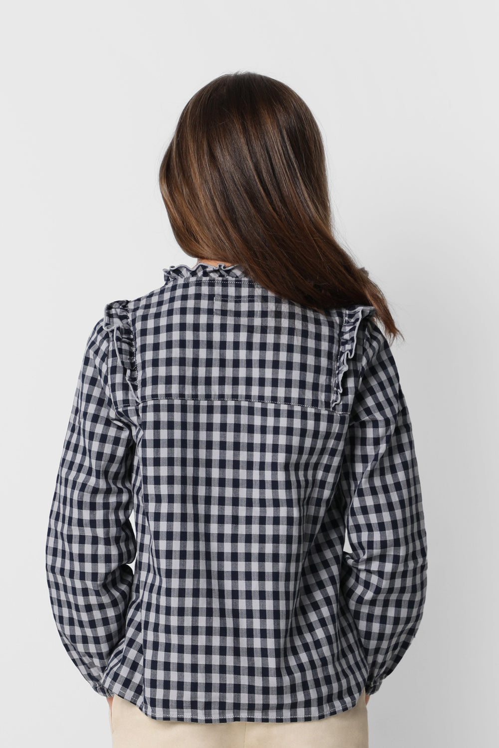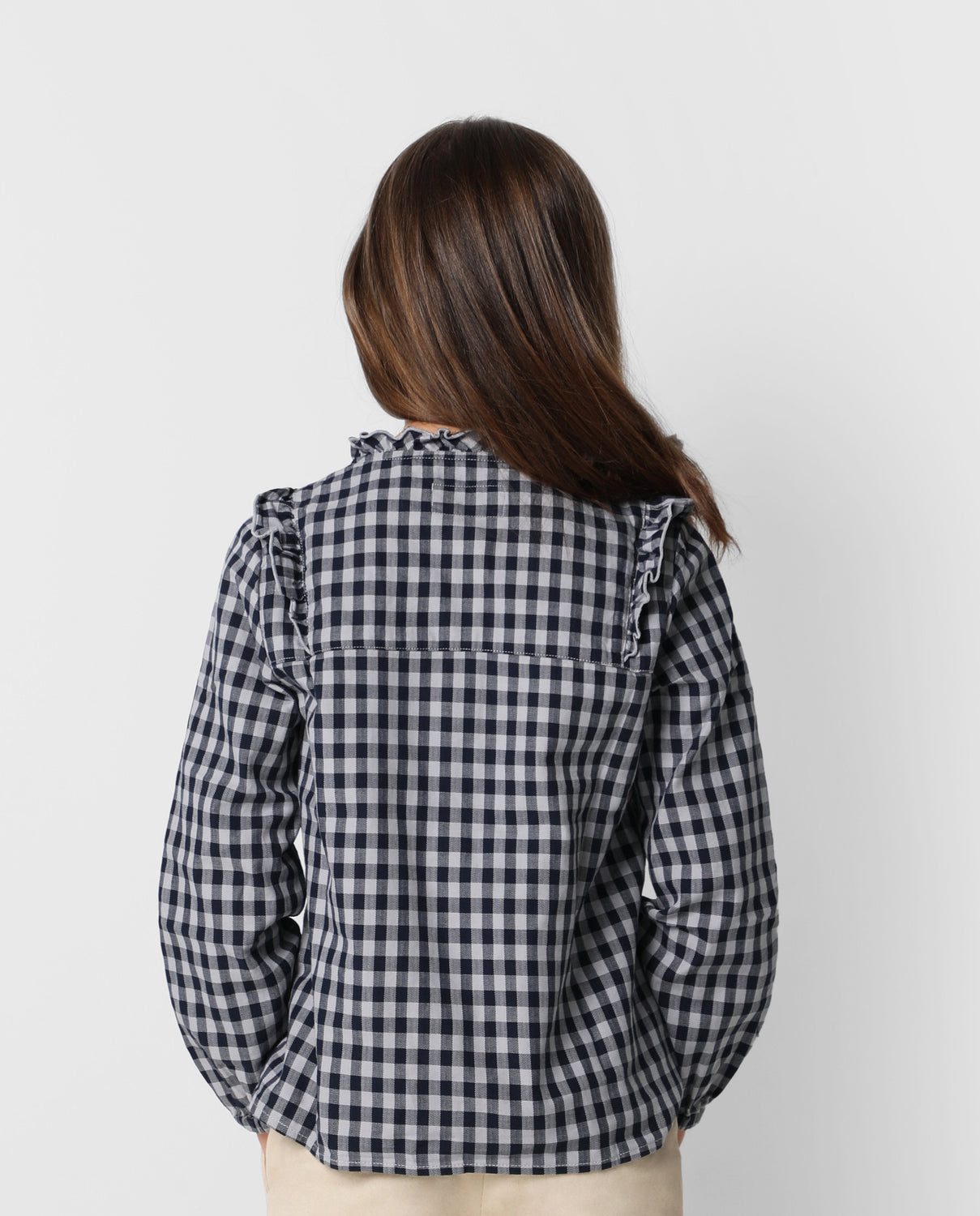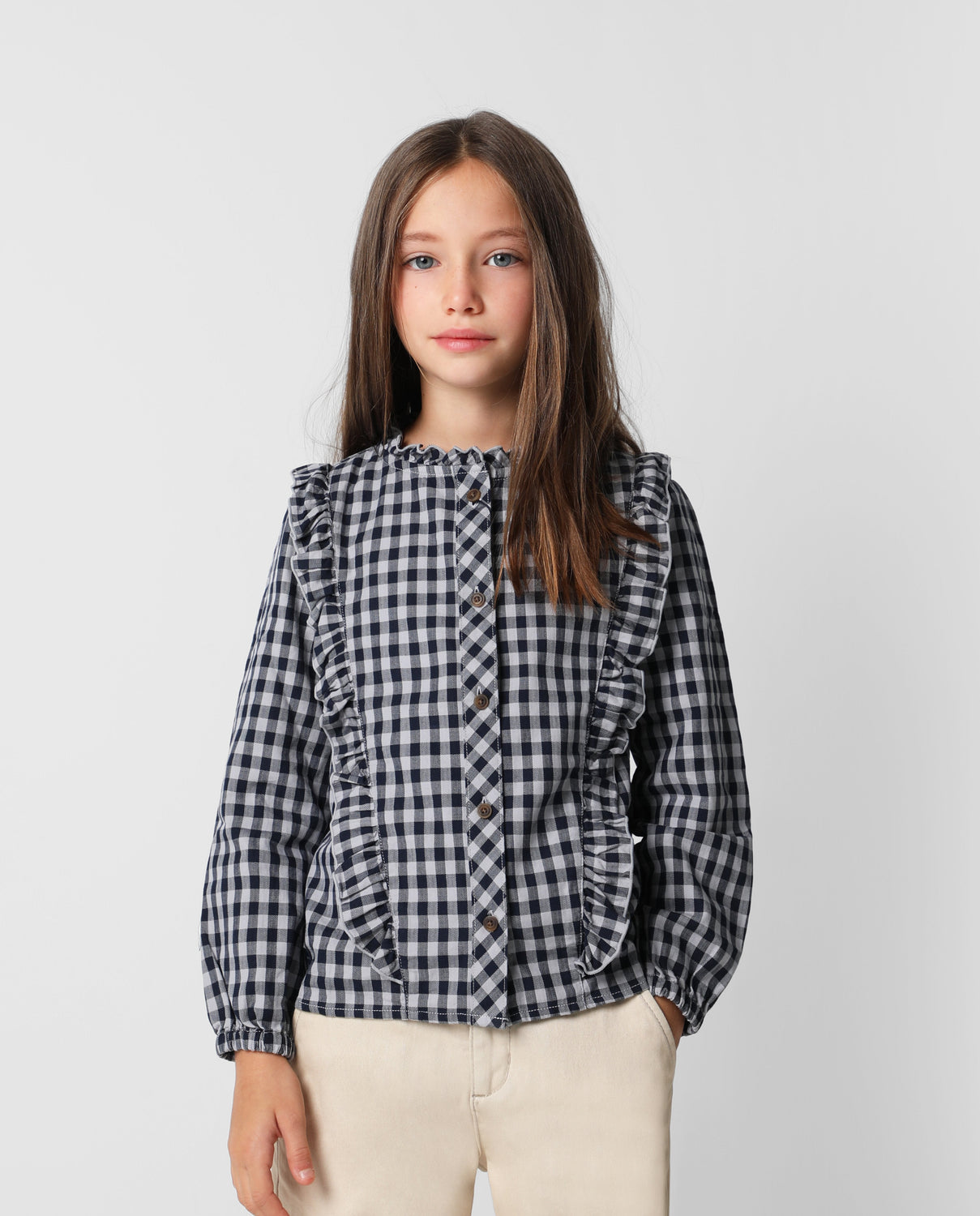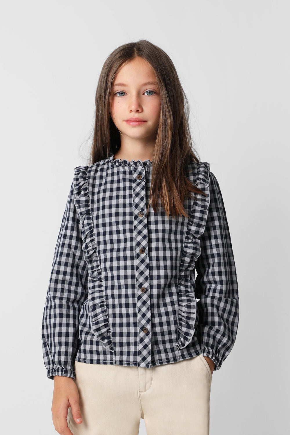 Blusa de cuadros vichy confeccionada en tejido 100% algodón. Corte Regular Fit, cuello con volante y cierre con botones en tapeta. Manga larga terminada en elástico y detalle de volantes a los lados.