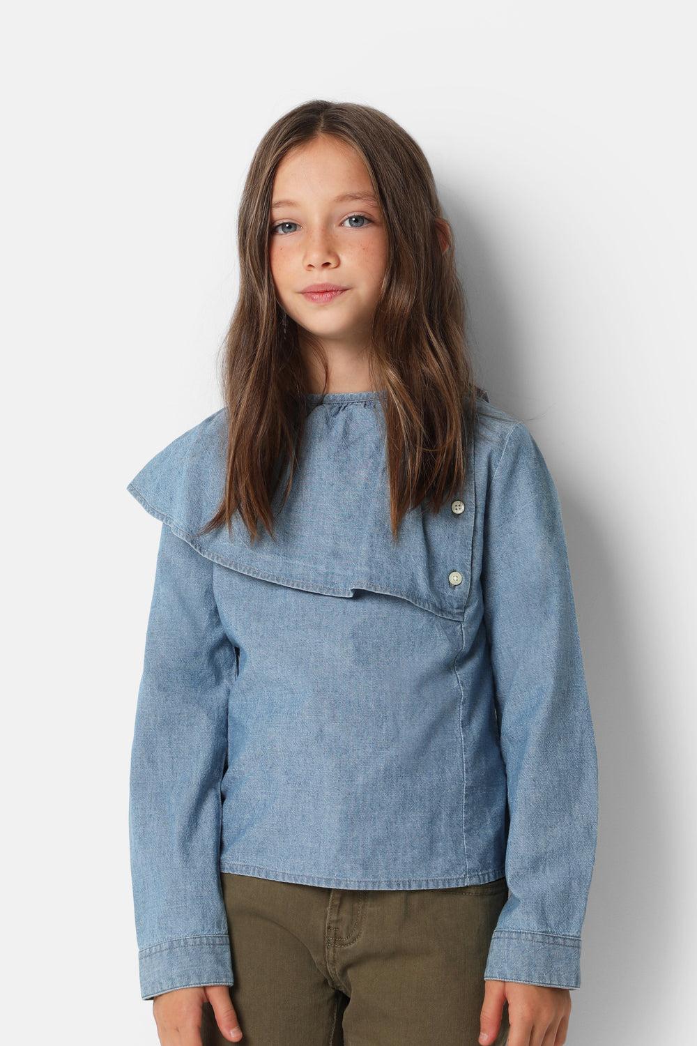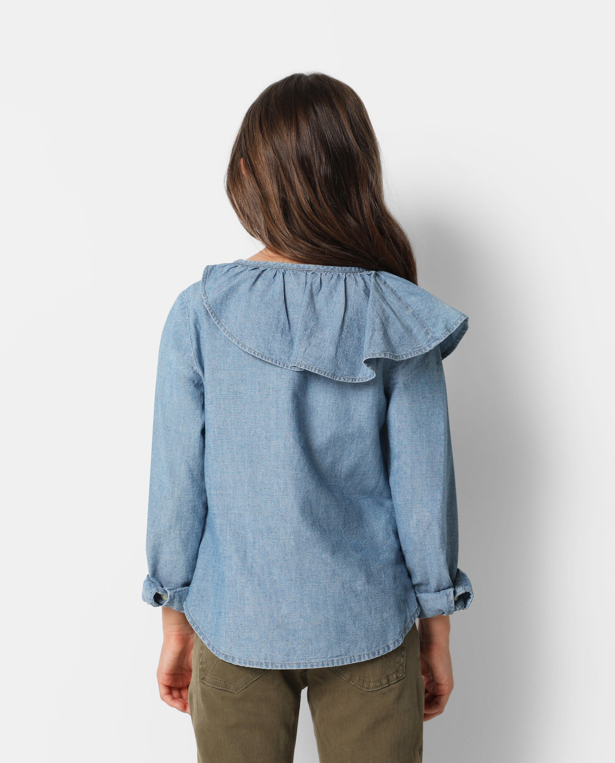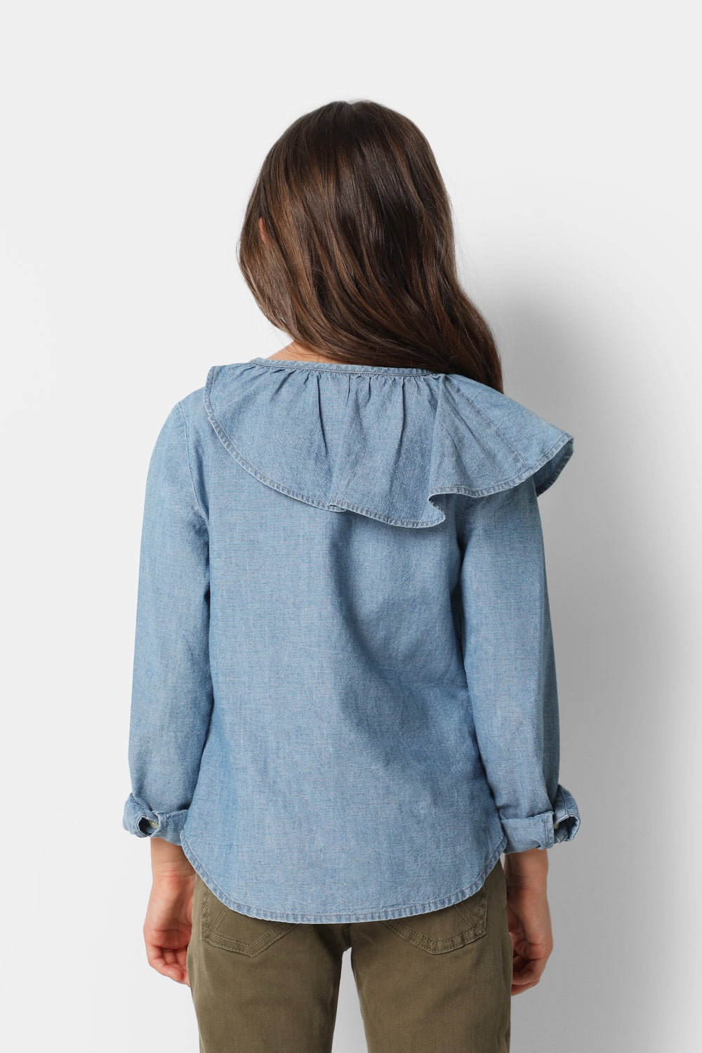 Camisa denim confeccionada en tejido 100% algodón. Corte Regular Fit, cuello redondo y cierre lateral con botones. Manga larga terminada en puño. Detalle de volante frontal y bordado de calavera en el bajo.