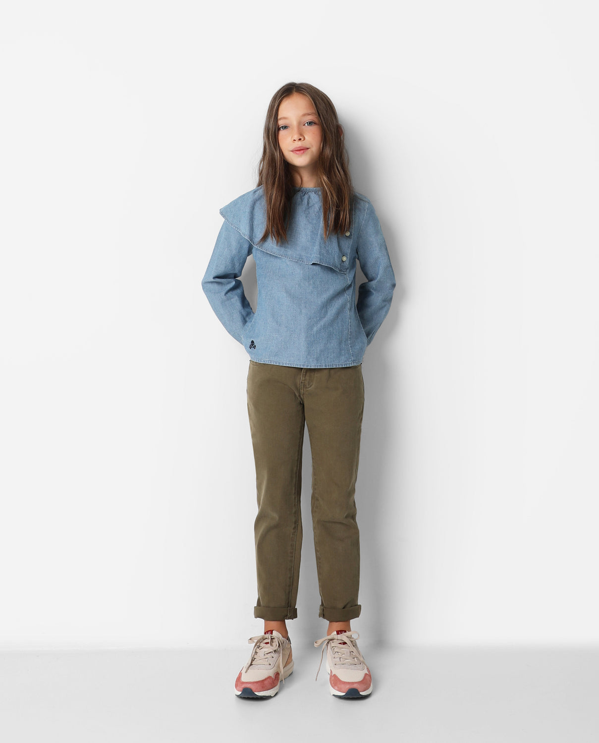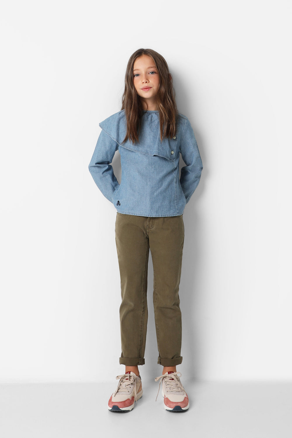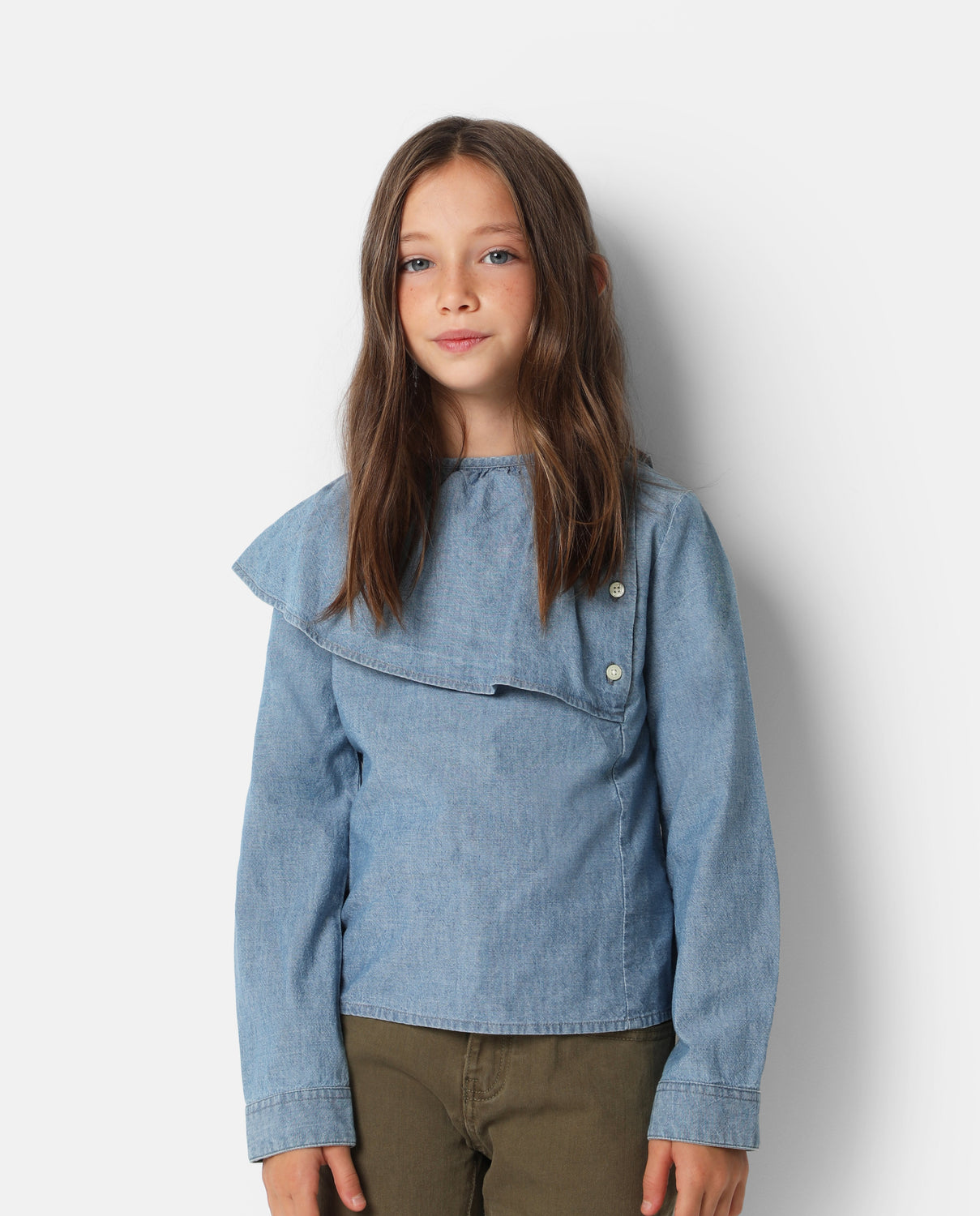 Camisa denim confeccionada en tejido 100% algodón. Corte Regular Fit, cuello redondo y cierre lateral con botones. Manga larga terminada en puño. Detalle de volante frontal y bordado de calavera en el bajo.