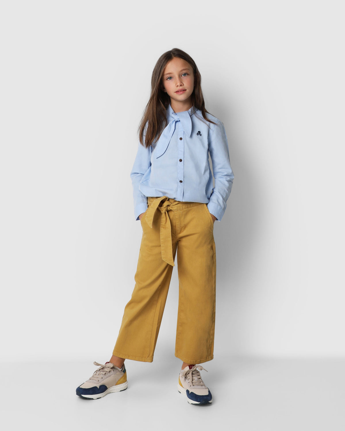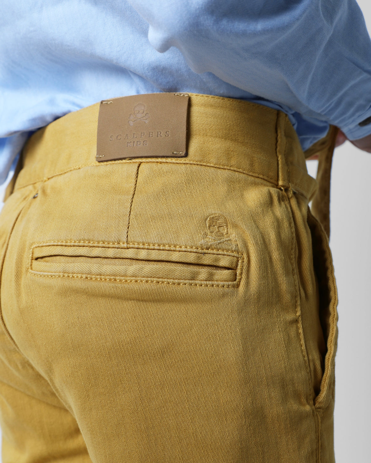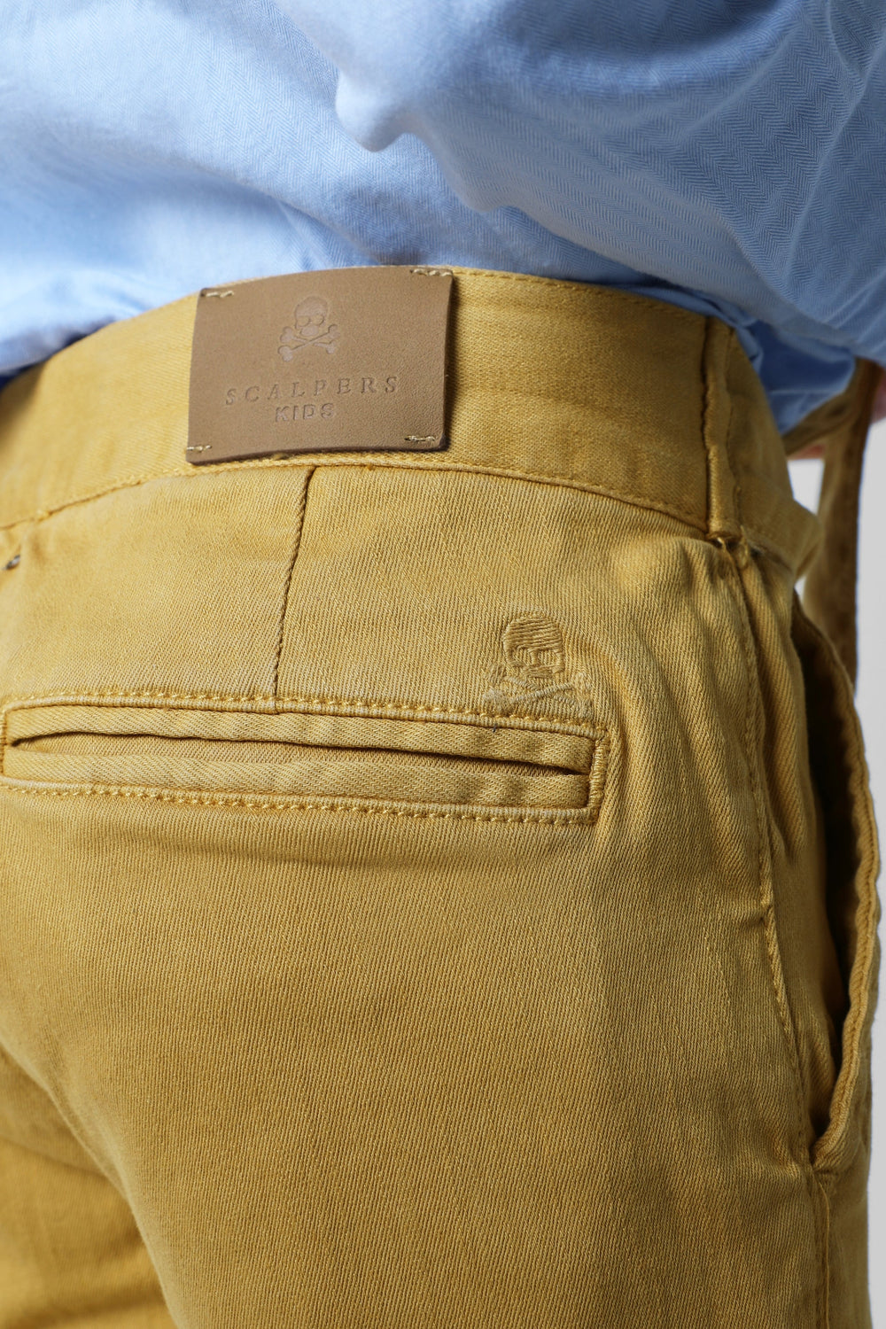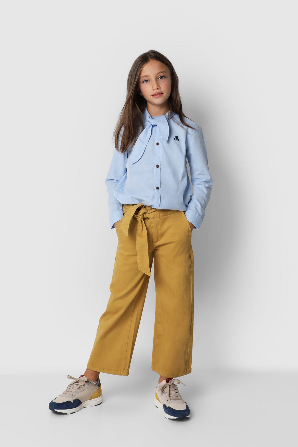 Pantalón confeccionado en algodón. Corte ancho con cinturilla extra larga para anudar, cierre con snap y cremallera. Bolsillo estilo chino frontales y de vivo en la parte trasera. Bordado de calavera sobre el bolsillo trasero.