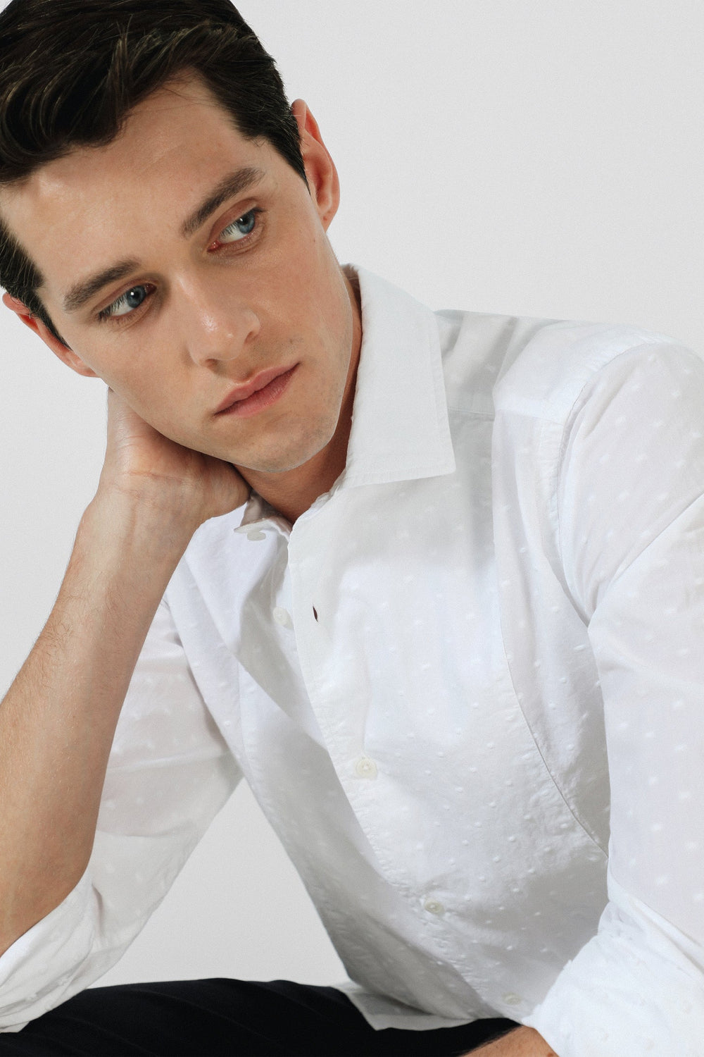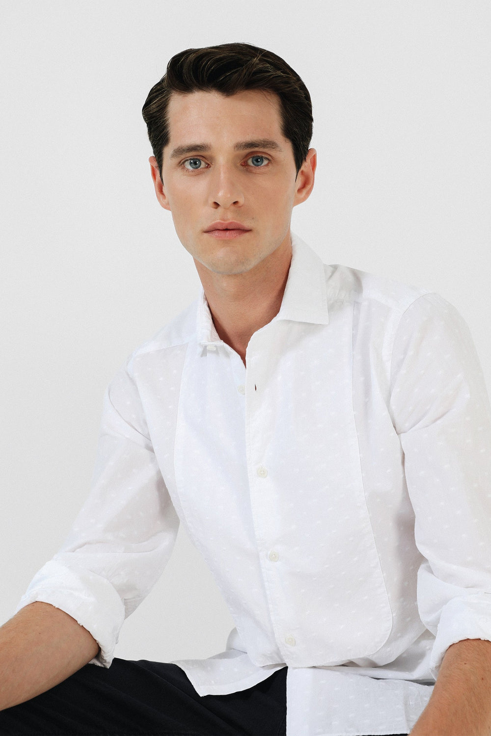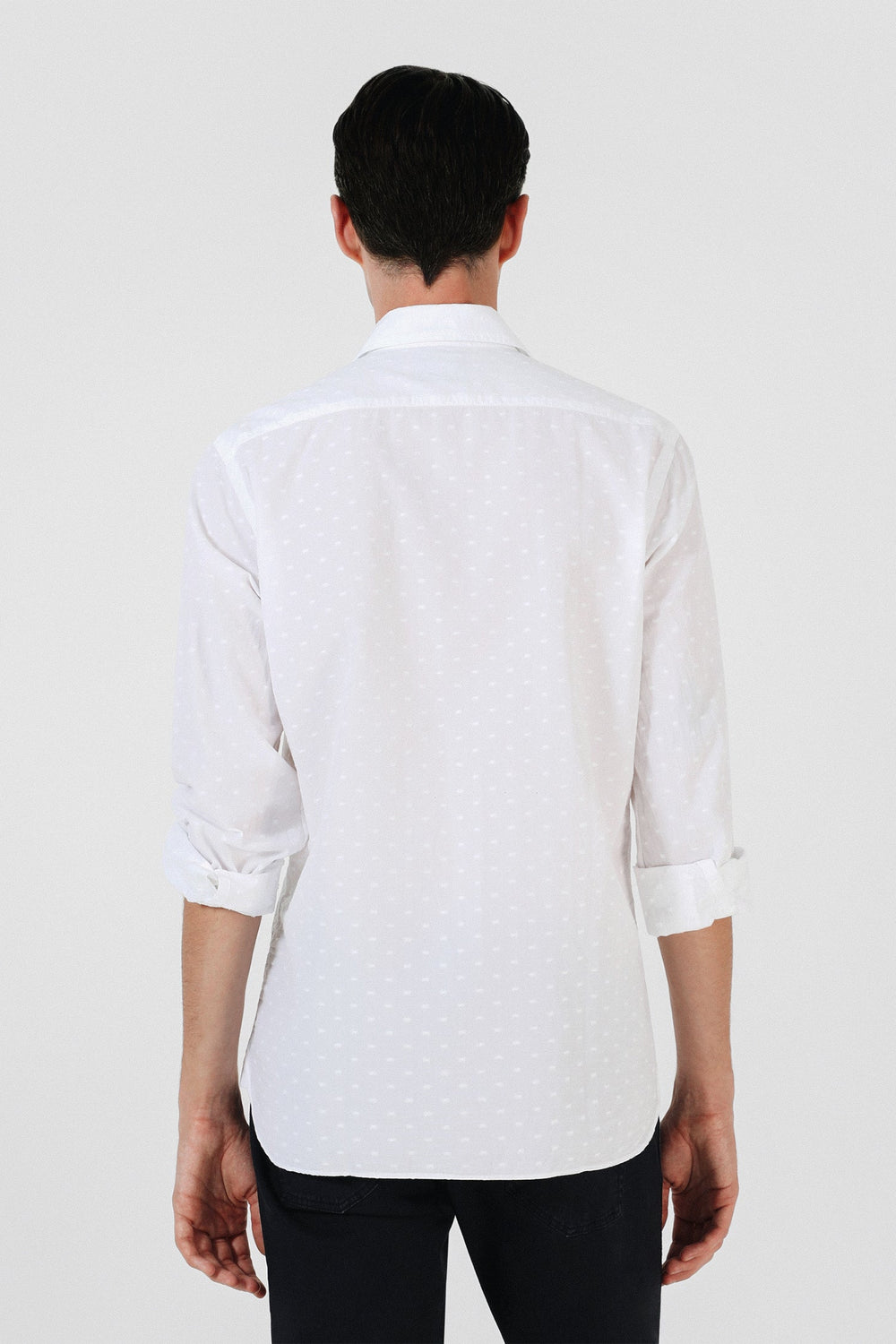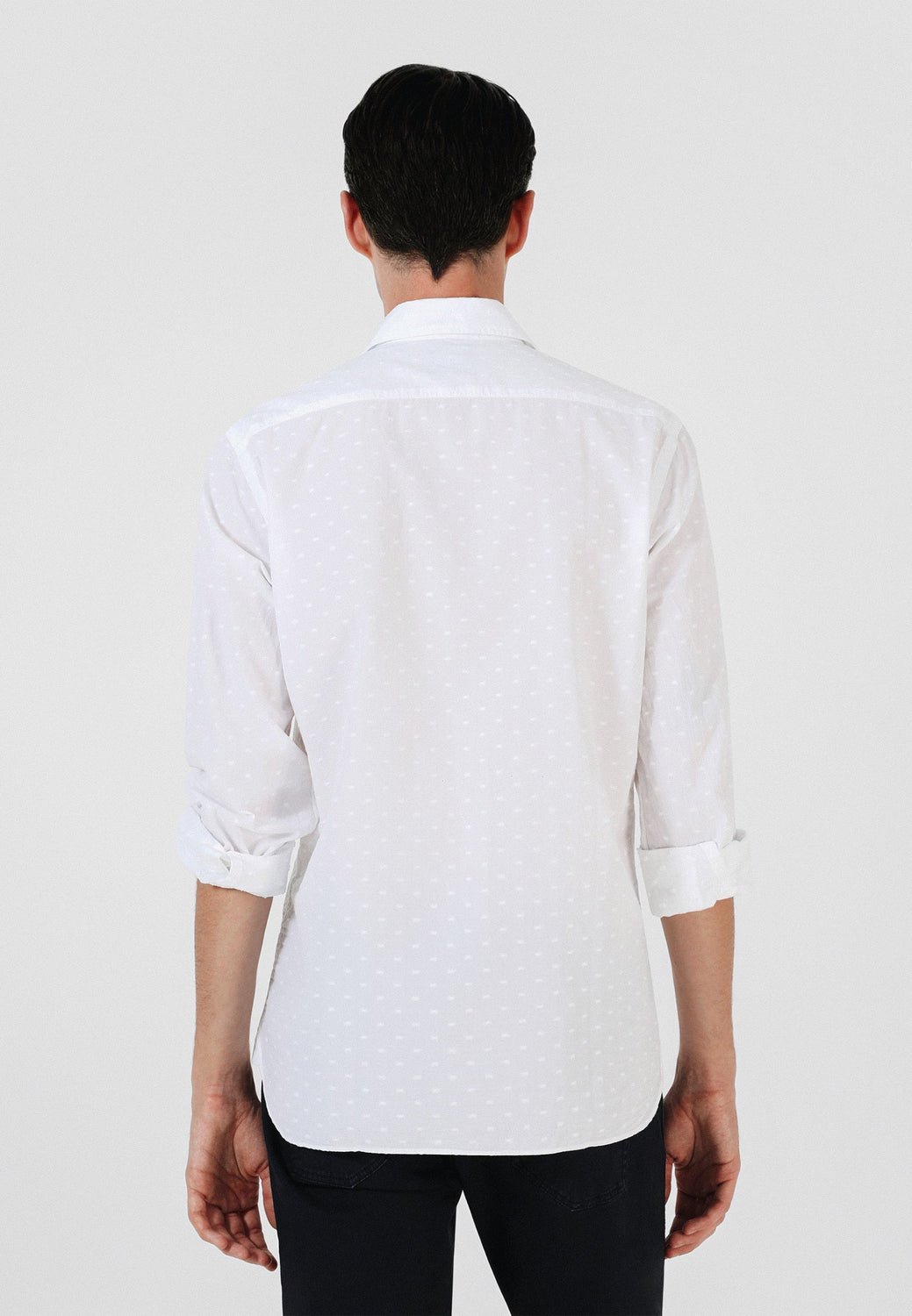 Camisa confeccionada en tejido 100% algodón dobby. Corte Regular Fit, cuello italiano con pechera y cierre con botones. Manga larga terminada en puño simple.