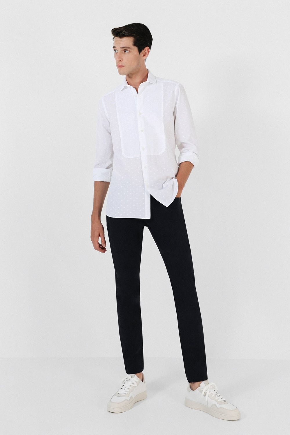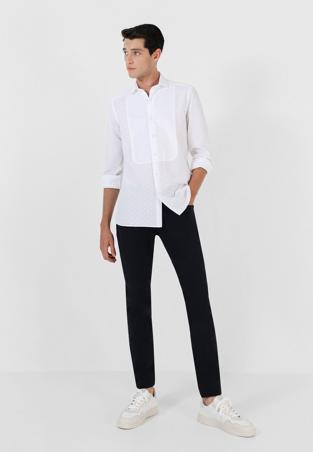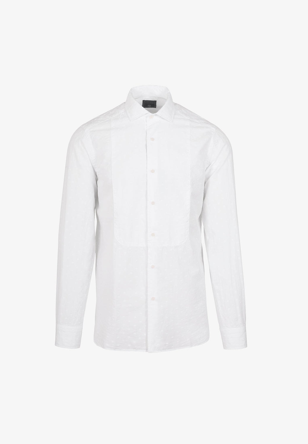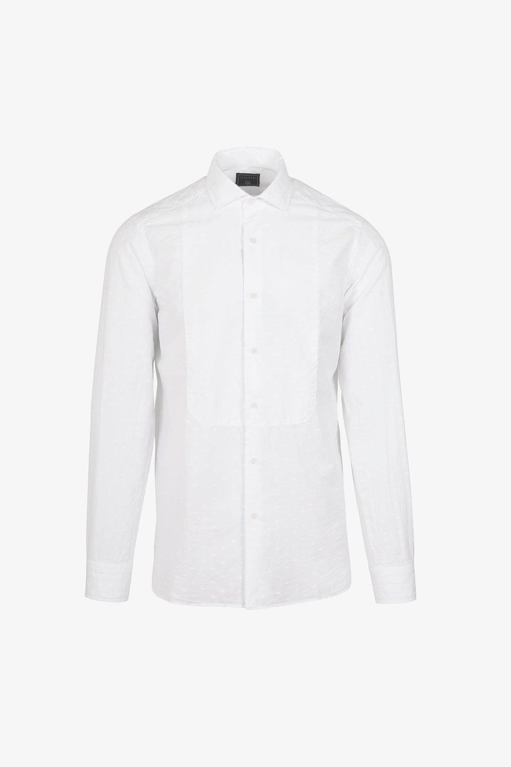 Camisa confeccionada en tejido 100% algodón dobby. Corte Regular Fit, cuello italiano con pechera y cierre con botones. Manga larga terminada en puño simple.