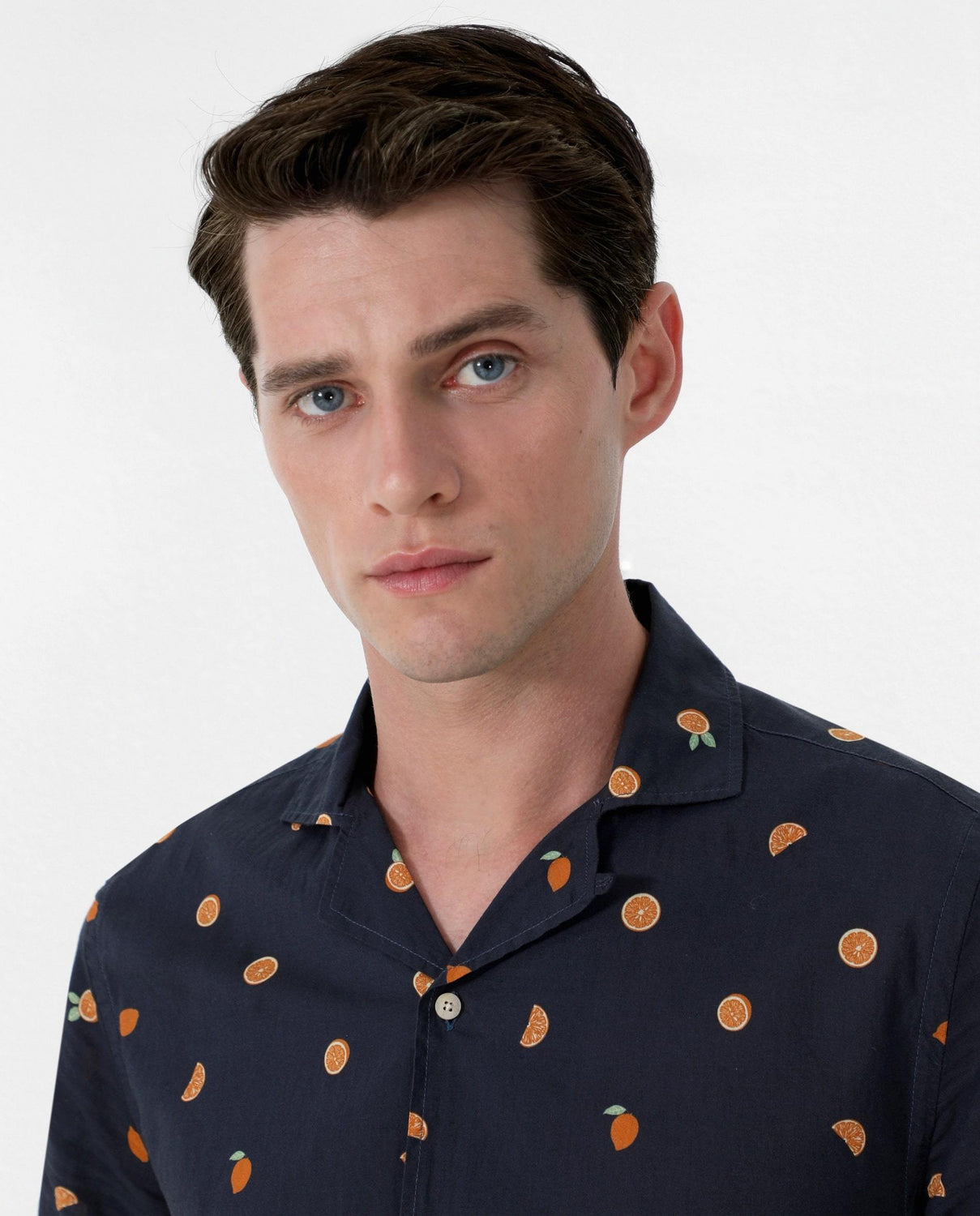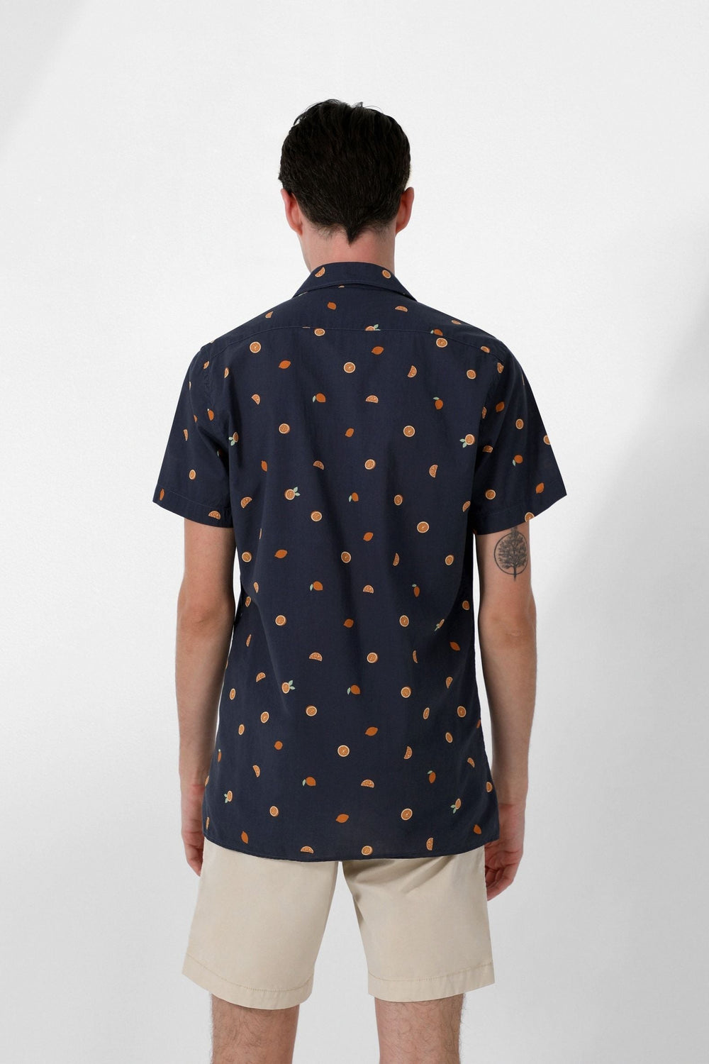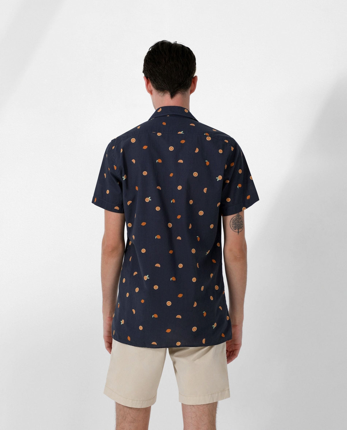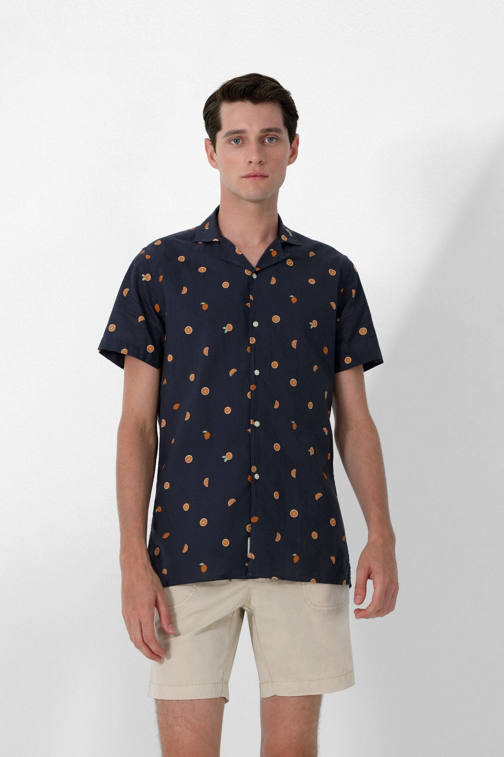Camisa con estampado de naranjas confeccionada en tejido 100% algodón. Corte Regular Fit, cuello italiano y cierre con botones y sin tapeta. Manga corta.
