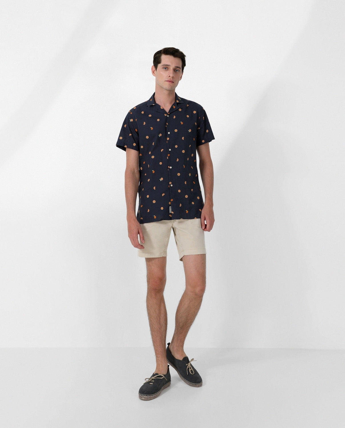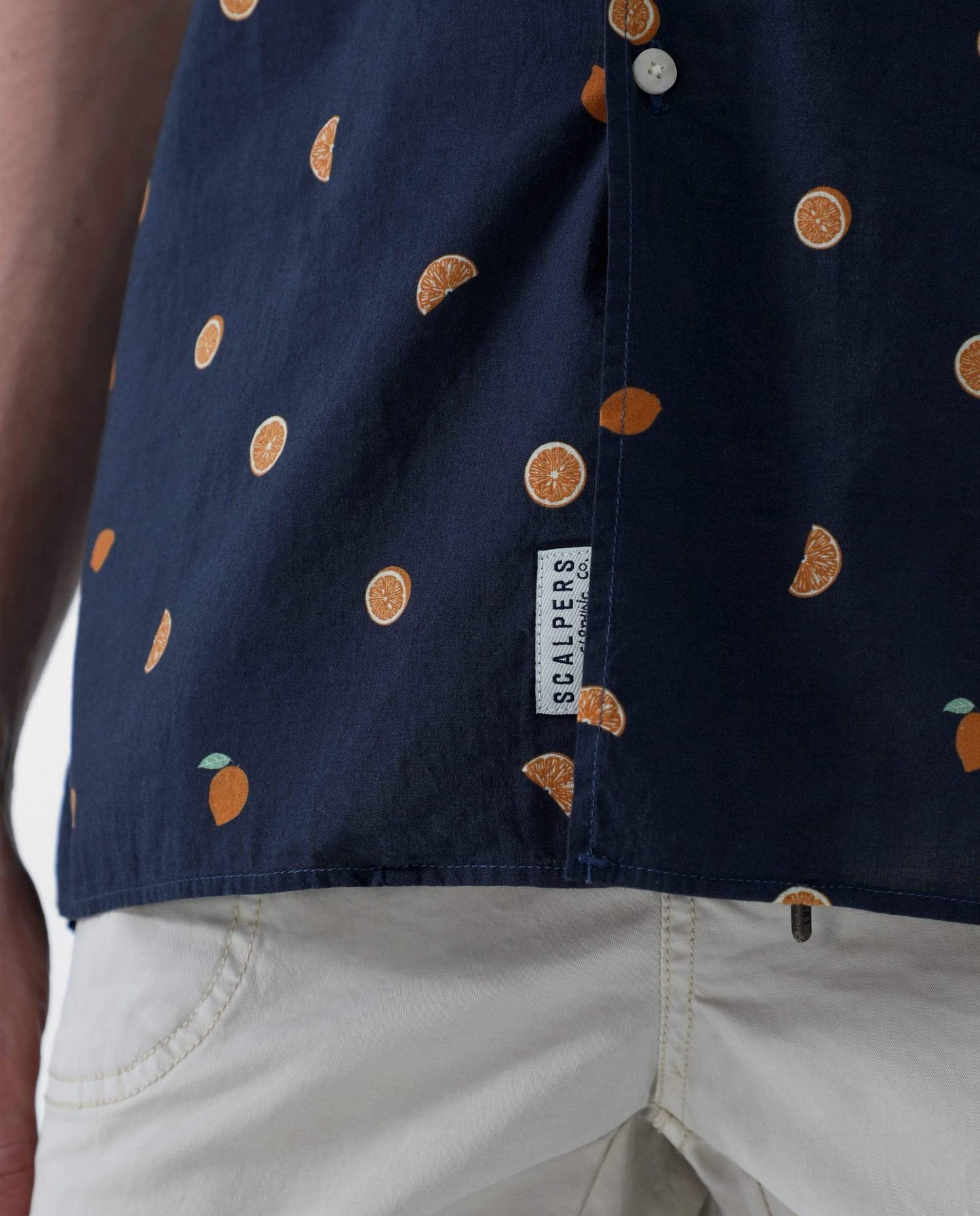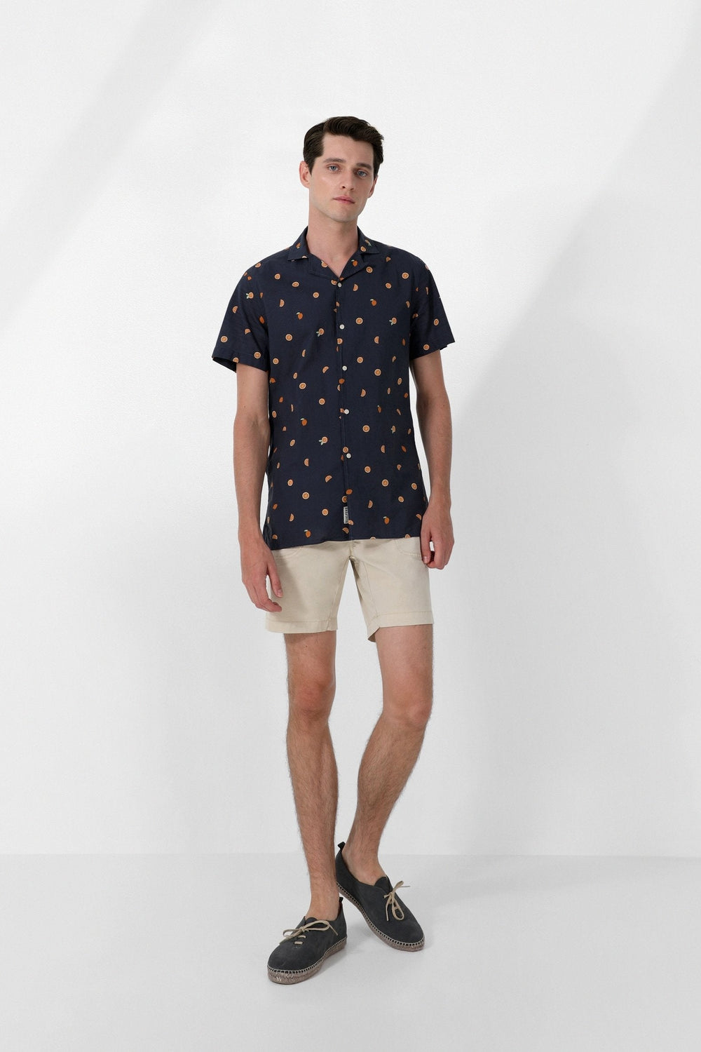 Camisa con estampado de naranjas confeccionada en tejido 100% algodón. Corte Regular Fit, cuello italiano y cierre con botones y sin tapeta. Manga corta.