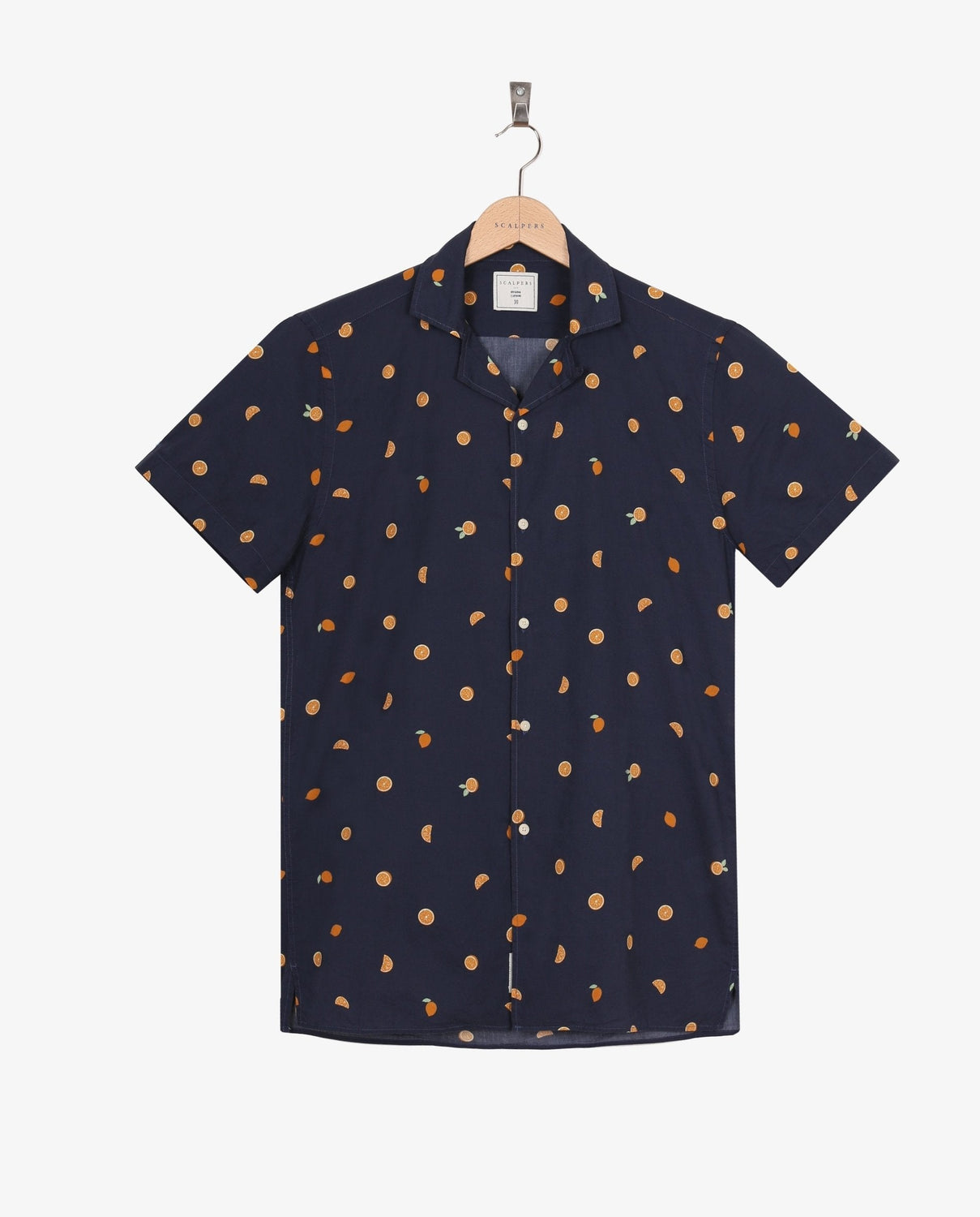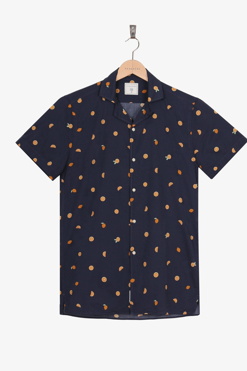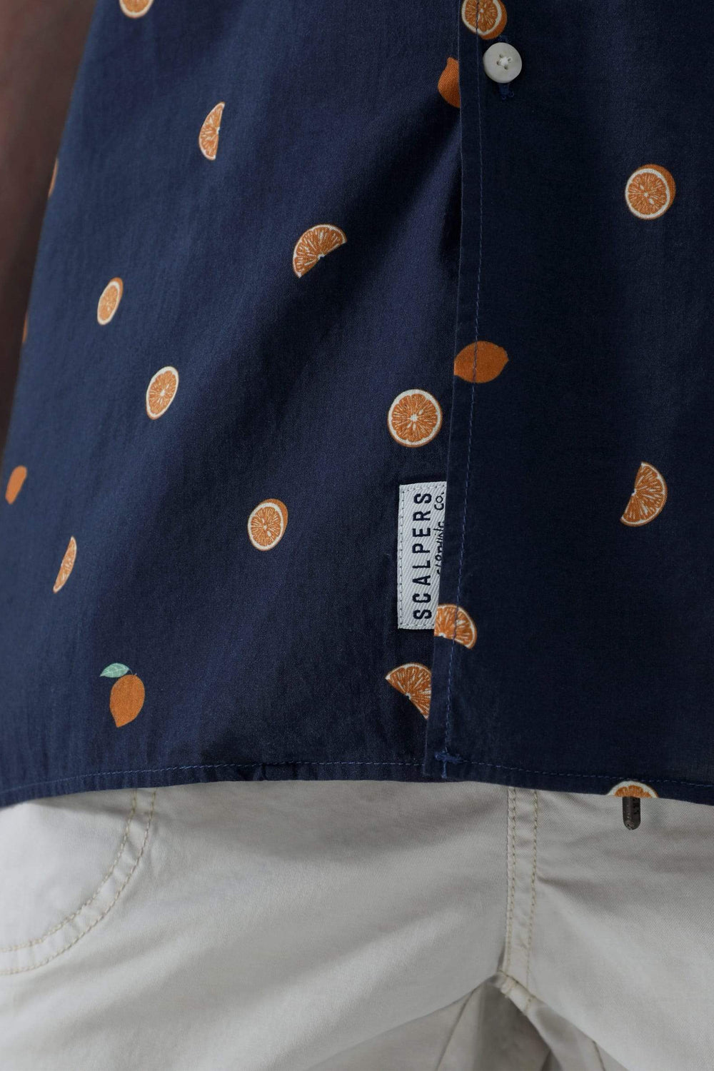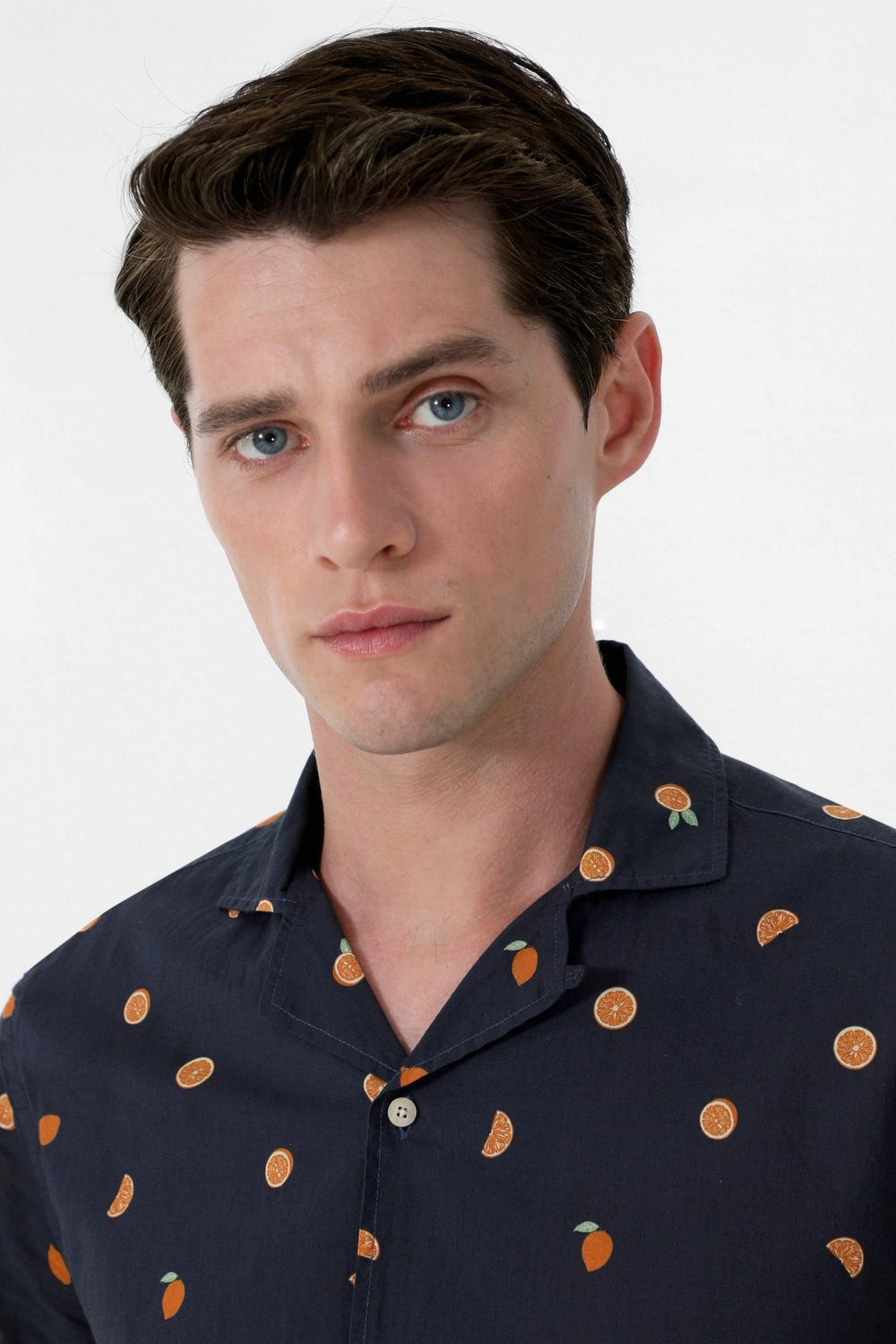 Camisa con estampado de naranjas confeccionada en tejido 100% algodón. Corte Regular Fit, cuello italiano y cierre con botones y sin tapeta. Manga corta.