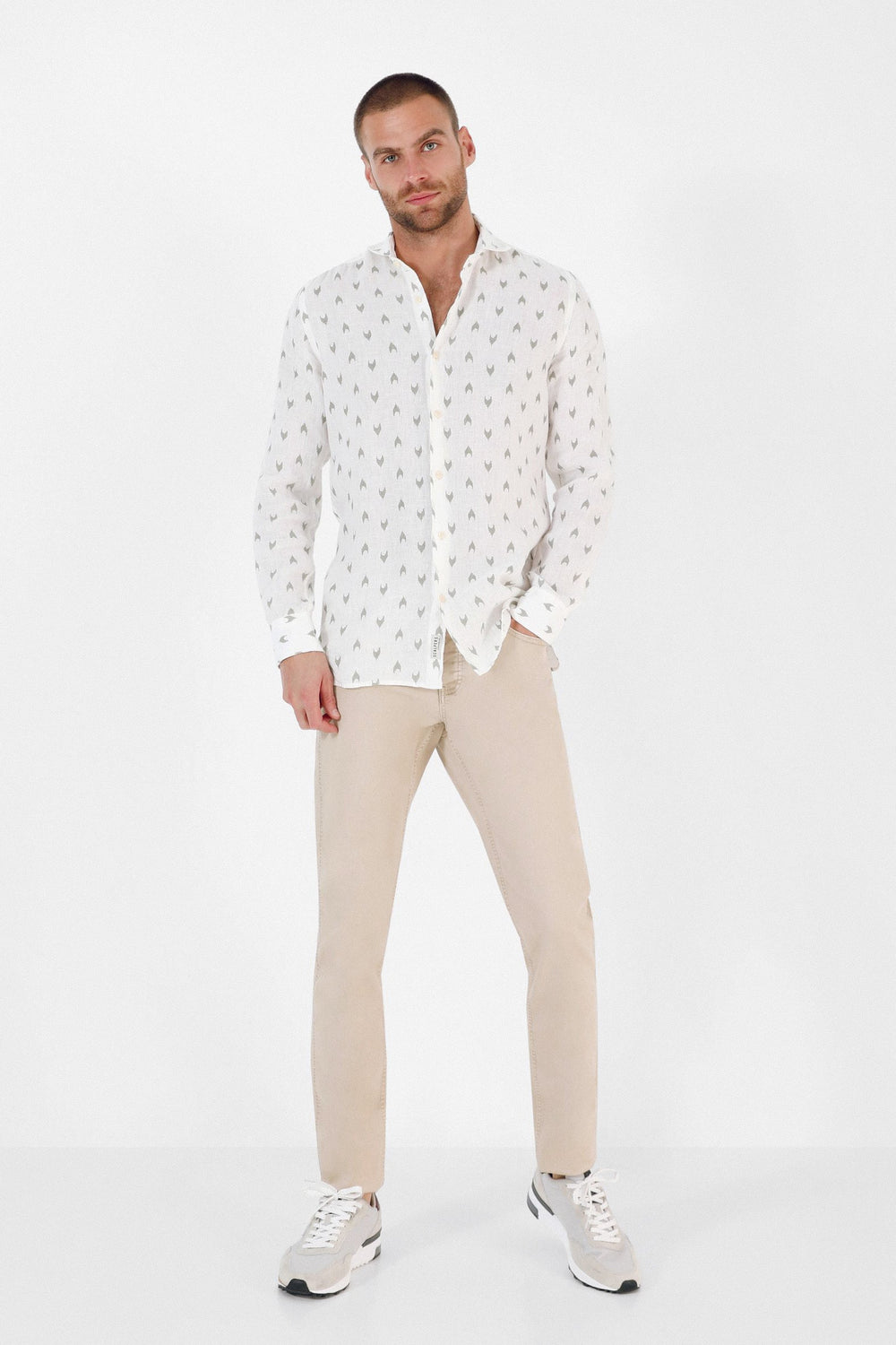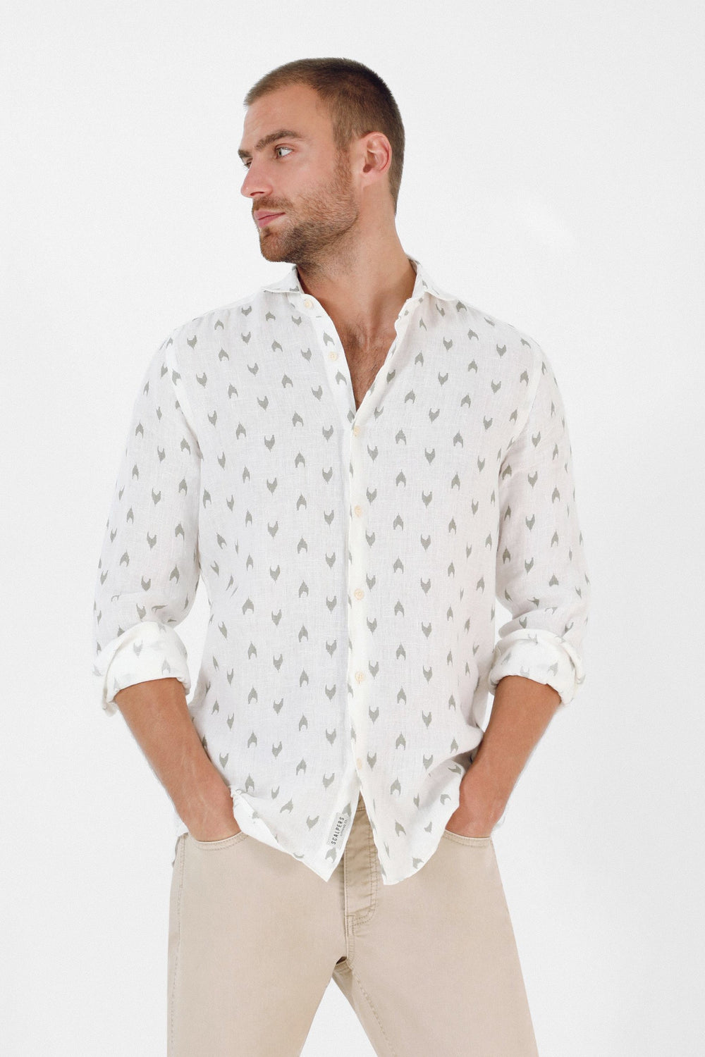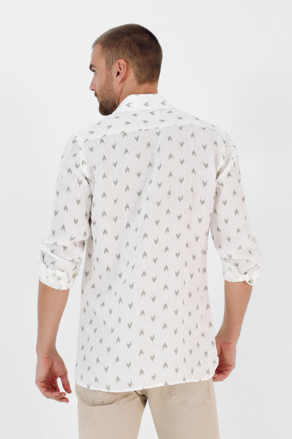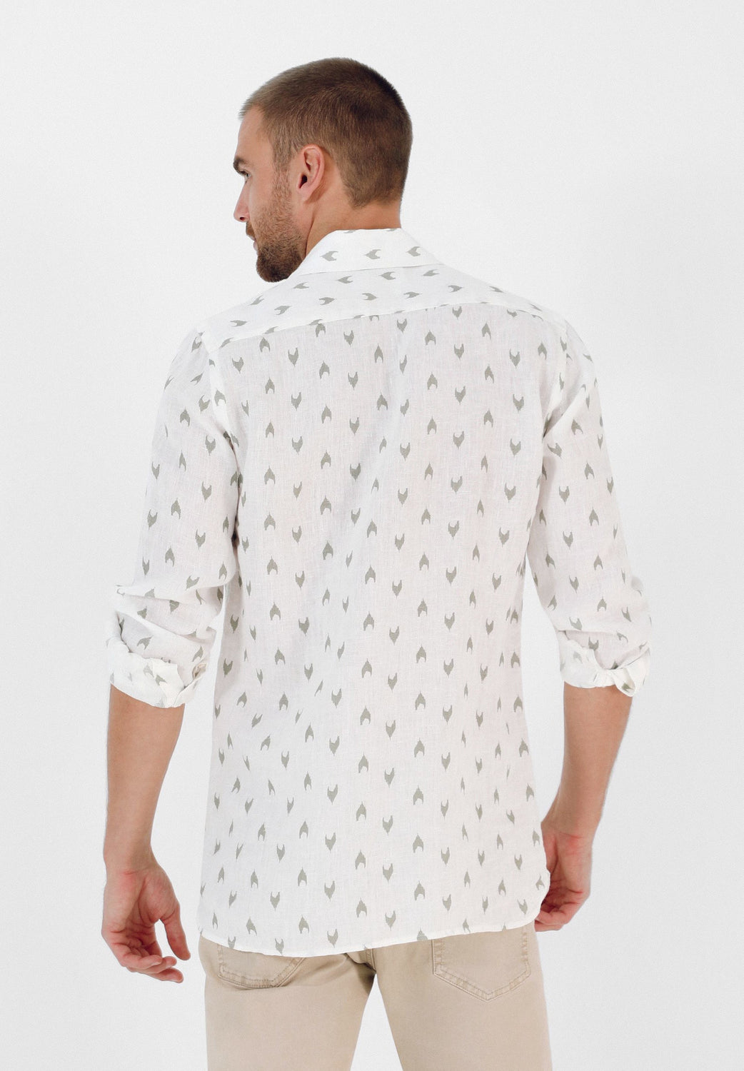 Camisa con estampado confeccionada en tejido 100% lino. Corte Regular Fit, cuello cutaway y cierre con botones. Manga larga terminada en puño.