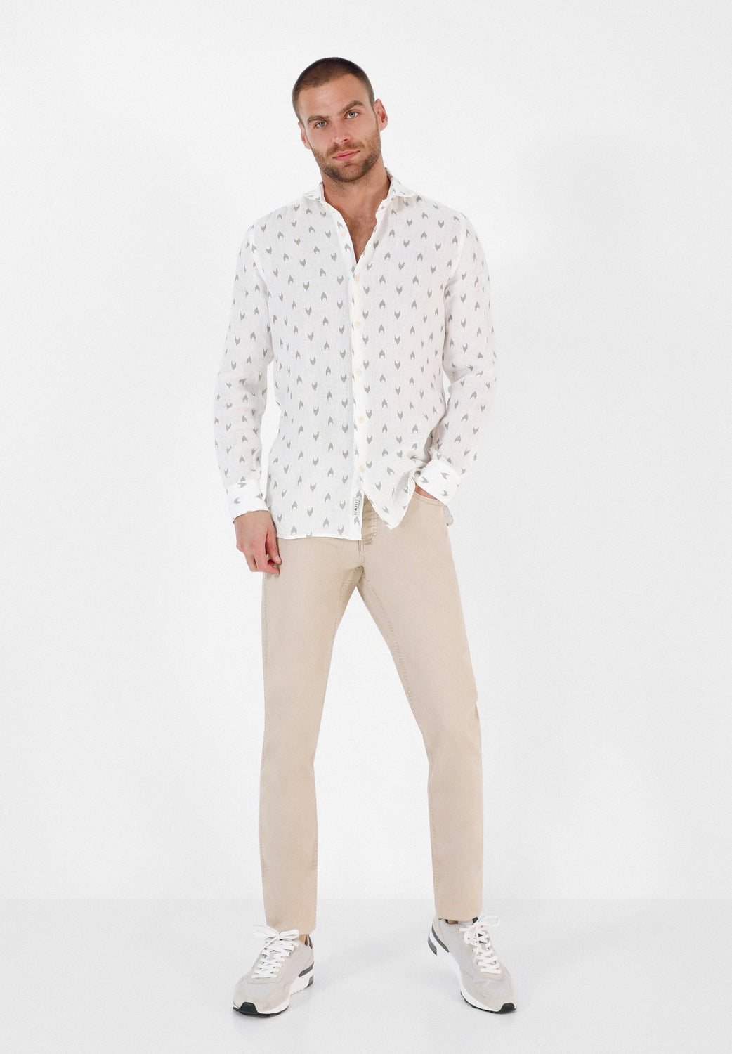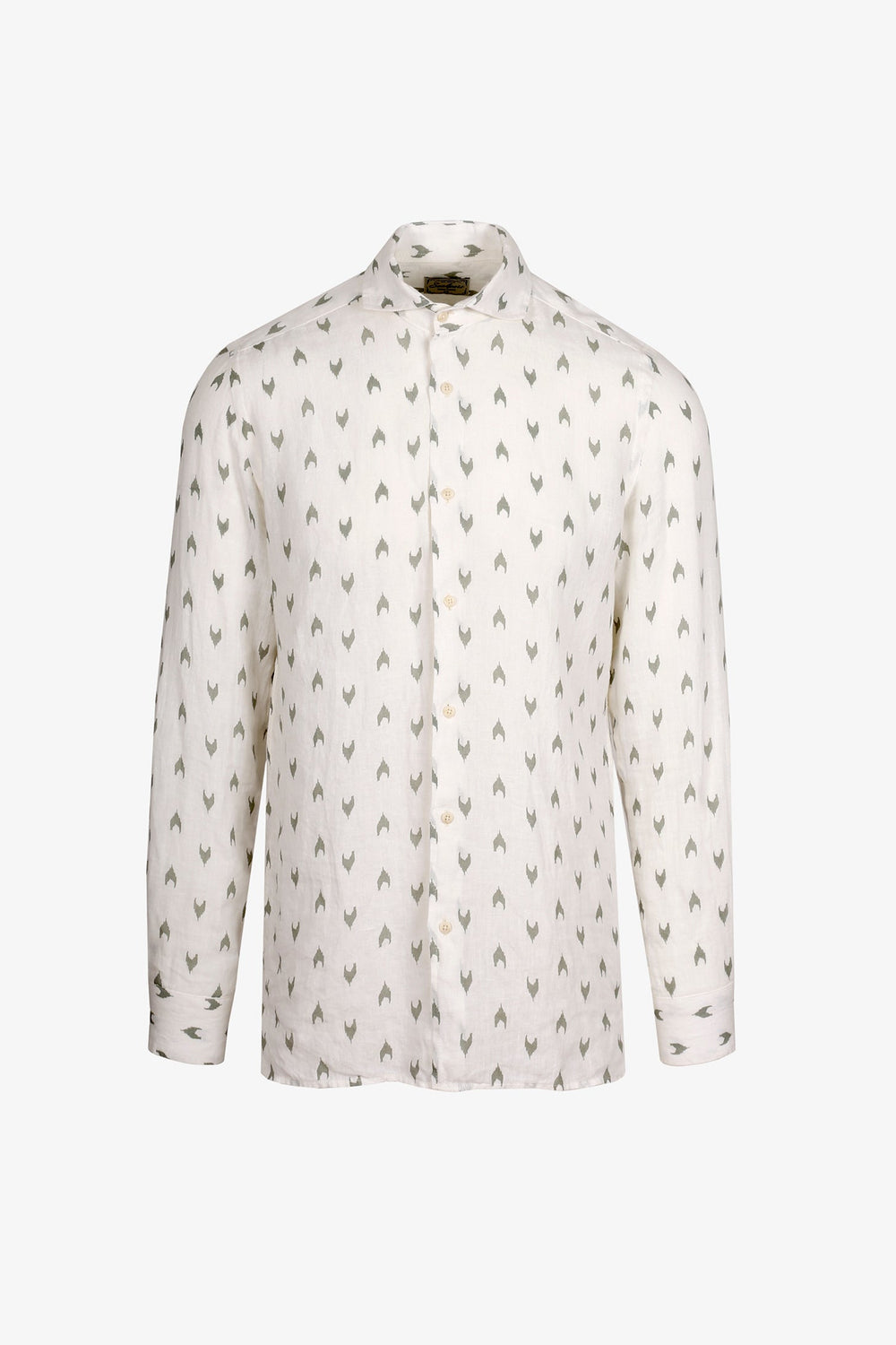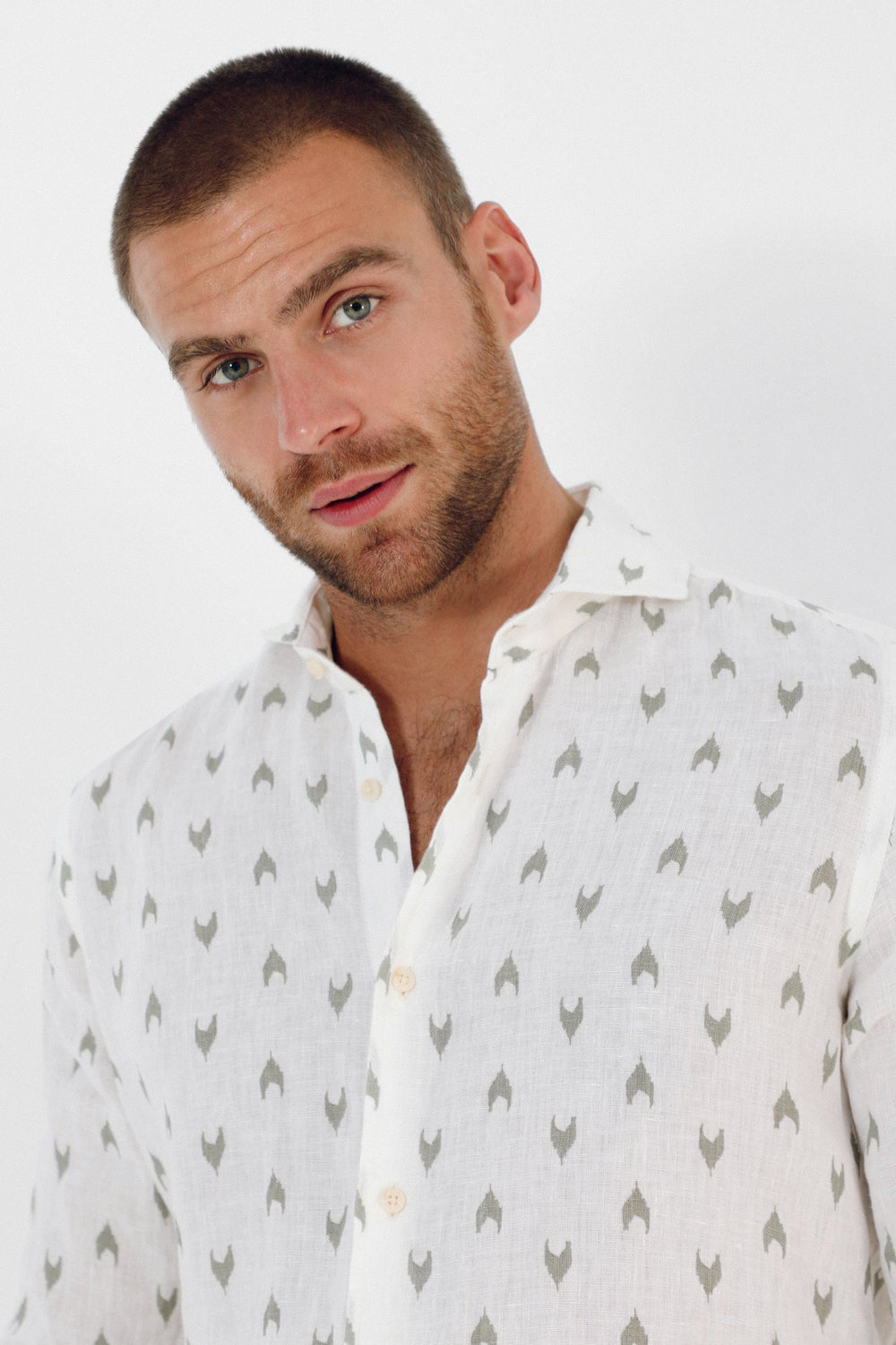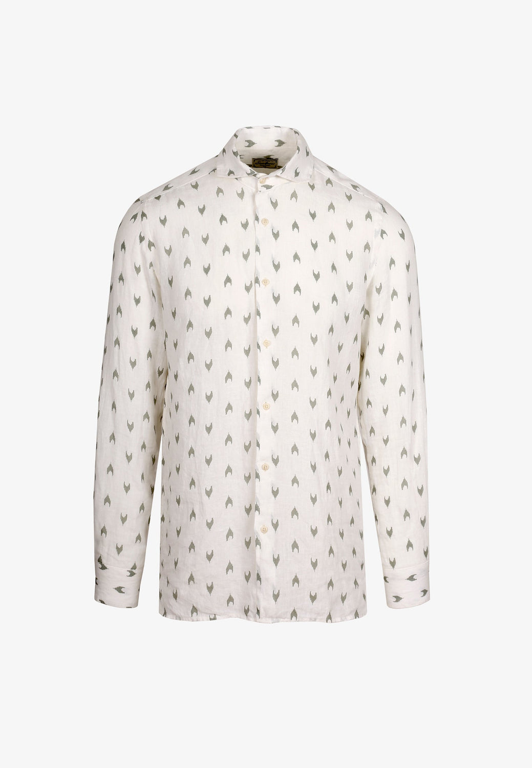 Camisa con estampado confeccionada en tejido 100% lino. Corte Regular Fit, cuello cutaway y cierre con botones. Manga larga terminada en puño.