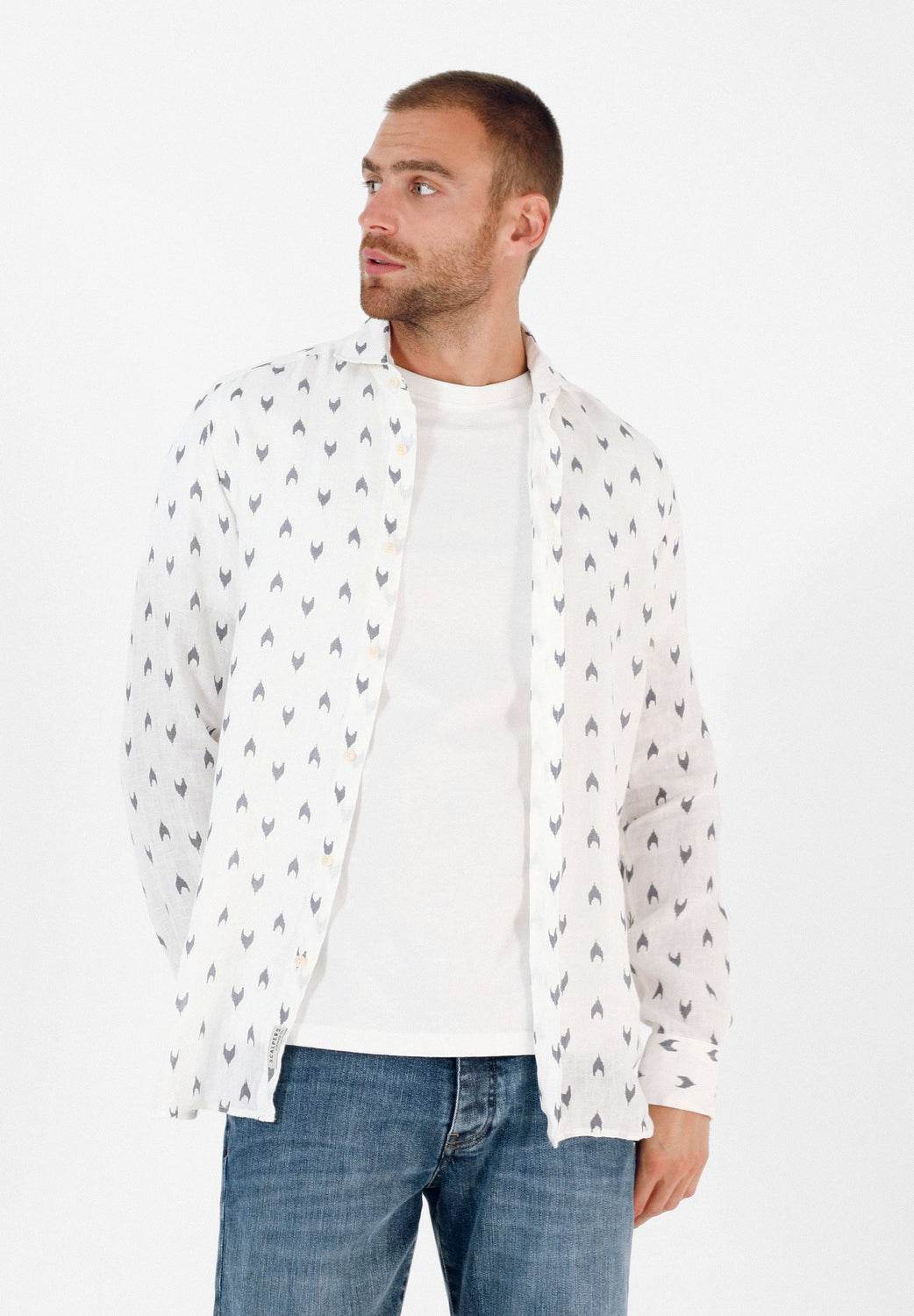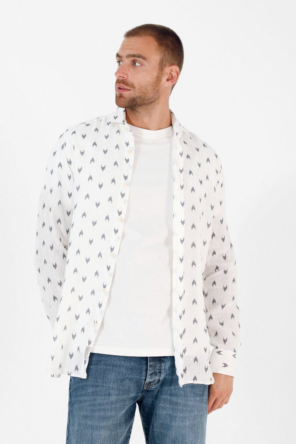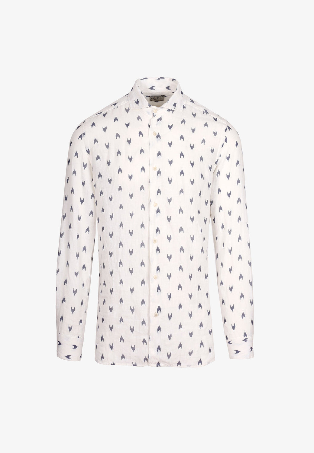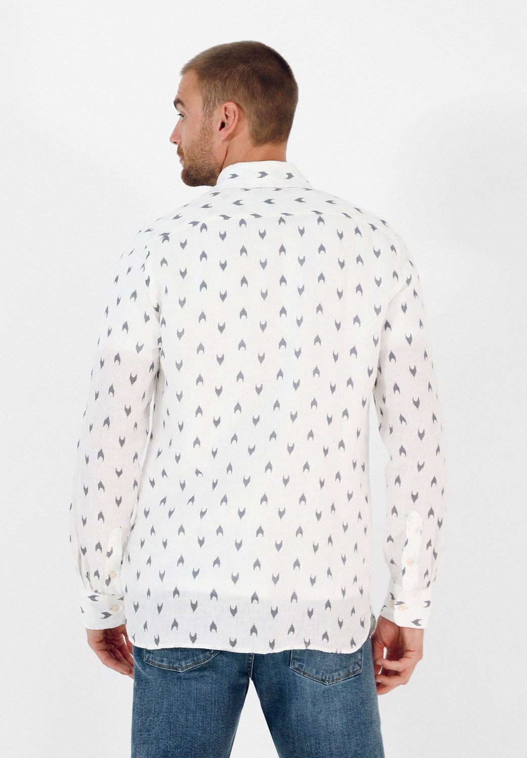 Camisa con estampado confeccionada en tejido 100% lino. Corte Regular Fit, cuello cutaway y cierre con botones. Manga larga terminada en puño.