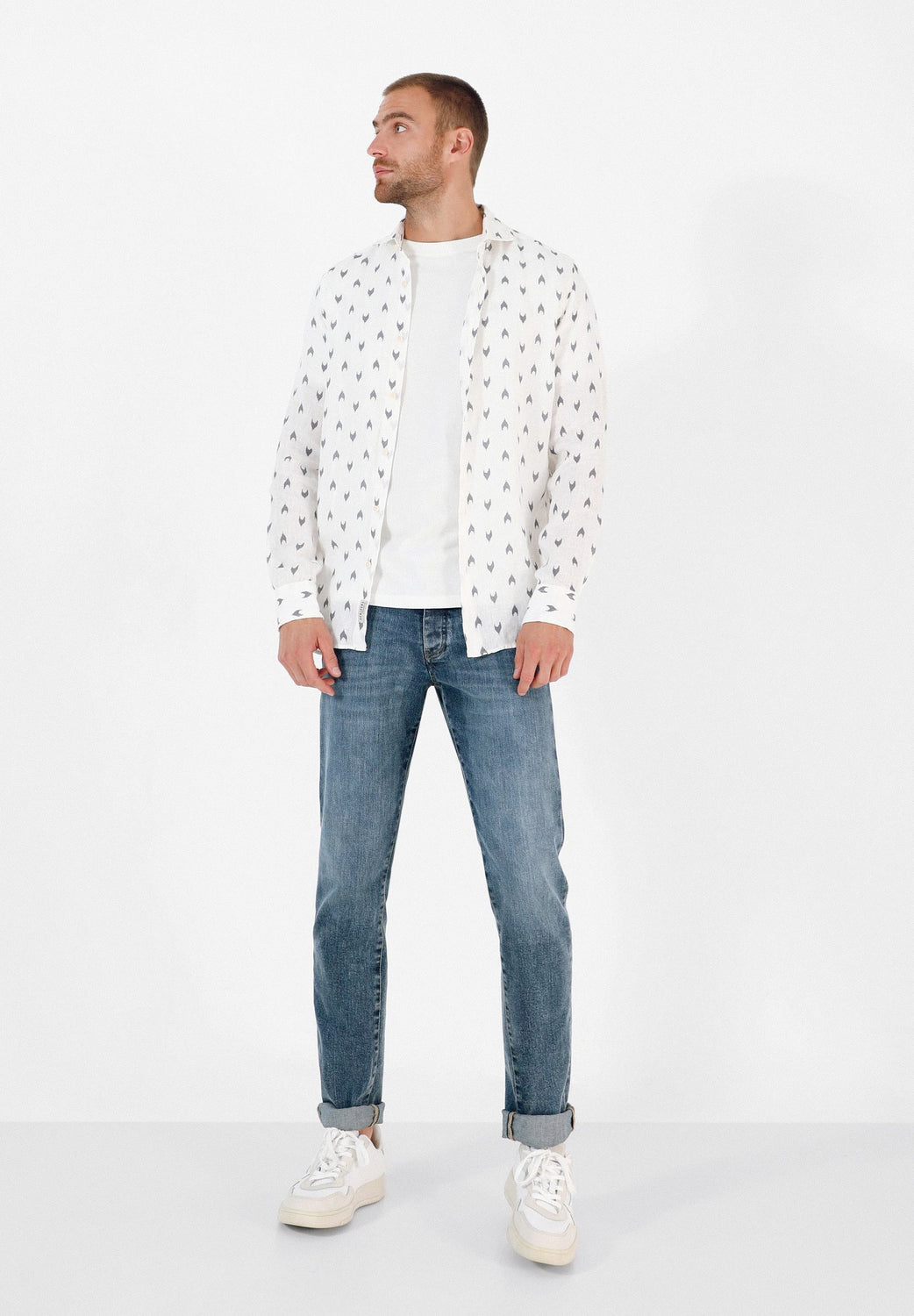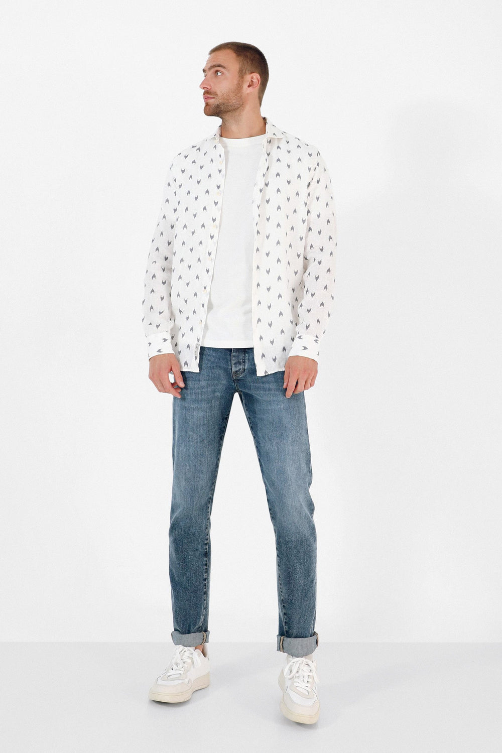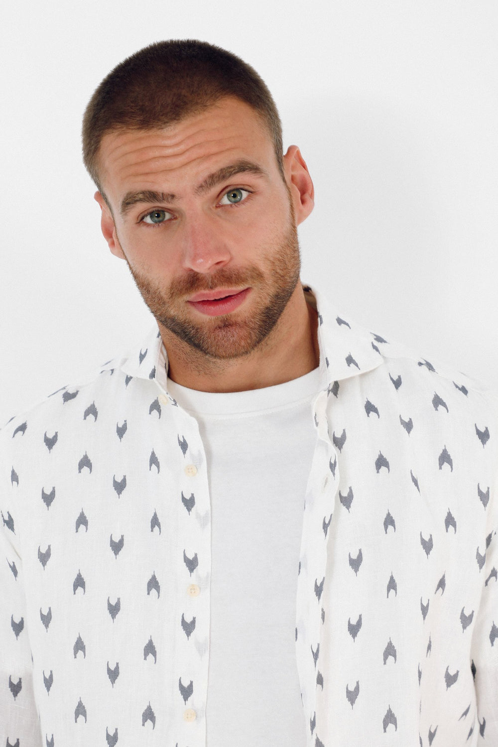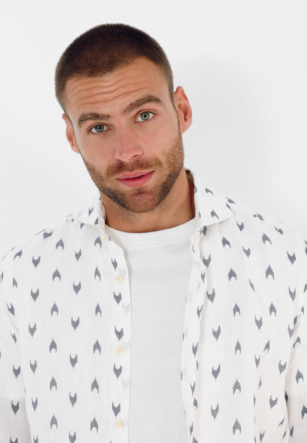 Camisa con estampado confeccionada en tejido 100% lino. Corte Regular Fit, cuello cutaway y cierre con botones. Manga larga terminada en puño.