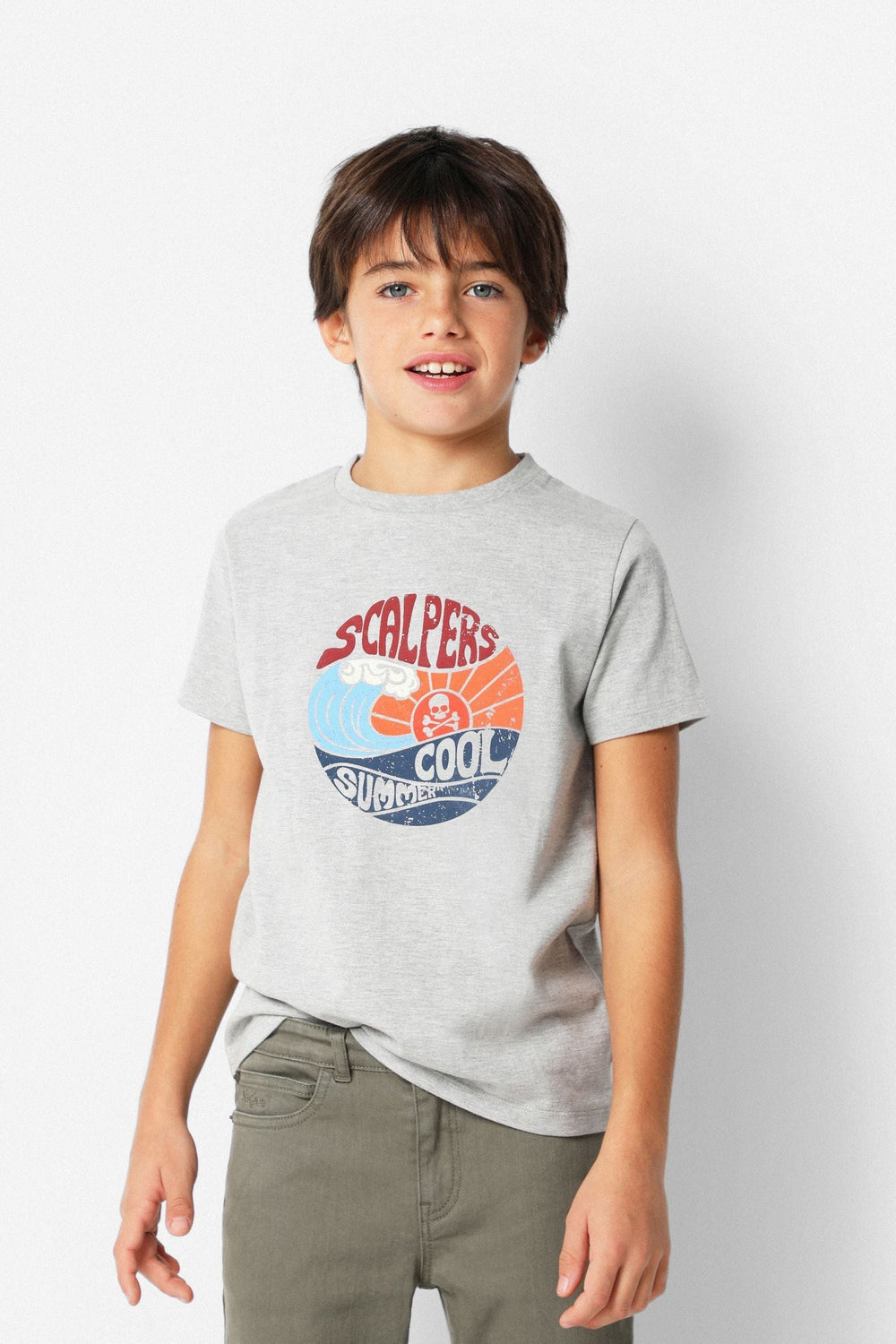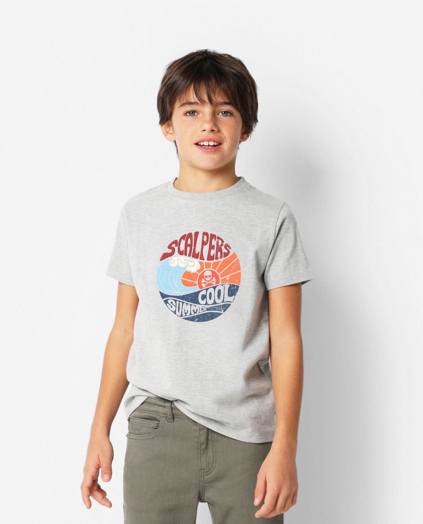 Camiseta con print estival confeccionada en tejido 100% algodón desgastado. Corte Regular Fit, cuello redondo y manga corta.