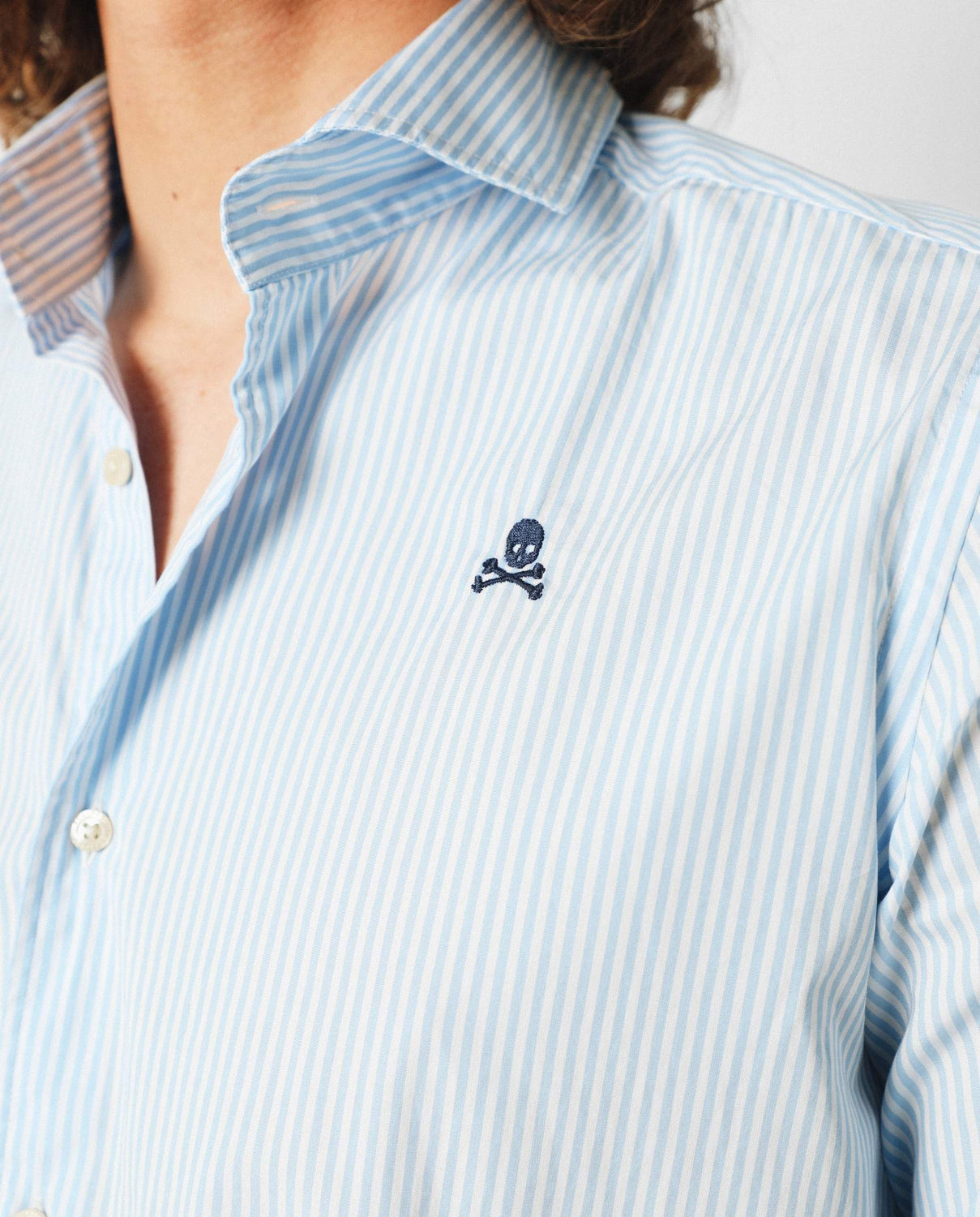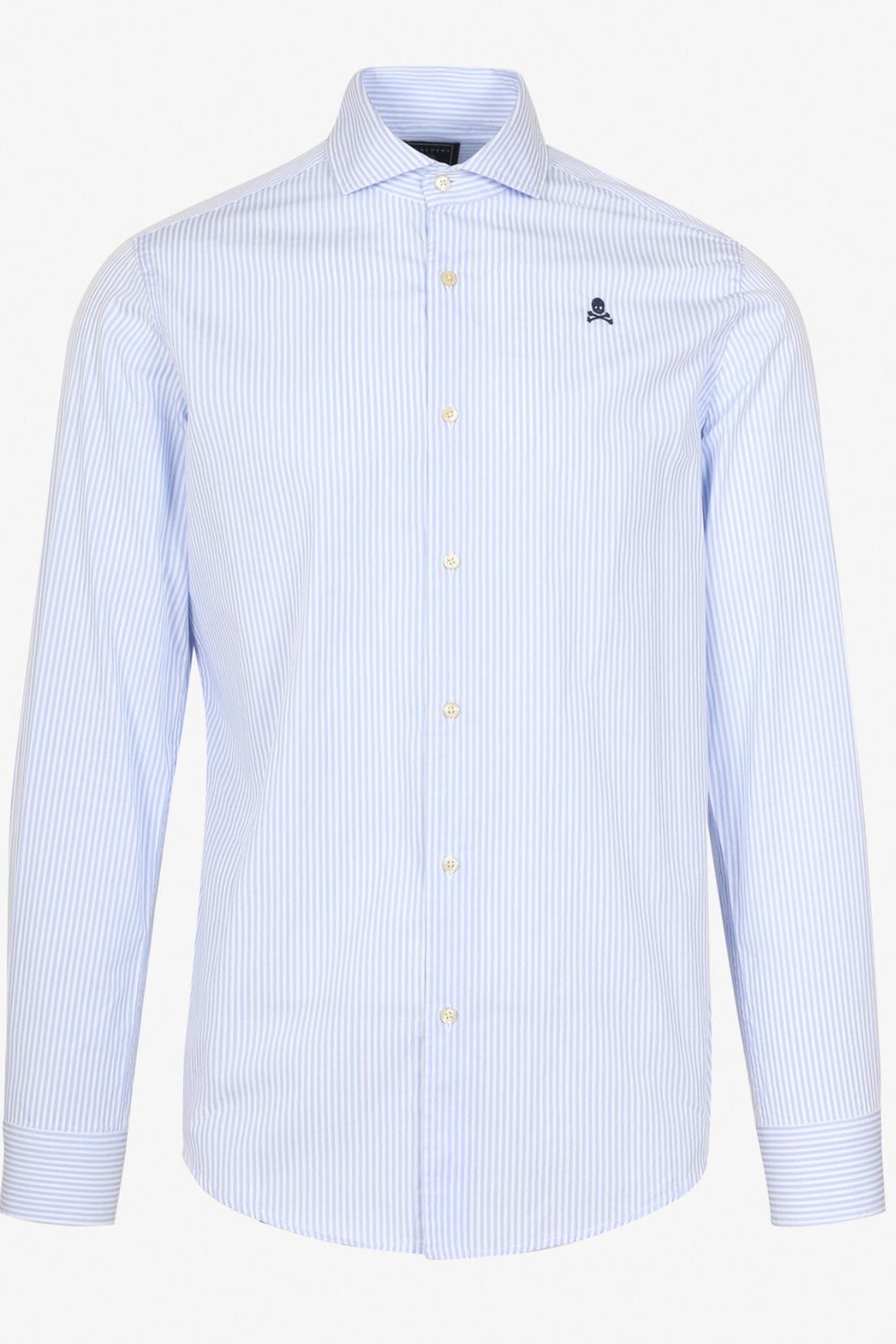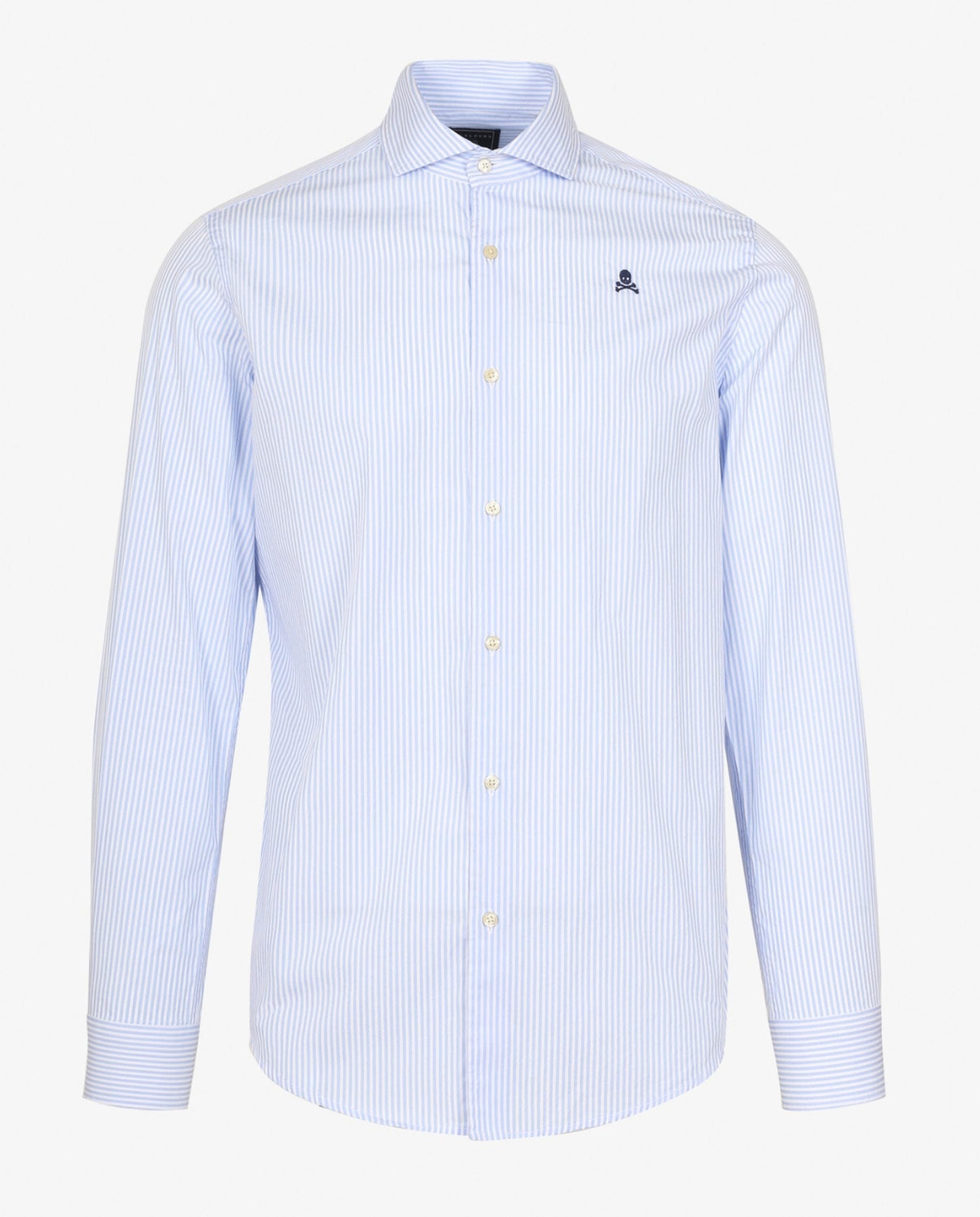 Camisa de rayas confeccionada en tejido 100% algodón. Corte Regular Fit, cuello cutaway y cierre con botones. Manga larga terminada en puño simple y detalle de calavera bordada en el pecho.
