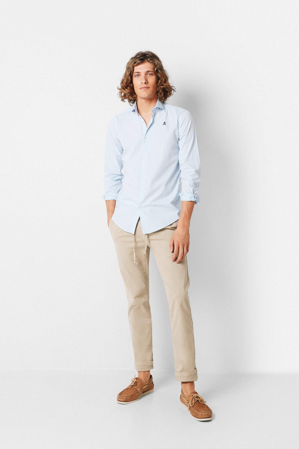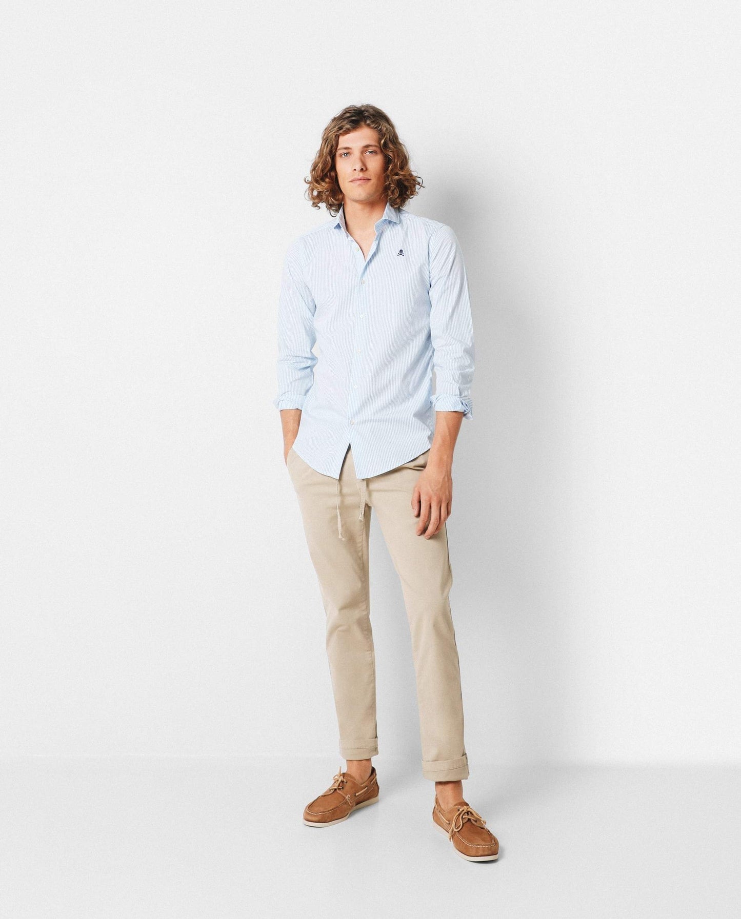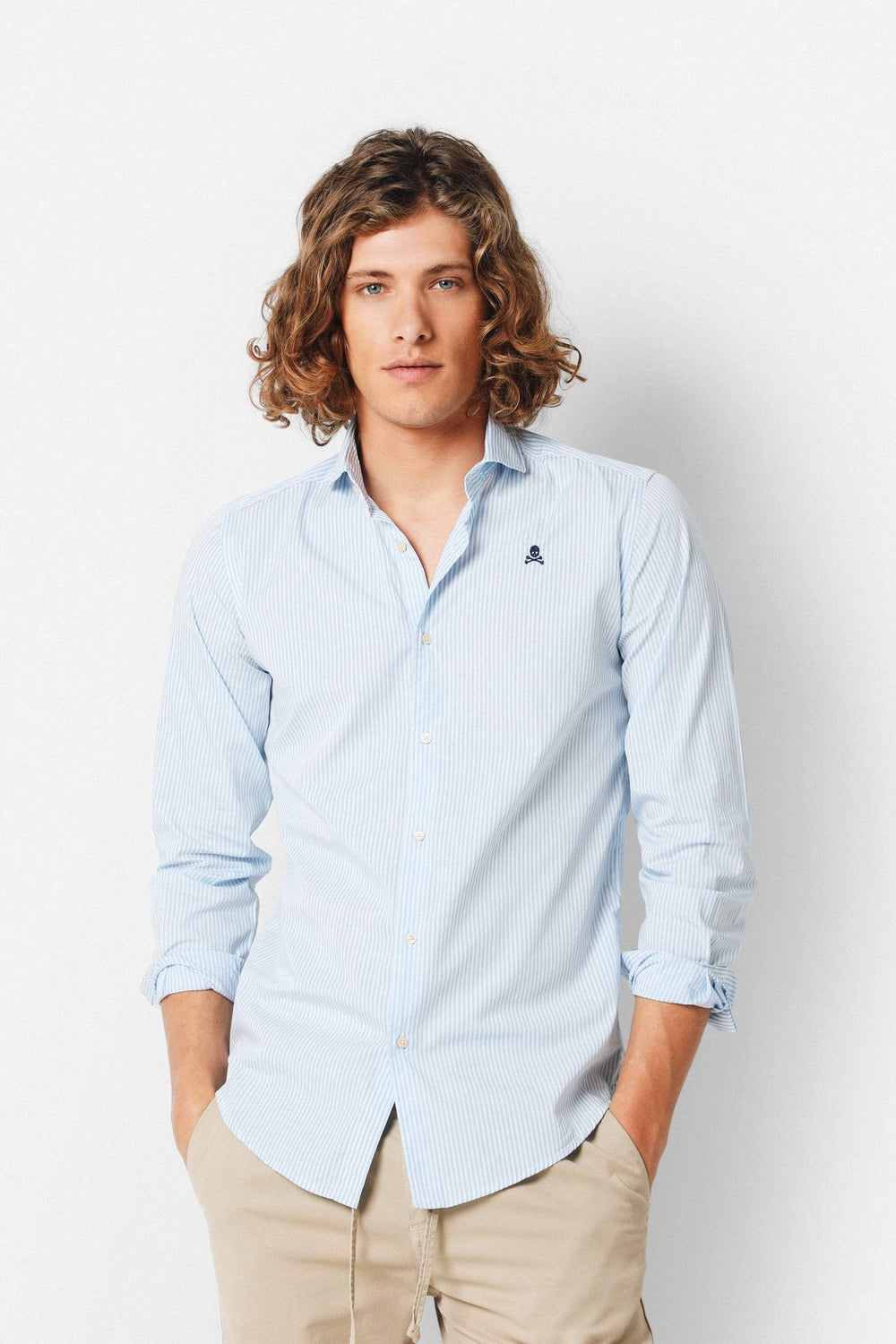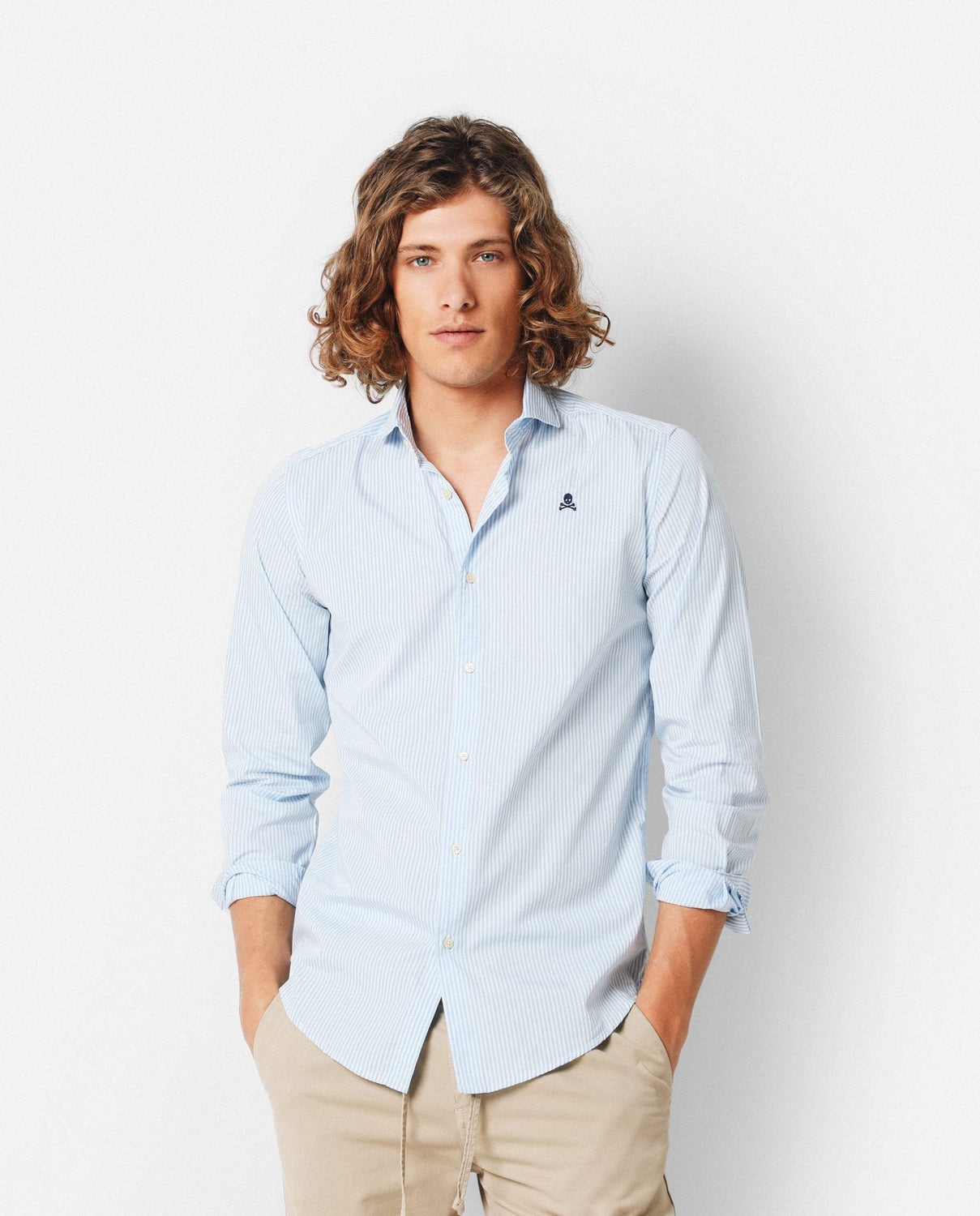 Camisa de rayas confeccionada en tejido 100% algodón. Corte Regular Fit, cuello cutaway y cierre con botones. Manga larga terminada en puño simple y detalle de calavera bordada en el pecho.